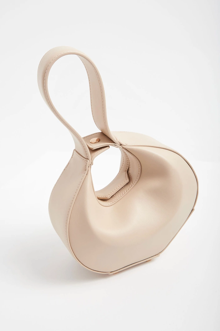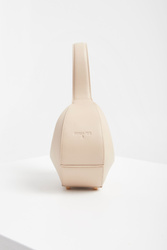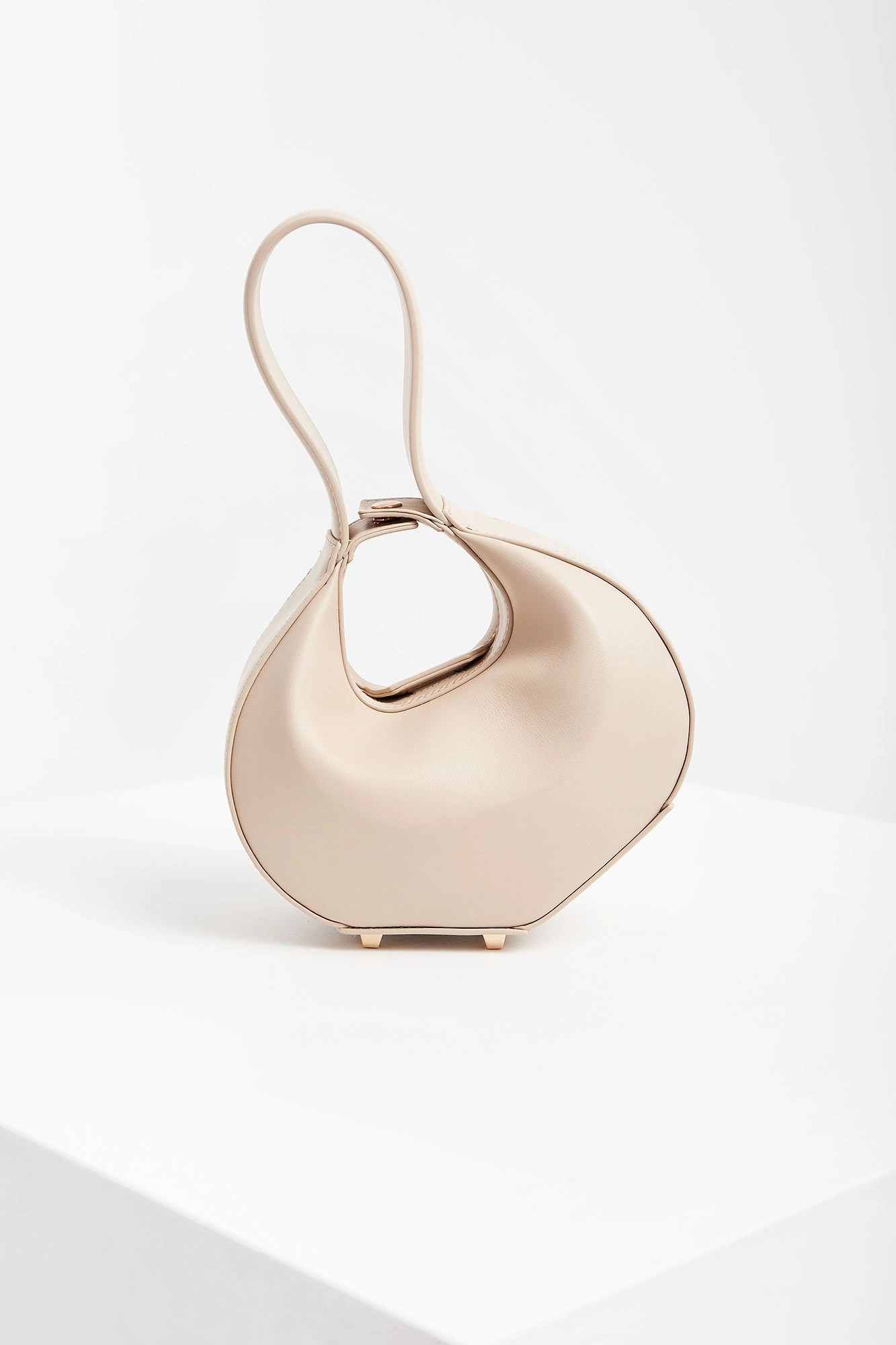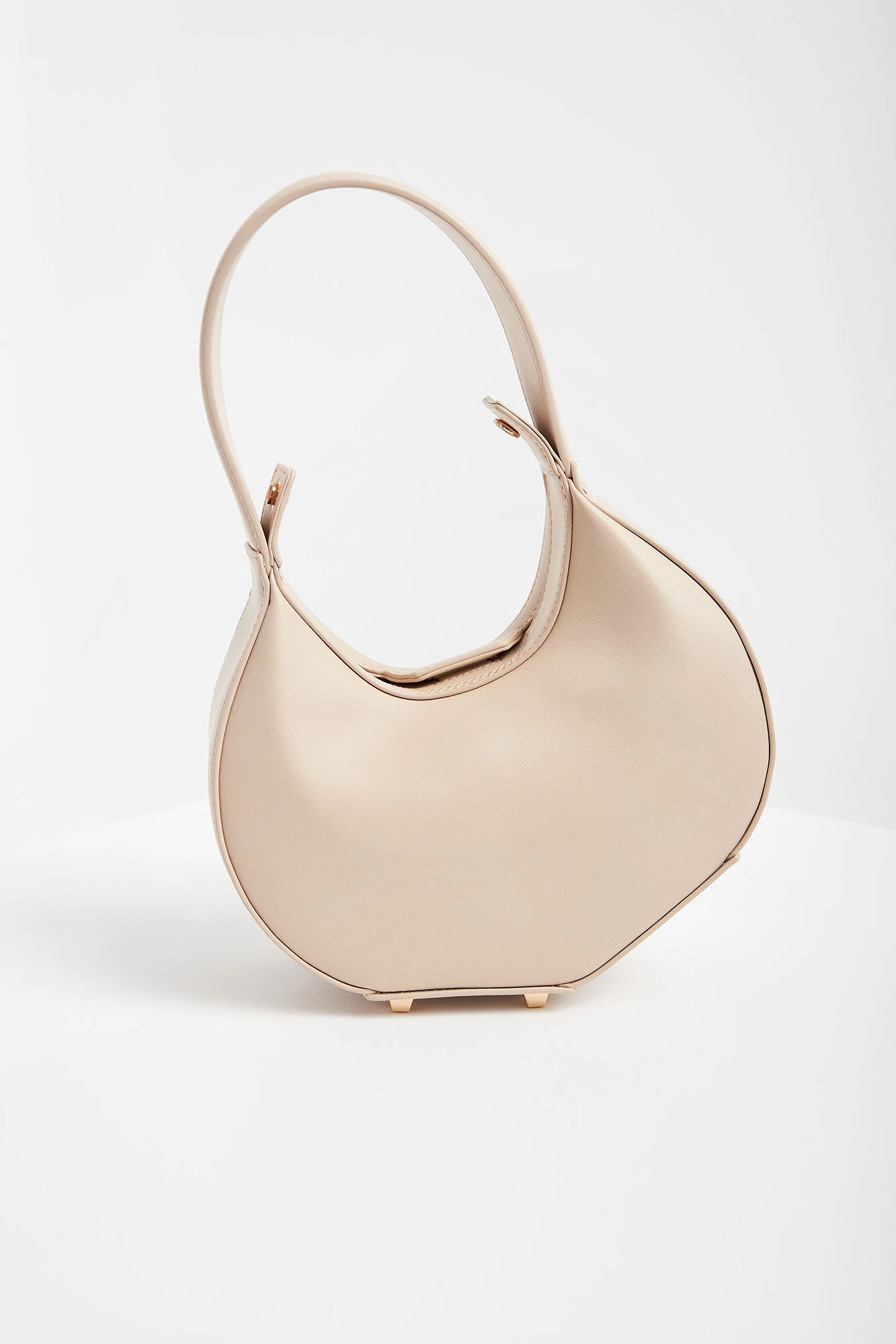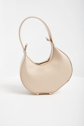 Torebka marki Patrizia Pepe w kremowym kolorze. Typu bangle bag. Z niewielką klapą zapinaną na napę magnetyczną. Możliwość modyfikowania kształtu za pomocą zapięcia z metalową napą. Po boku tłoczona nazwa i logo marki. Na spodzie cztery nóżki ułatwiające stawianie. Wykonana z gładkiej, naturalnej skóry.