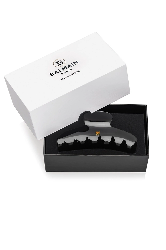 Klamra do włosów marki Balmain Paris Hair Couture w czarnym kolorze. Ręcznie wykonany dodatek do włosów z pozłacanym 14-karatowym złotem logotypem. Klamerka pochodzi z kultowej kolekcji Les Accessoires, doskonała na każdą okazję, natychmiast dodaje szyku i klasy każdej stylizacji.