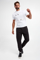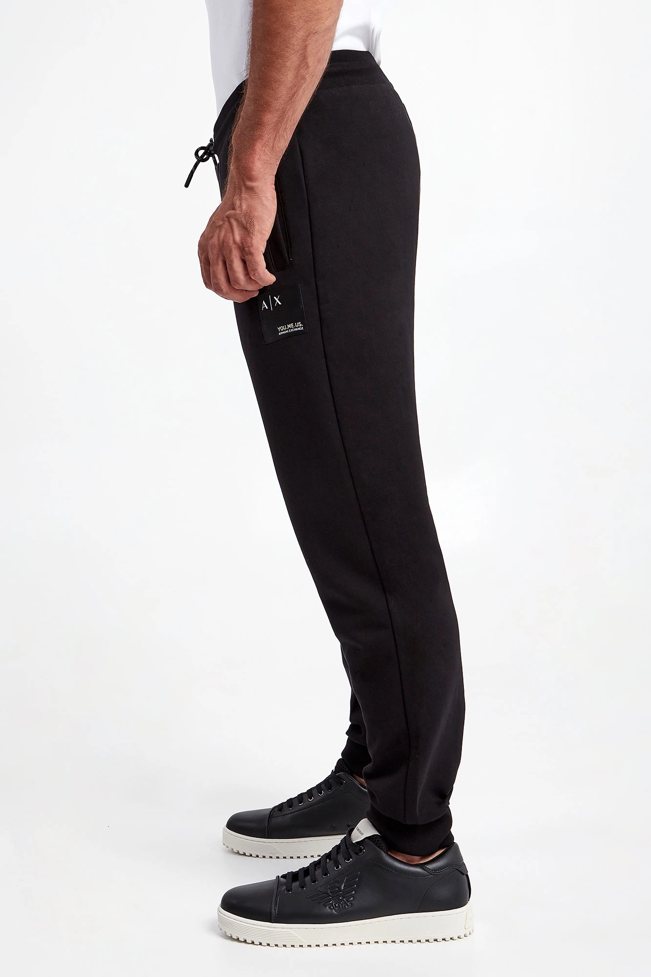 Spodnie dresowe marki Armani Exchange w czarnym kolorze. Fason typu jogger. W pasie ściągacz regulowany za pomocą dwukolorowych troczków z sygnowanymi stoperami. Na nogawce Naszywka z białym logo. Model z trzema wpuszczanymi kieszeniami. Nogawki zakończone ściągaczami. Wykonane z czystej bawełny organicznej.