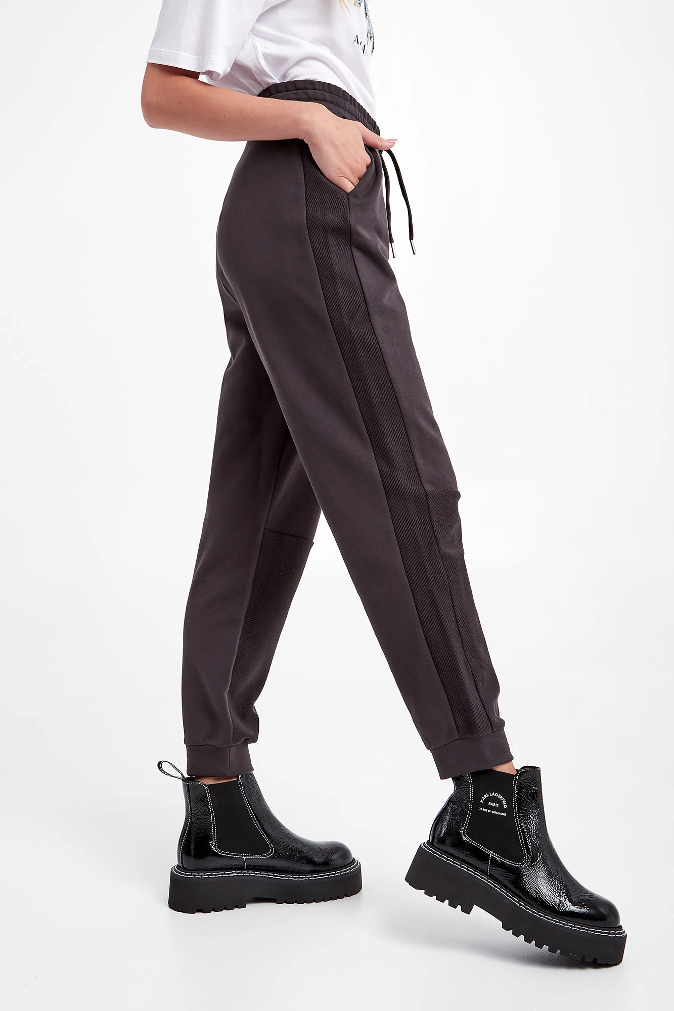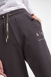 Spodnie marki Armani Exchange w kolorze grafitowym. Model z serii Armani Sustainability Project, która wspiera zrównoważoną modę. Fason typu jogger. Na przodzie nadruk w postaci logo marki w białym kolorze. Szerokie lampasy i dolna część nogawek wykończone materiałem o plecionej fakturze. Nogawki i pas zakończone ściągaczem. W pasie dodatkowo sygnowane troczki, umożliwiające regulację. Model z dwiema kieszeniami z przodu. Spodnie wykonane ze stuprocentowej bawełny.