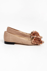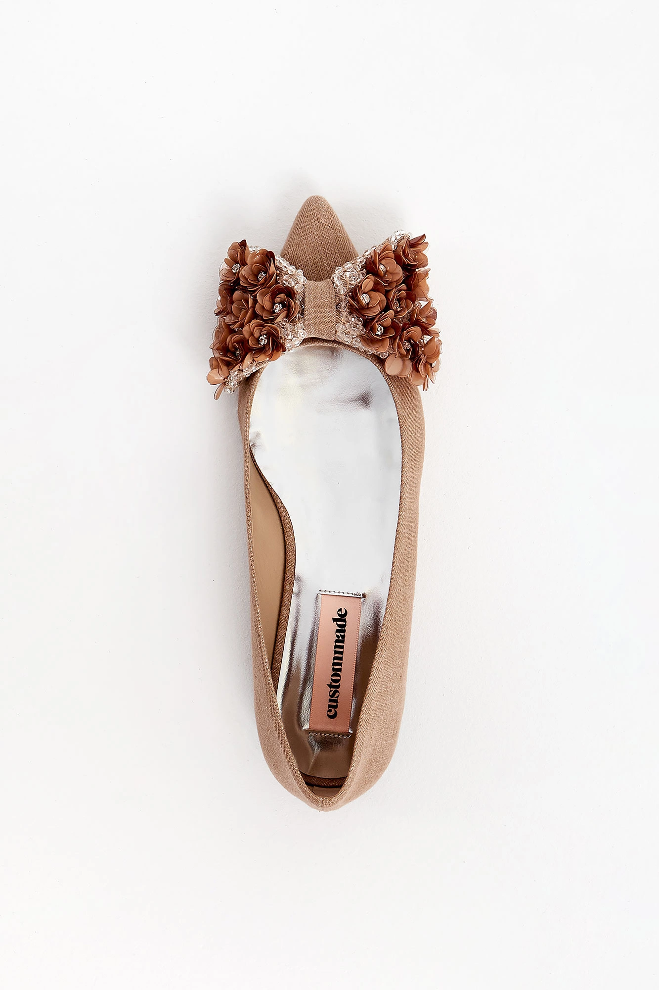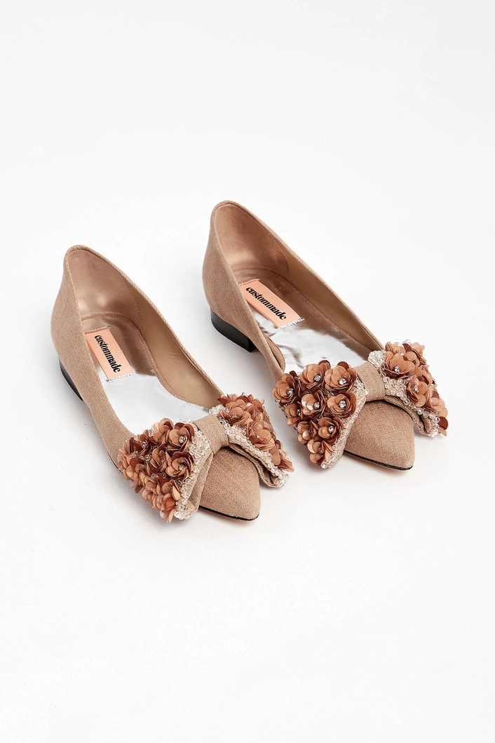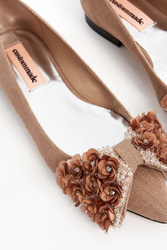 Szpilki marki Custommade w kolorze beżowym. Na płaskim obcasie. Nosek w czubek. Z przodu duża kokarda wykończona ozdobnymi kryształkami i kwiatami. Wierzch materiałowy, wnętrze oraz spód skórzane.