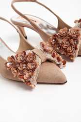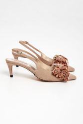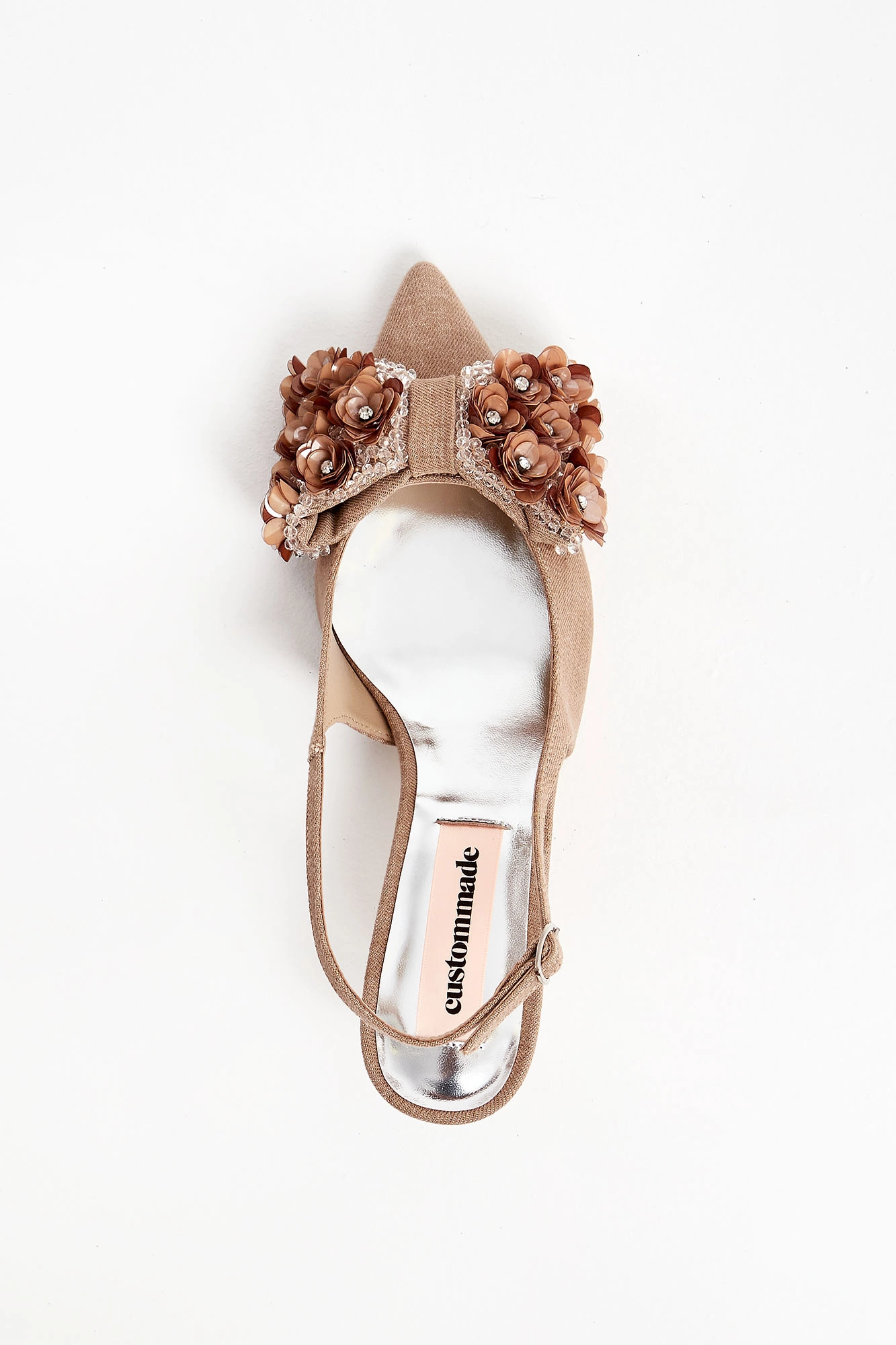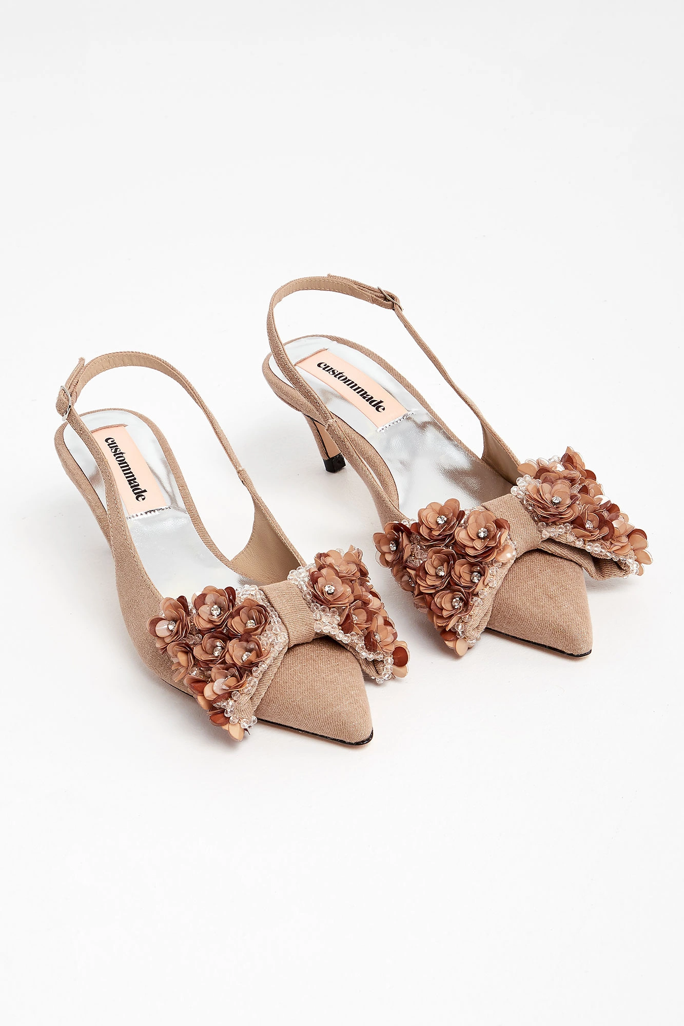 Szpilki marki Custommade w kolorze beżowym. Nosek w czubek. Zapinane na kostce za pomocą cienkiego, regulowanego paska z klamrą. Z przodu duża kokarda wykończona ozdobnymi kryształkami i kwiatami. Wierzch materiałowy, wnętrze oraz spód skórzane.