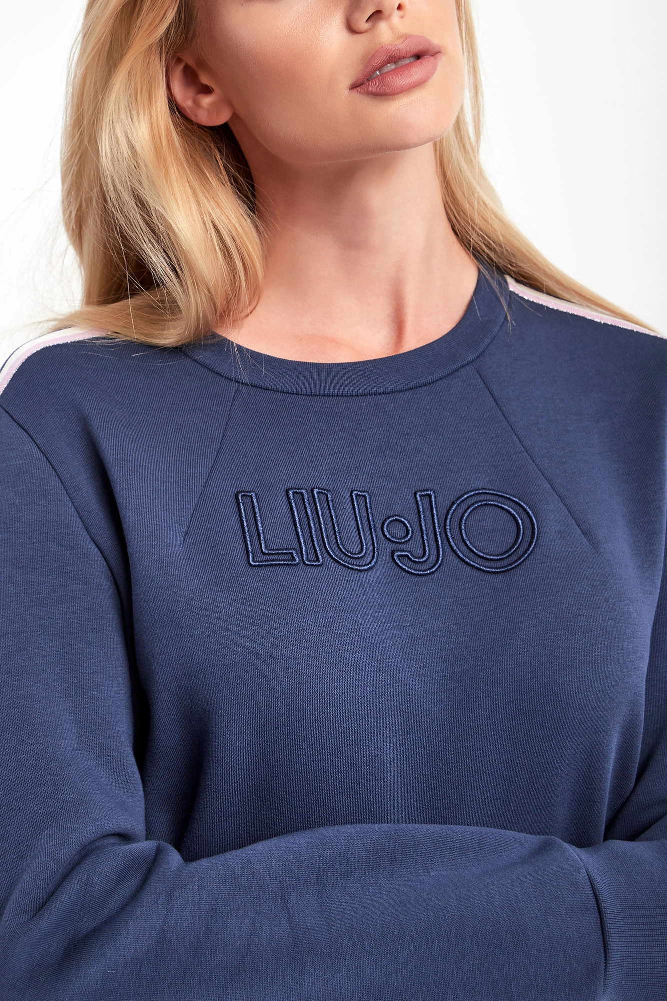Dzianinowa sukienka marki Liu Jo w kolorze granatowym. Fason typu regular, o długości midi. Na froncie haft w postaci logo marki. Po bokach dwie, wpuszczane kieszenie. Na ramionach pasiaste lampasy. Długie rękawy i dół zakończone elastycznym ściągaczem. Sukienka ocieplana od spodu.