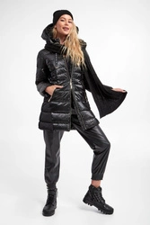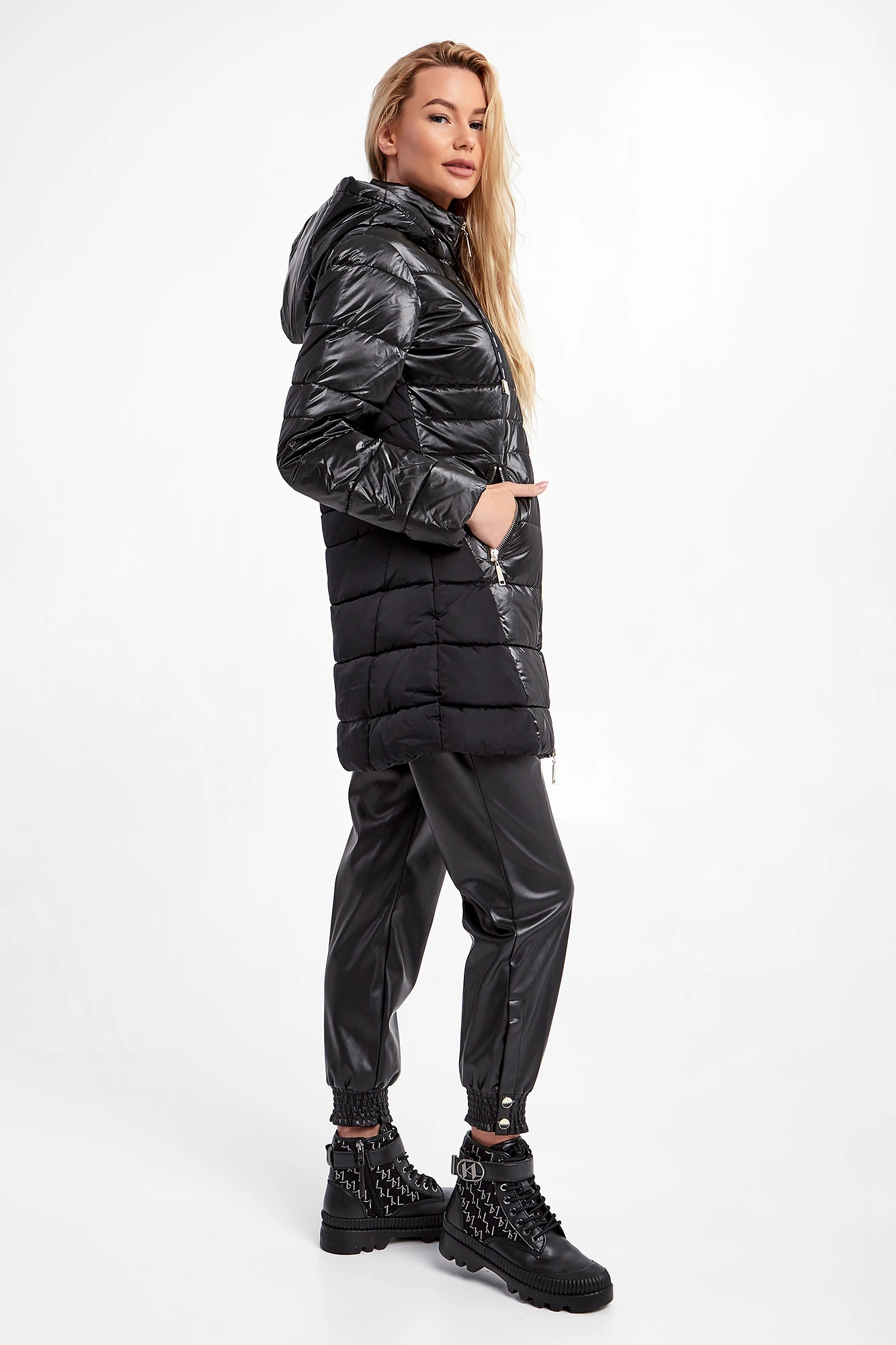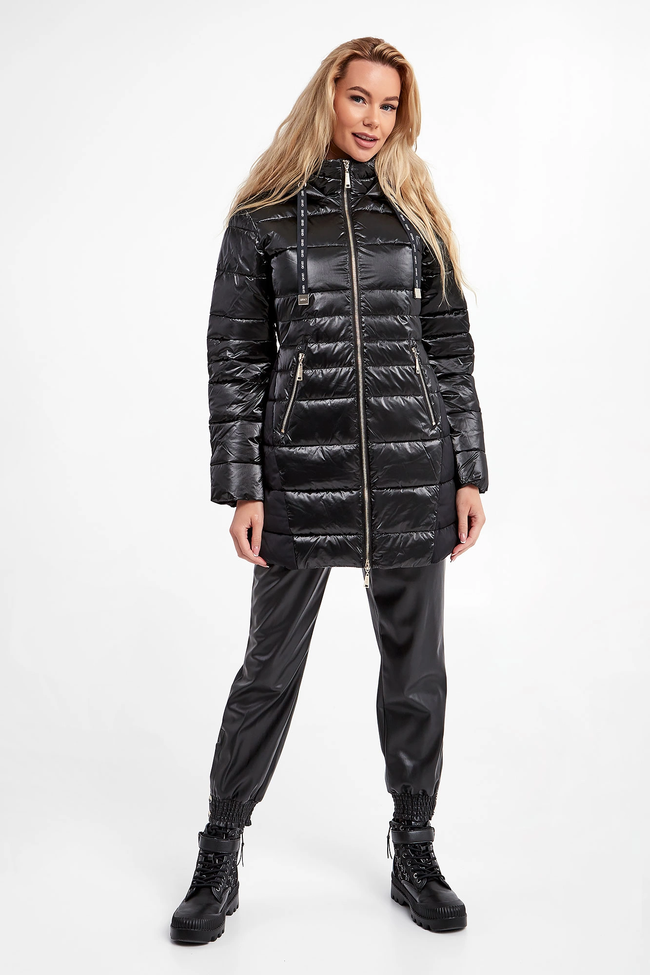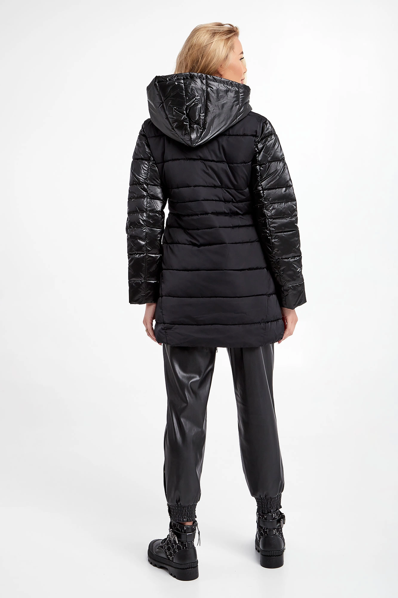 Kurtka marki Liu Jo w kolorze czarnym. Fason typu regular fit. Na całości poziome pikowania. Wykonana z połączenia materiału matowego i metalicznego. Model z kapturem wyposażonym w troczki do regulacji. Kurtka i dwie kieszenie z przodu zapinane na złoty zamek z sygnowaniem. Ciepła i komfortowa.