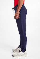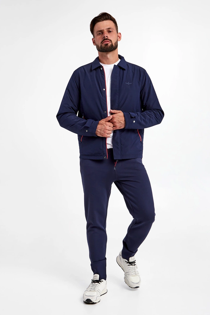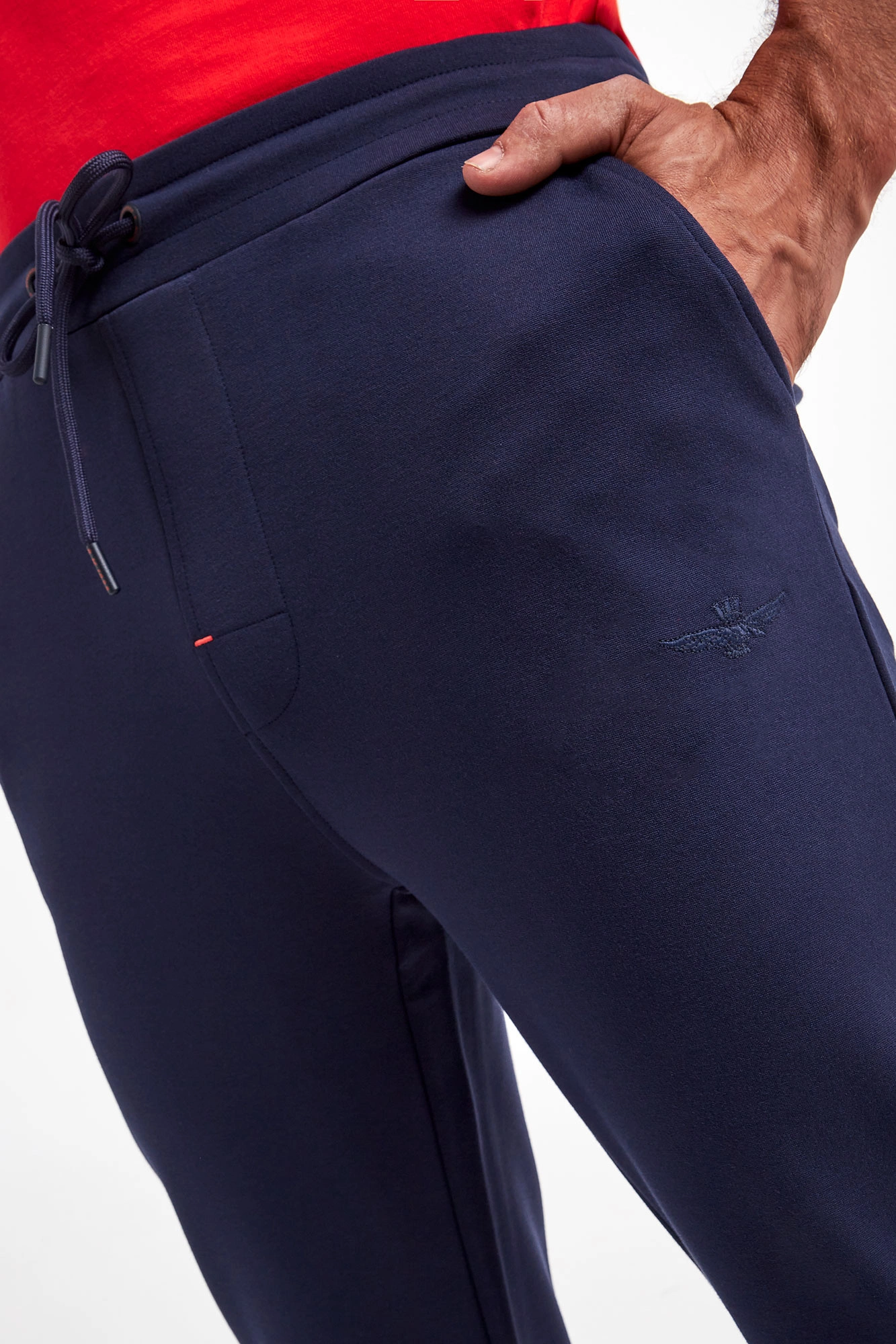 Spodnie dresowe marki Aeronautica Militare w kolorze granatowym. Fason typu regular fit. Na froncie nieduży haft w postaci logo marki oraz dwie wpuszczane kieszenie. Z tyłu imitacje kieszeni. Pas ze ściągaczem i troczkami do dodatkowej regulacji. Wykonane z tkaniny wiskozowej.