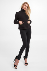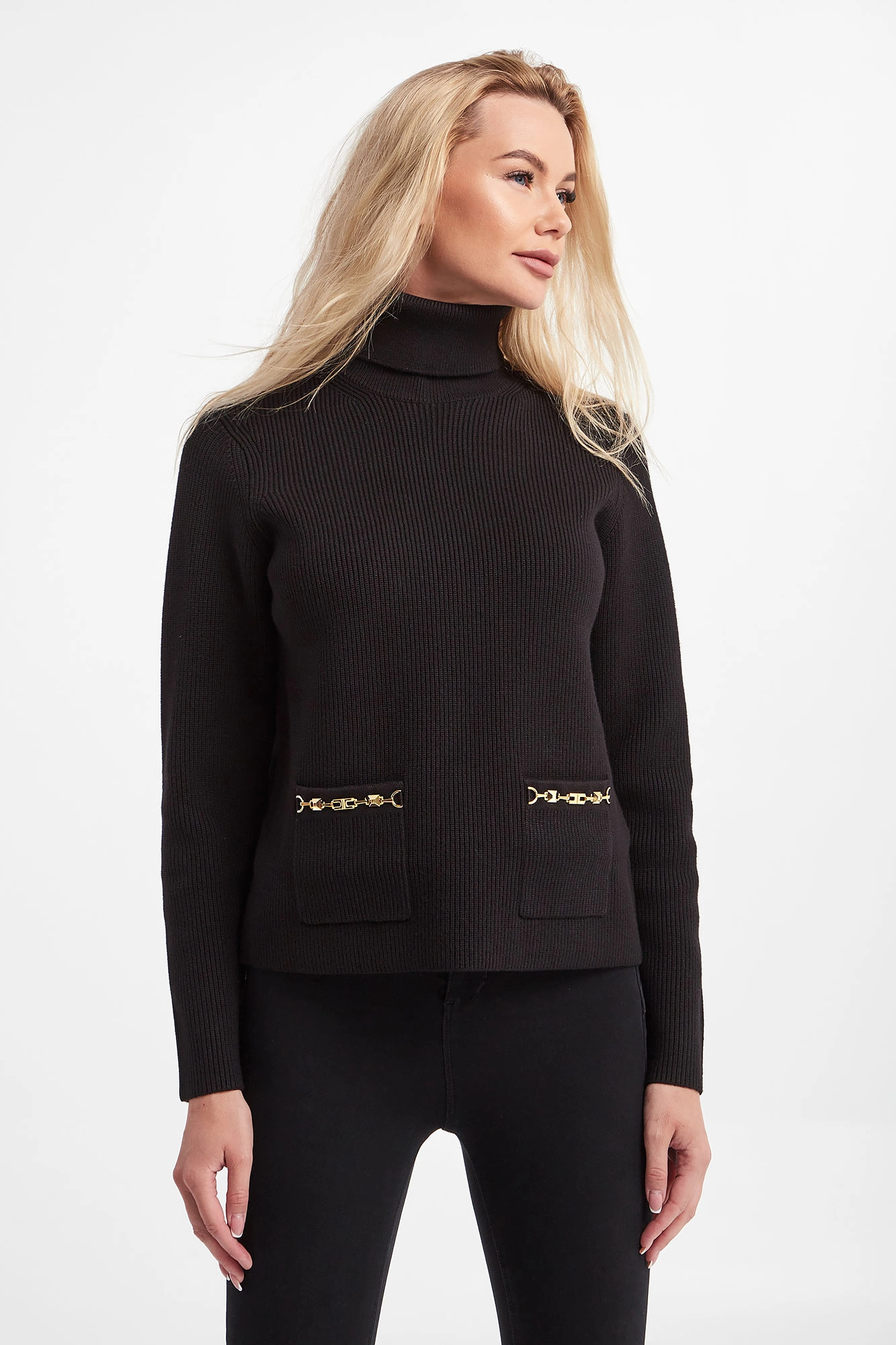 Czarny golf marki Elisabetta Franchi. Na całości prążki. Dekolt wywijany. Długie rękawy. Dwie boczne, naszywane kieszenie ozdobione złotymi aplikacjami w kształcie wędzidła i z monogramami marki. Fason regular fit. Wykonany z bardzo miękkiej, wiskozowej, elastycznej tkaniny.