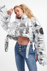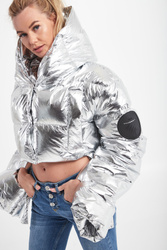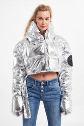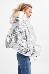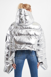 Puchowa kurtka z kapturem marki MMC Studio w srebrnym kolorze. Na całości pikowana. Fason typu oversize, krój typu cropped. Zapinana za pomocą krytych nap. Na rękawie czarna, gumowana naszywka z tłoczonym logo. U dołu długich rękawów wycięcia na dłonie. Dwie boczne, wpuszczane kieszenie. U dołu ściągacz. Wypełniona naturalnym puchem oraz pierzem.