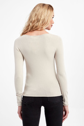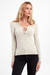 Sweter marki Blugirl Blumarine w kolorze beżowym. Fason typu regular fit. Dekolt w kształt litery V z wiązaniem i złotą literką B. Długie rękawy i dół bezszwowe. Sweter wykonany z delikatnej tkaniny wiskozowej.
