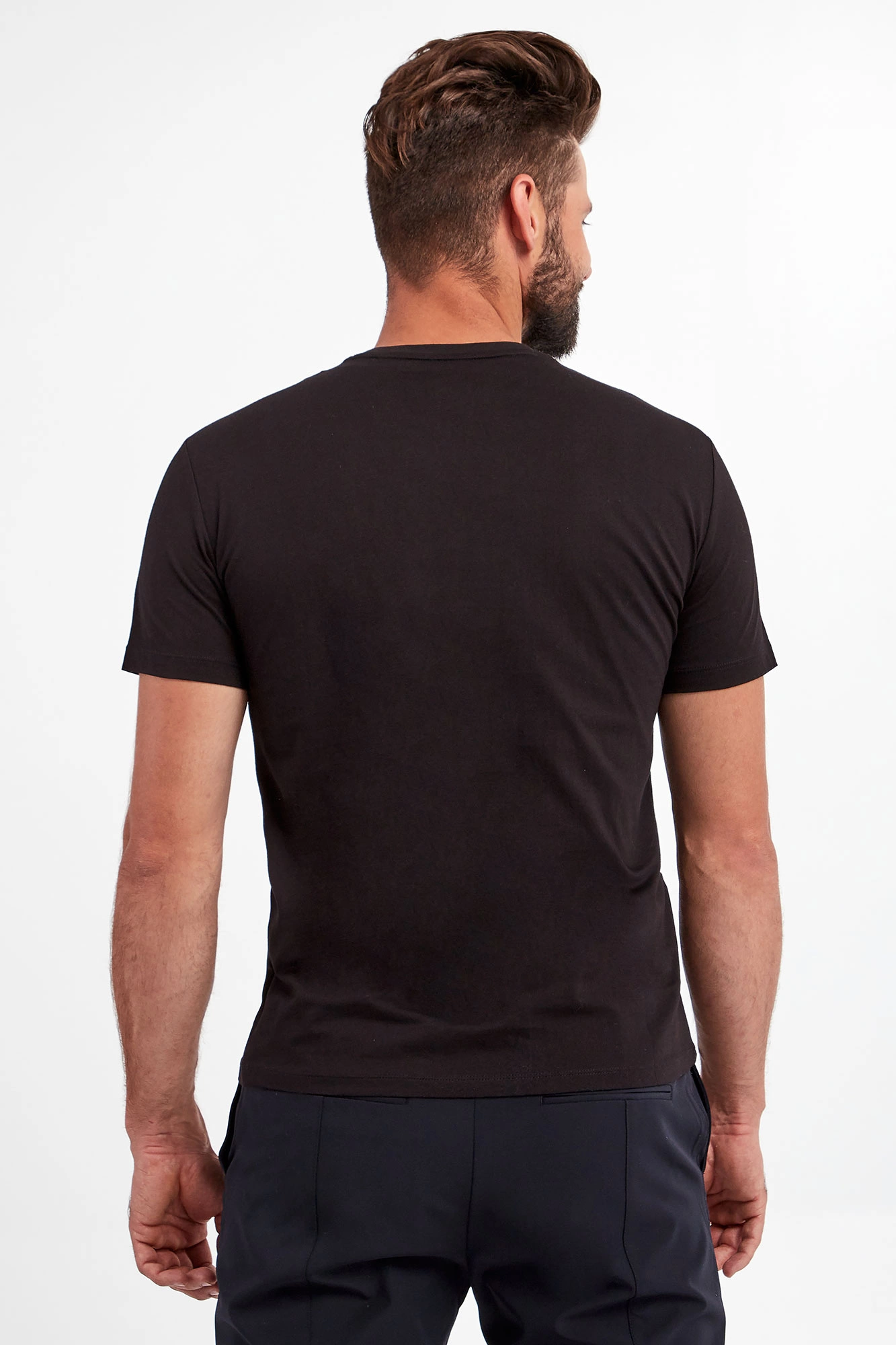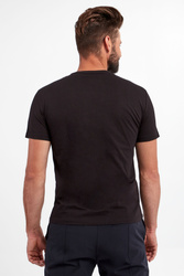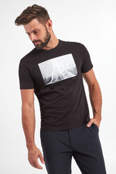 T-shirt marki Armani Exchange w czarnym kolorze. Na froncie biało-czarny nadruk oraz logo. Dekolt typu o-neck zakończony ściągaczem. Krótkie rękawy i dół wykończone lamówką. Fason regular fit. Wykonany ze stuprocentowej bawełny.