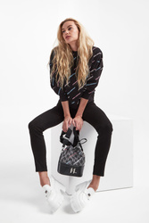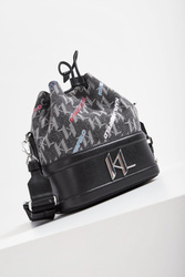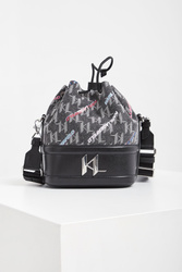 Torebka marki Karl Lagerfeld w szarym kolorze. Typu worek. Na całości haftowany monogram marki i wielokolorowy nadruk w postaci nazwy marki. Na górze ściągana za pomocą skórzanych troczków w czarnym kolorze. Dół usztywniany skórą w czarnym kolorze. Na skórze srebrna, metalowa aplikacja w postaci monogramu marki. Do noszenia na sygnowanym, regulowanym, materiałowym pasku ze srebrnymi okuciami.