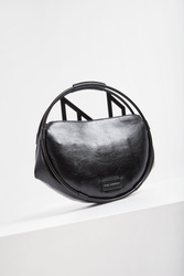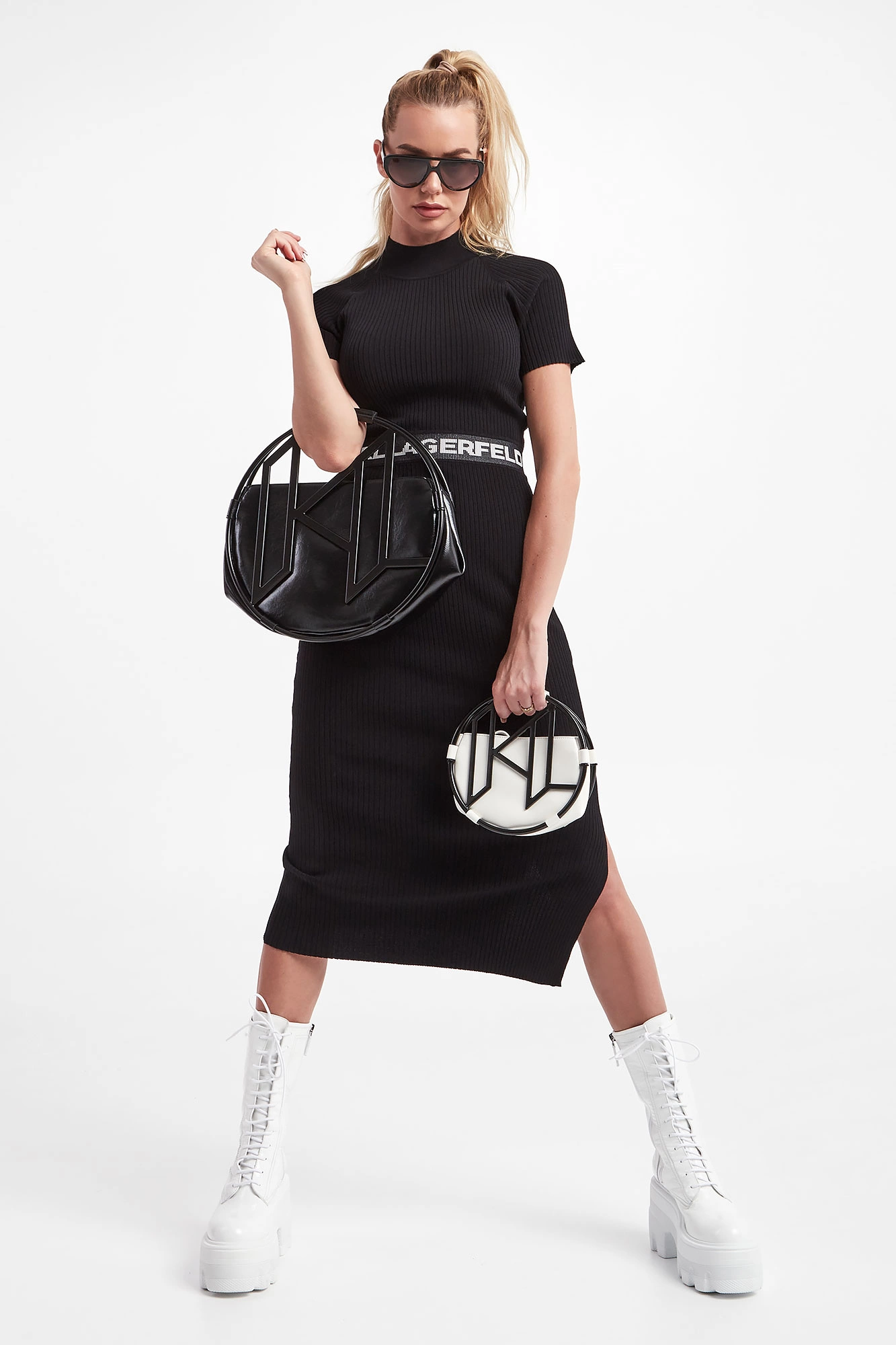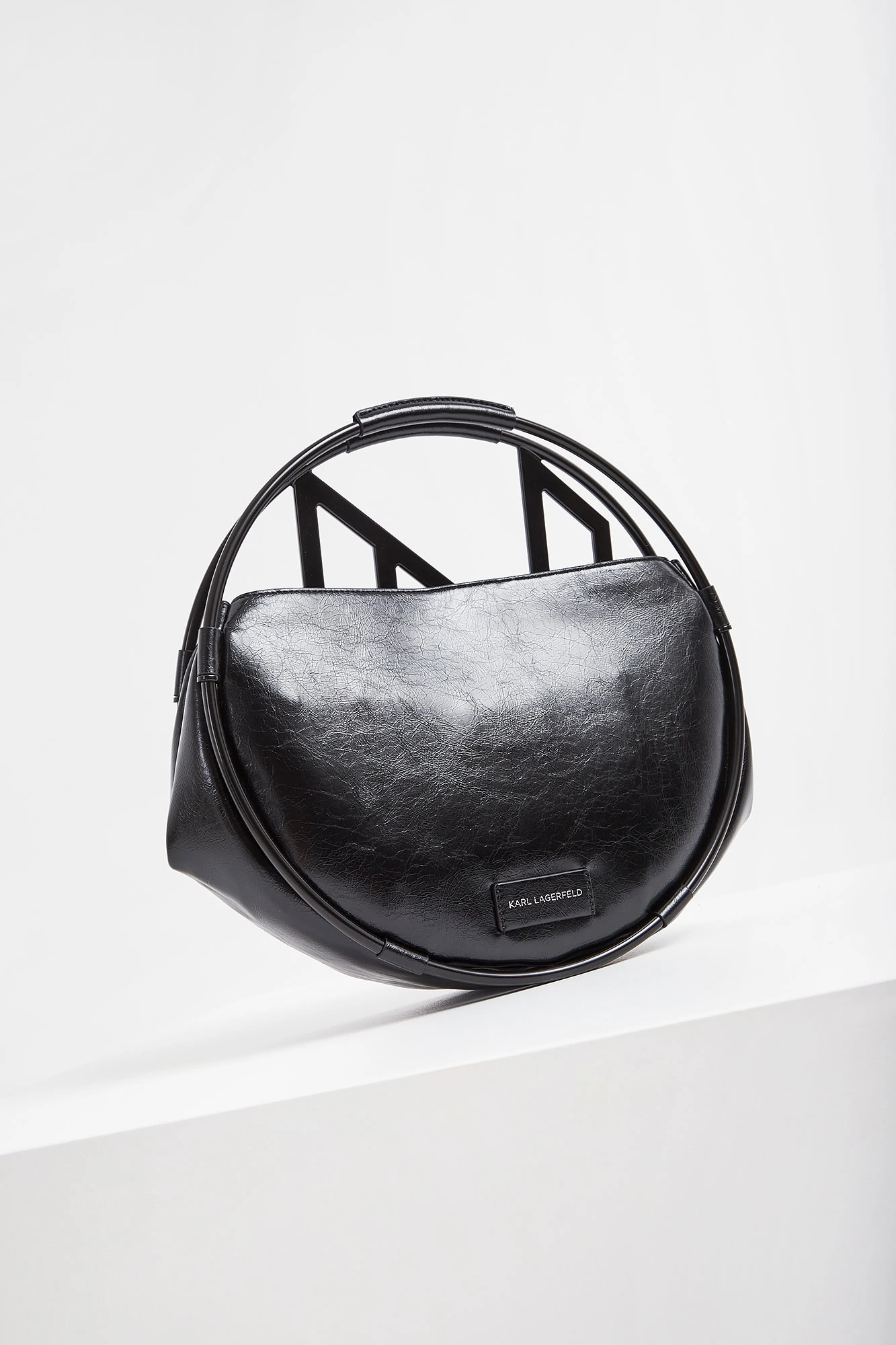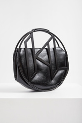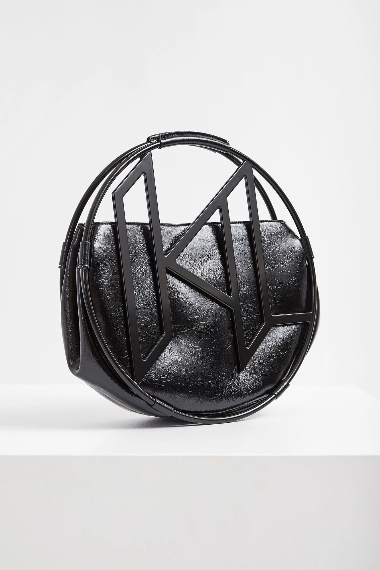 Torebka marki Karl Lagerfeld w czarnym kolorze. Okrągła. Całość wykonana z metalowej konstrukcji z monogramem marki i połyskującej skóry. Zapinana za pomocą napy magnetycznej. Wewnątrz dodatkowa kieszeń. Z tyłu skórzana naszywka z tłoczoną nazwą marki.