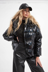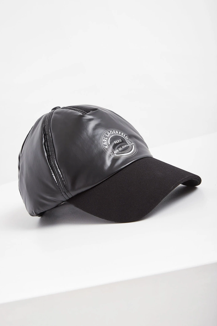 Czapka z daszkiem marki Karl Lagerfel w czarnym kolorze. Połyskująca u góry, Na froncie biały, kontrastujący nadruk z logo. Daszek materiałowy. Regulowana z tyłu za pomocą czarnego zapięcia.