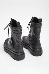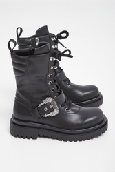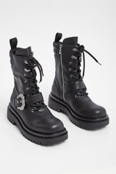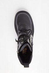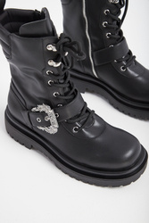 Trapery marki Versace Jeans Couture w czarnym kolorze. Wiązane za pomocą sznurówek i zapinane za pomocą zamka po boku. Na przodzie ozdobny pas zapinany za pomocą metalowej klamry z tłoczoną nazwą marki. Gruba, sygnowana podeszwa. Wszystkie elementy ozdobne w srebrnym kolorze. Buty wykonane ze skóry ekologicznej.