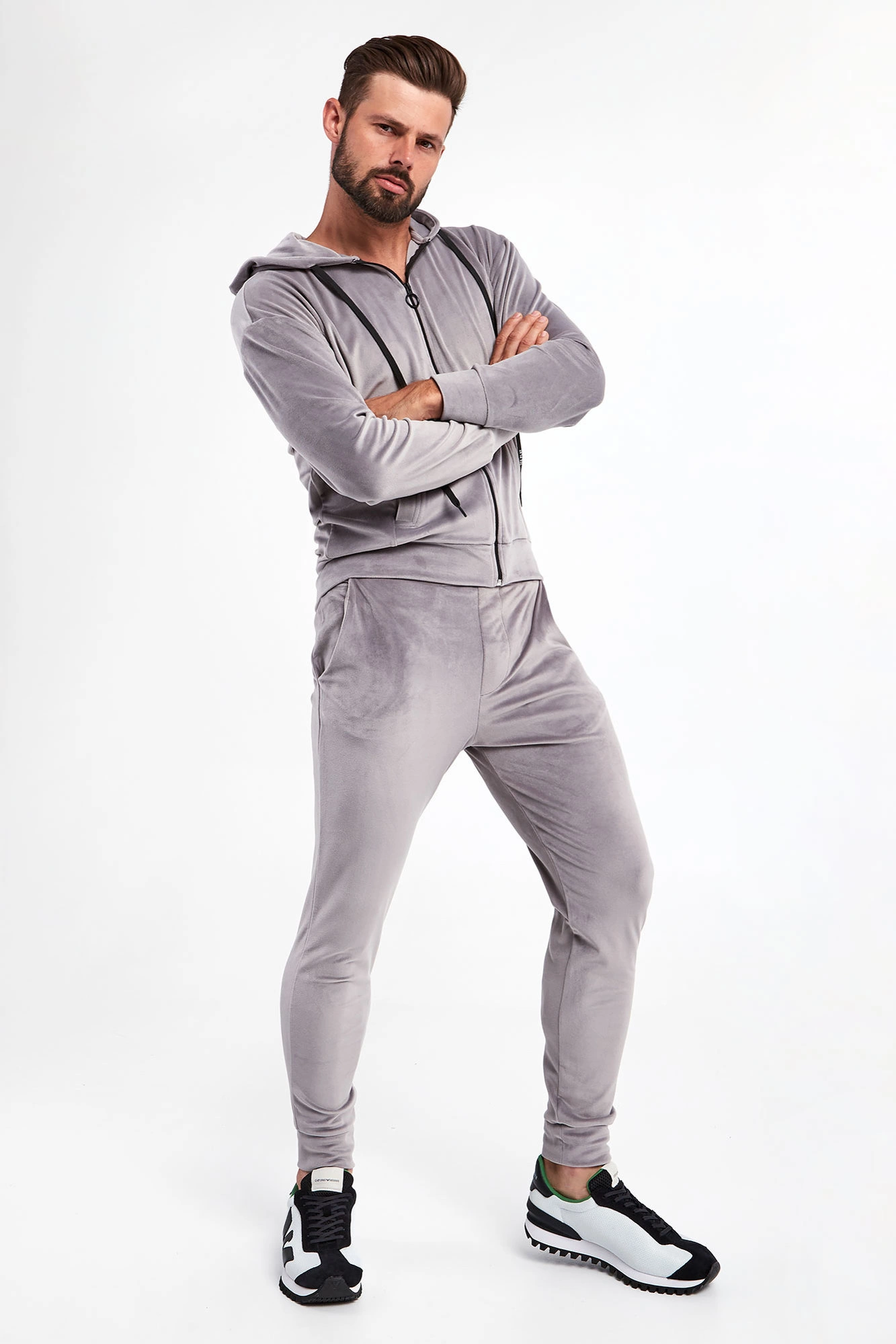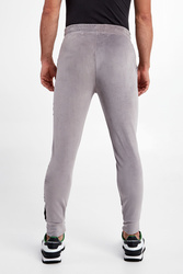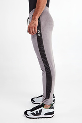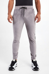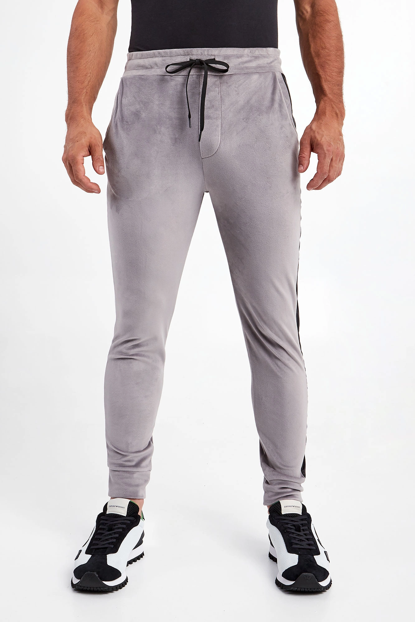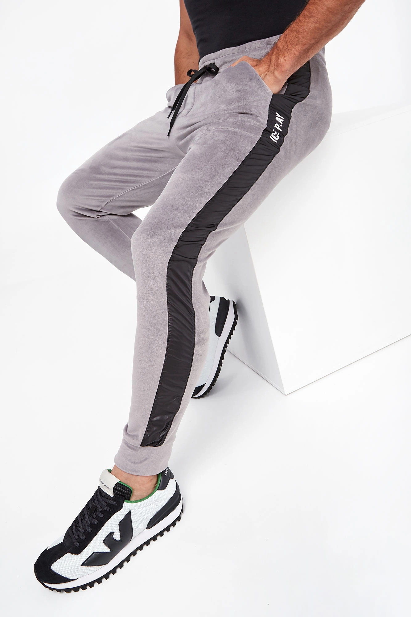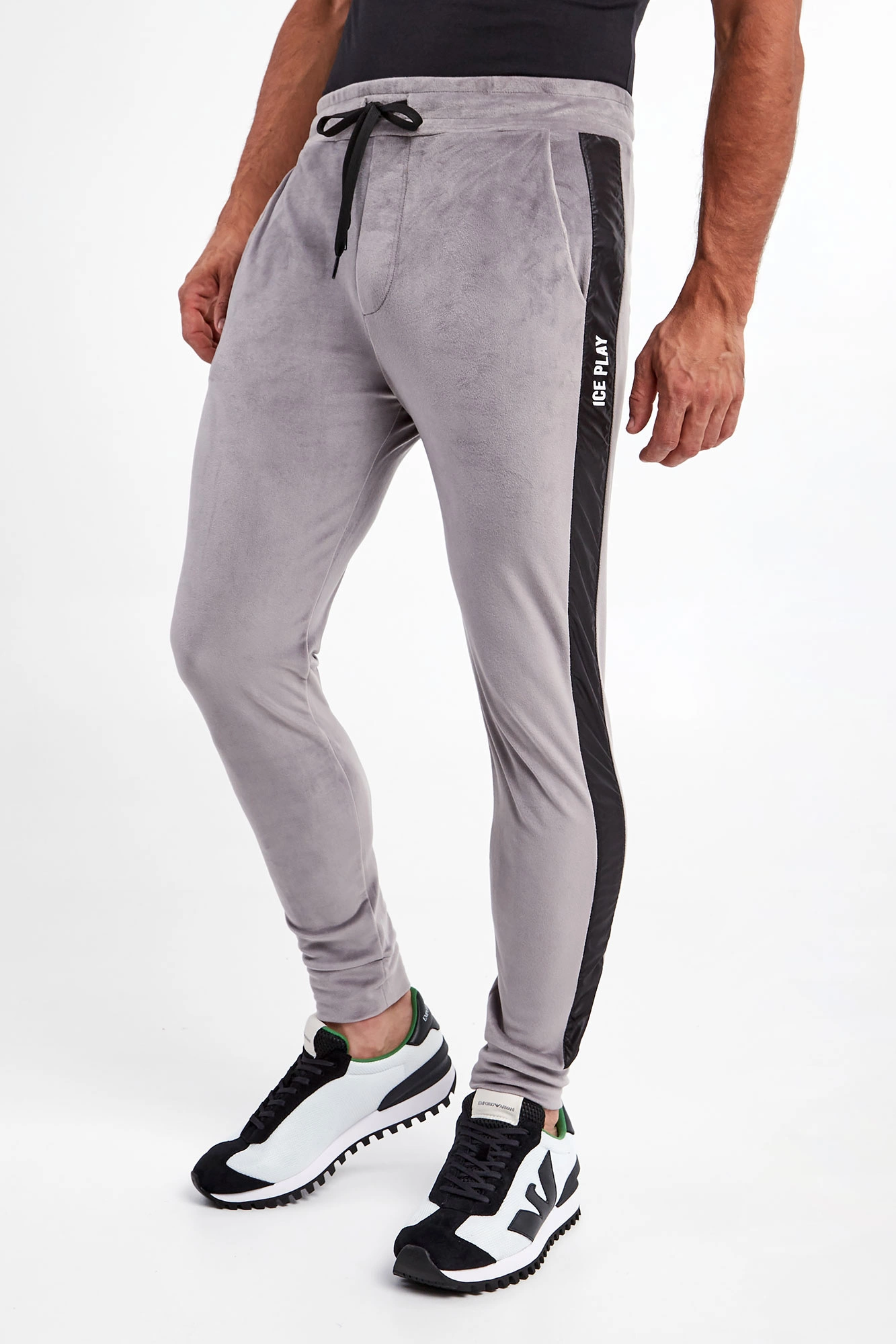 Welurowe spodnie dresowe Ice Play w szarym kolorze. Fason typu jogger. W pasie ściągacz regulowany za pomocą czarnych troczków. Dwie boczne, wpuszczane kieszenie. Po bokach czarne, logowane lampasy z kontrastującej tkaniny. Nogawki zakończone ściągaczami.