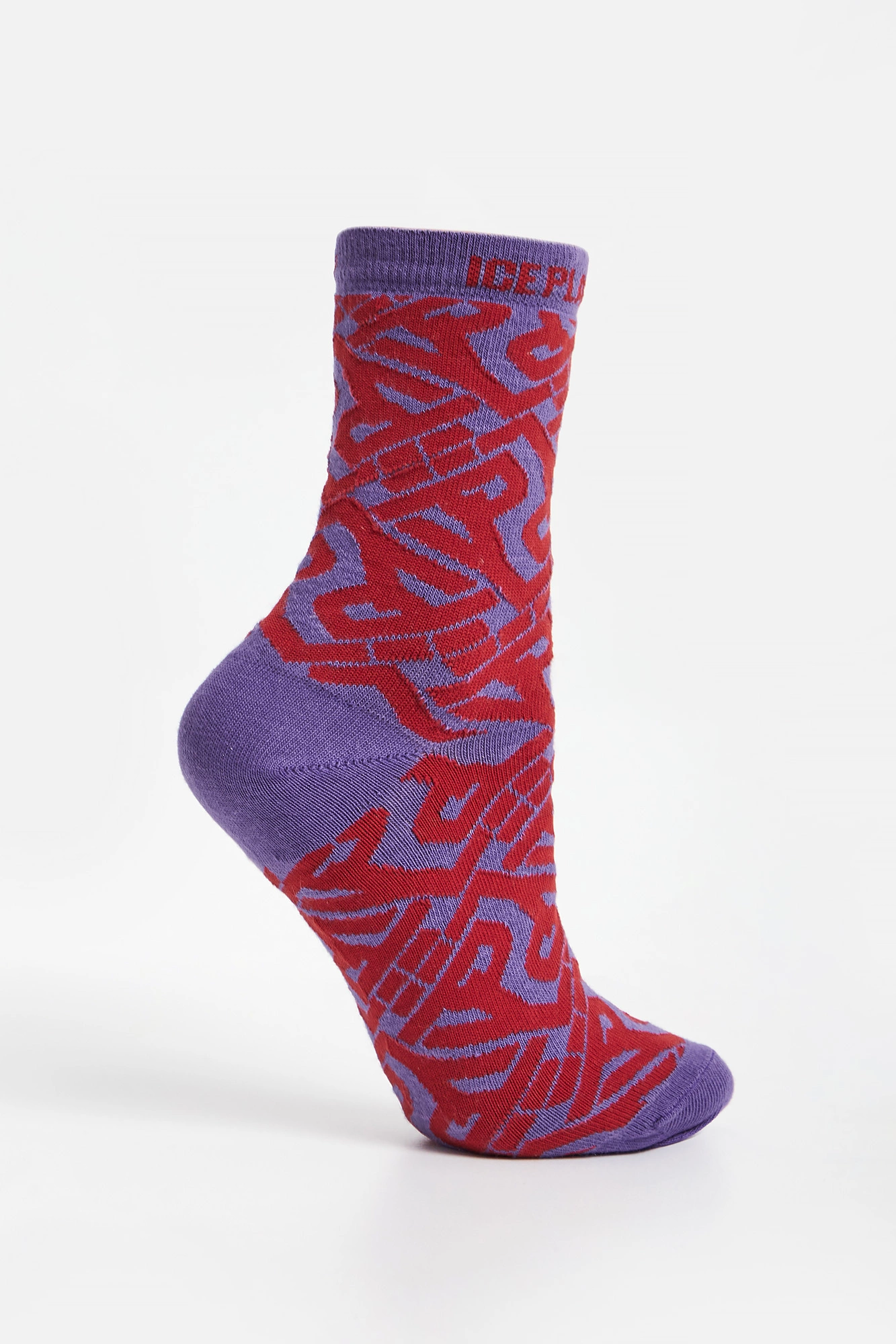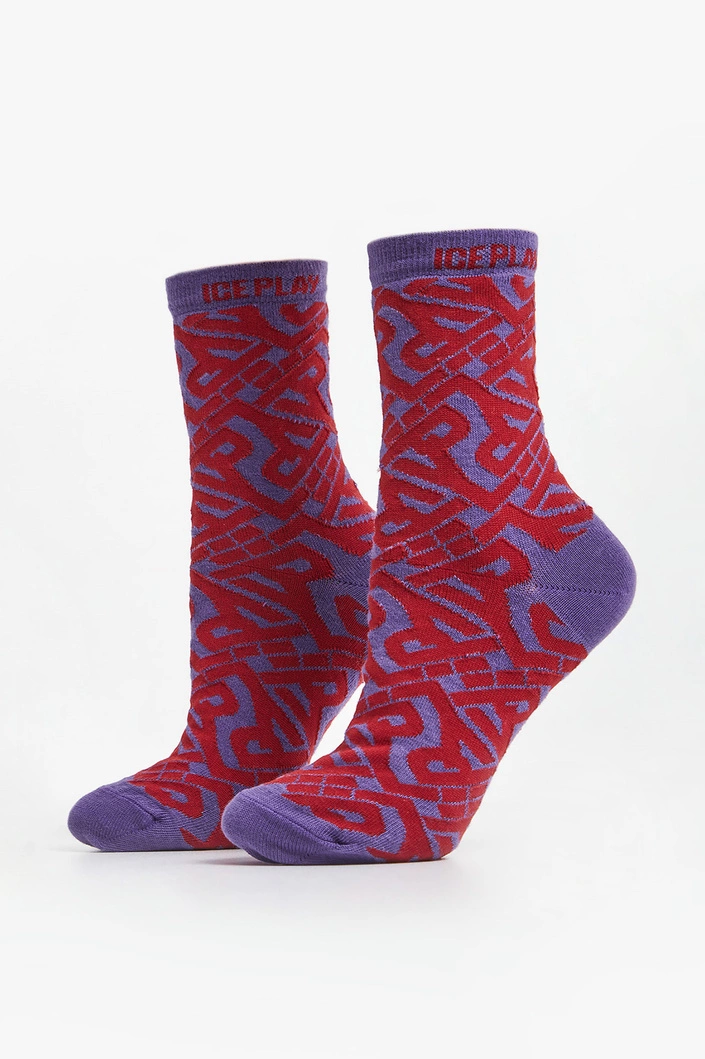 Skarpety marki Ice Play w kolorze fioletowym. Na całości nadruk w postaci multiplikacji logo marki w czerwonym kolorze. Góra wykończona elastycznym ściągaczem z nazwą marki. Skarpetki wykonane z tkaniny w większości bawełnianej.