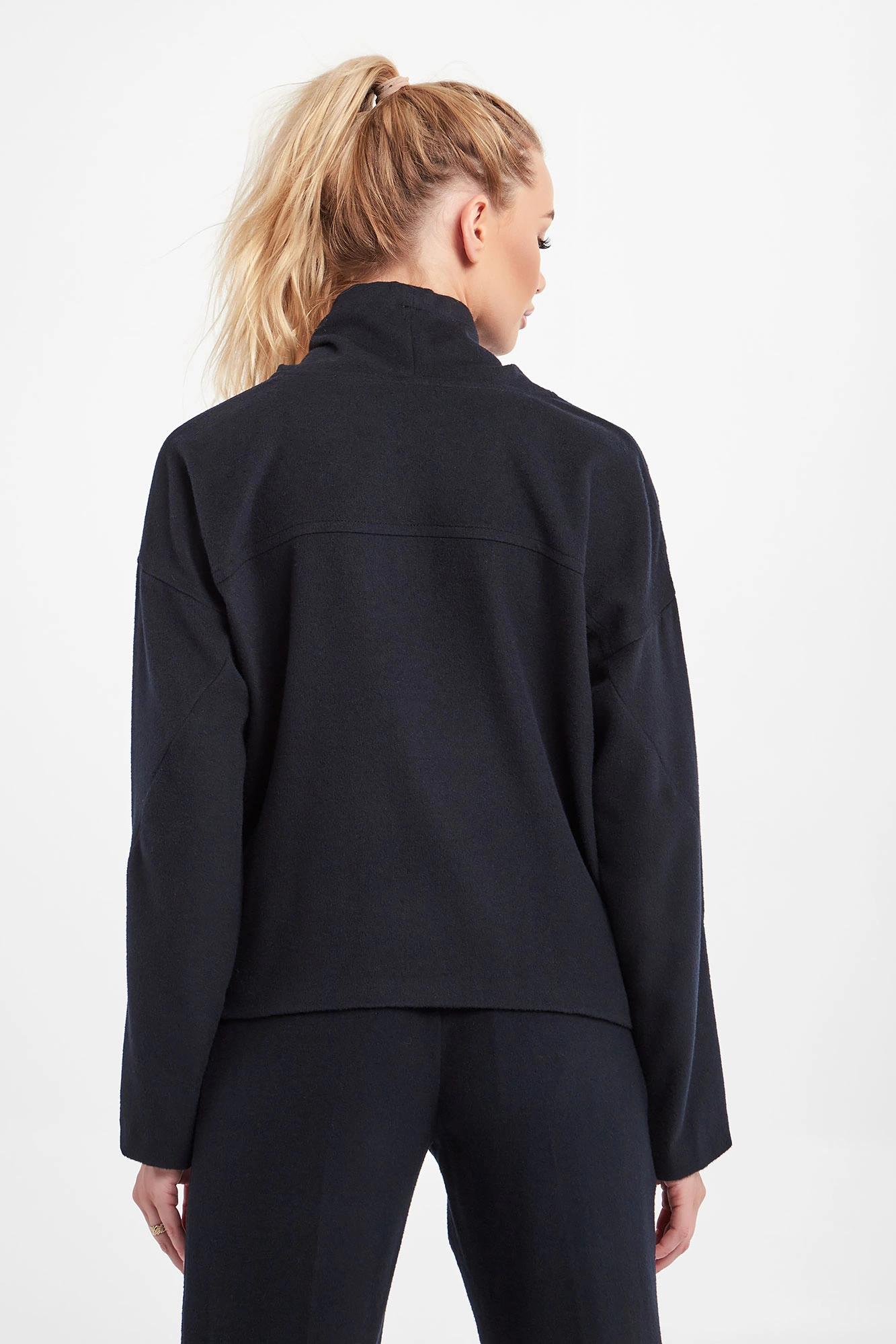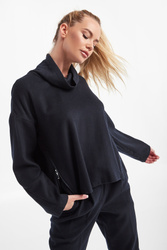 Sweter marki Emporio Armani w kolorze granatowym. Fason typu relaxed, obniżona linia ramion. Dekolt z luźnym golfem. U dołu skośne rozcięcia zapinane na zamki z sygnowanymi zawieszkami. Sweter wykonany z połączenia wełny i kaszmiru.