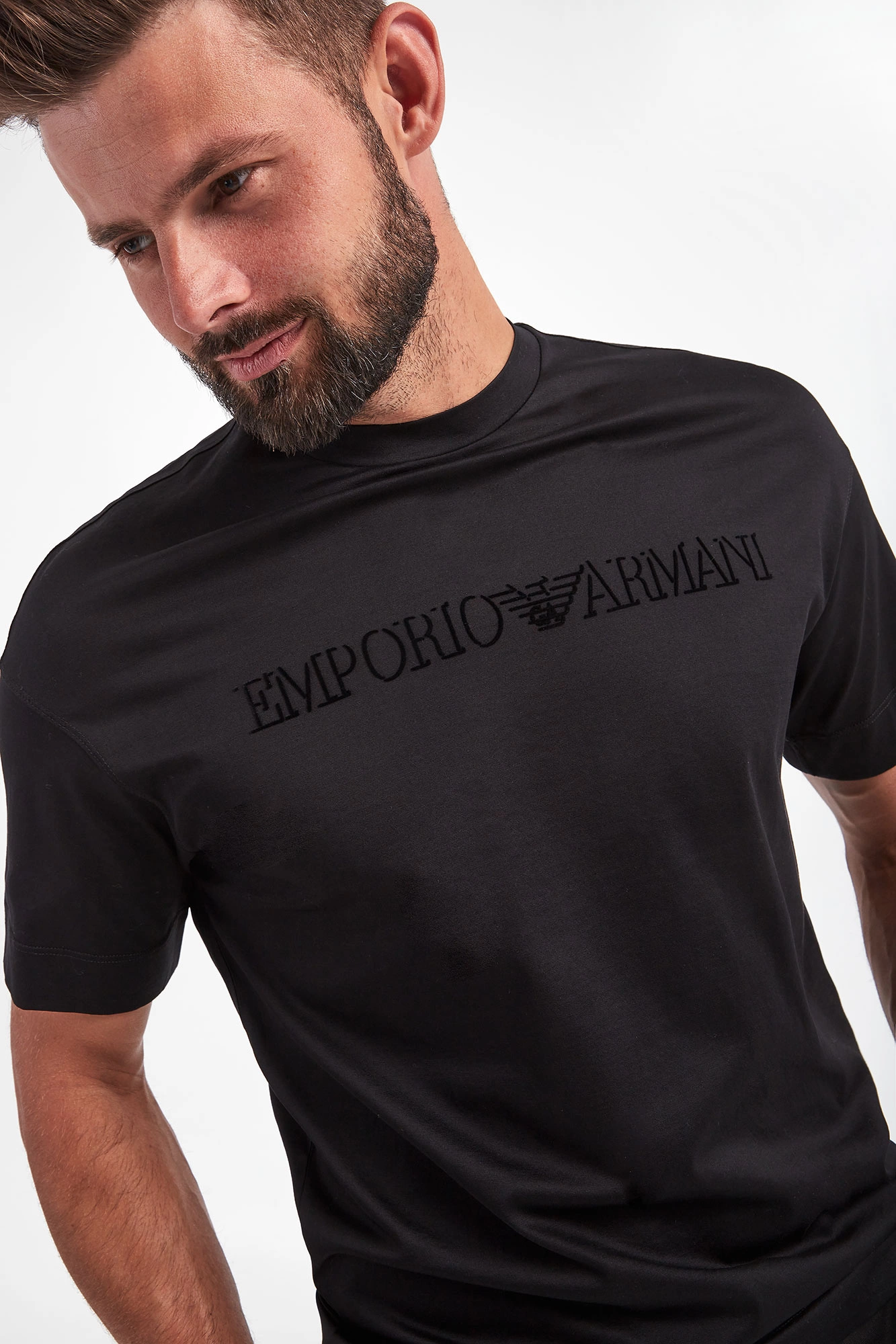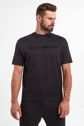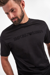 T-shirt marki Emporio Armani w czarnym kolorze. Dekolt typu o-neck zakończony ściągaczem. Na froncie czarne, welurowe logo. Krótkie rękawy i dół wykończone szeroką lamówką. Fason regular fit. W całości wykonany z bawełny.