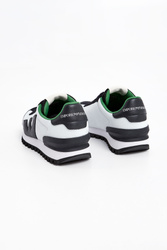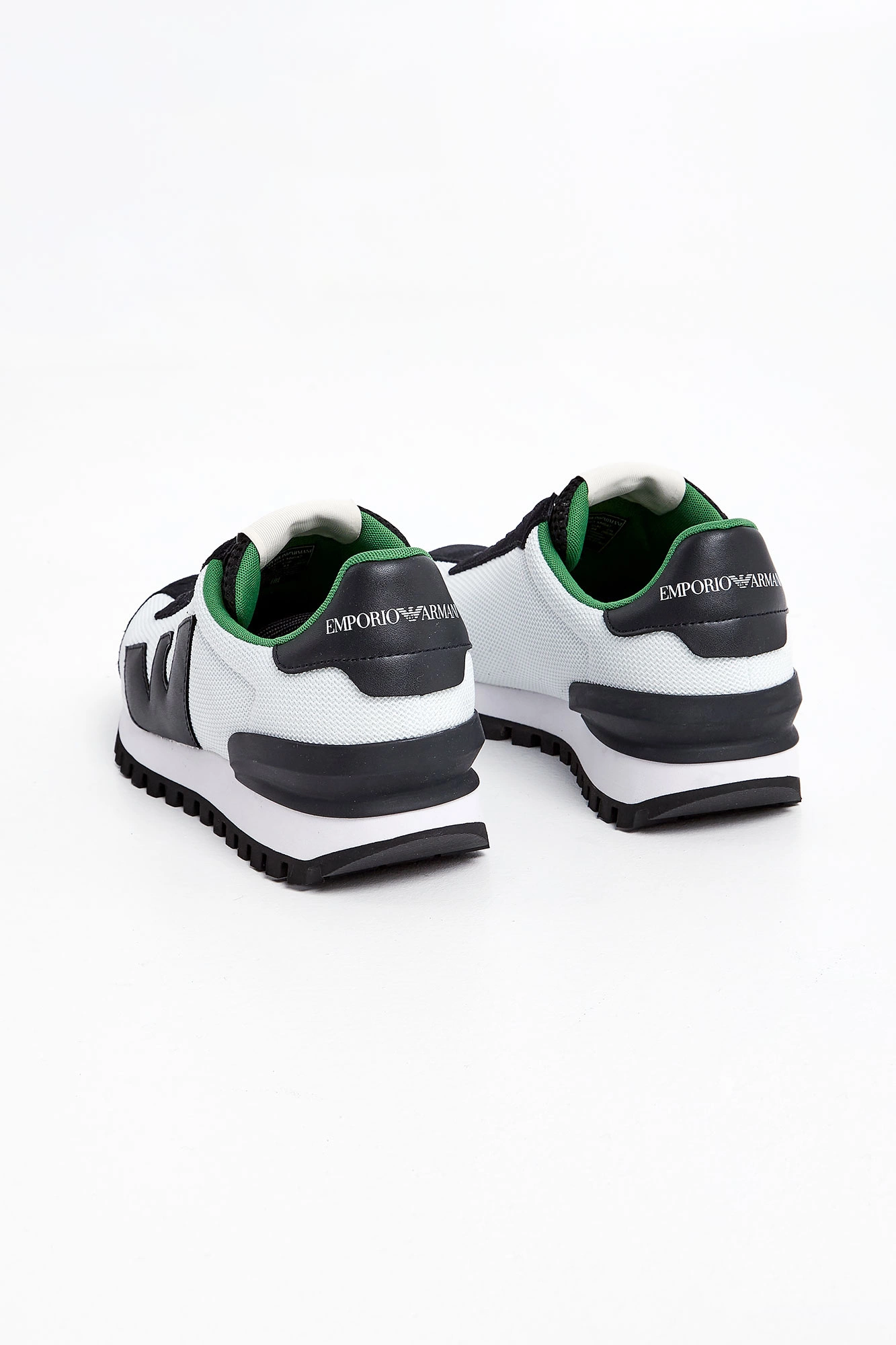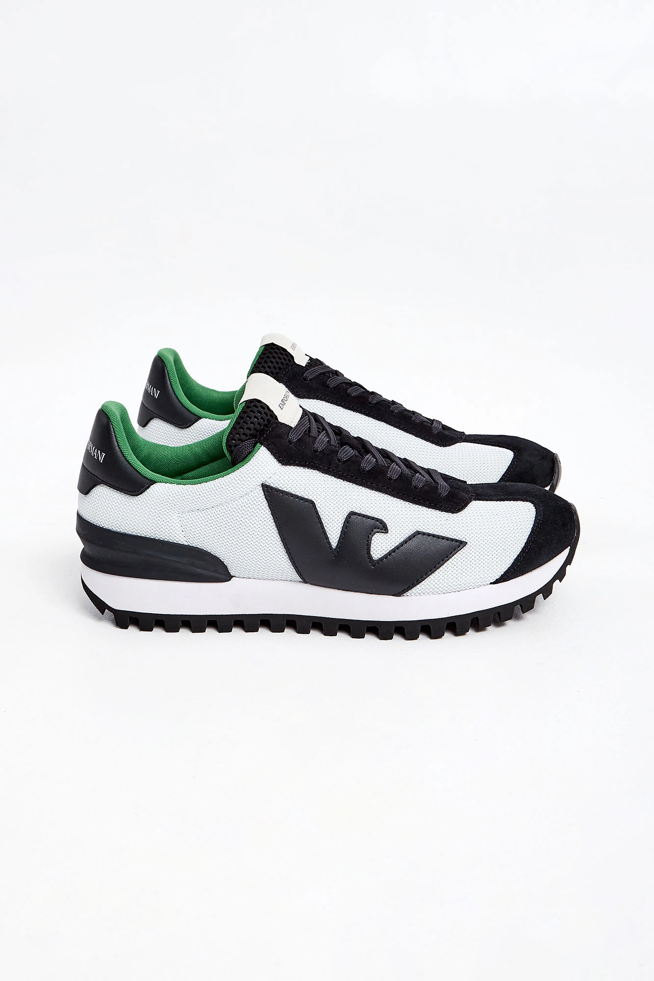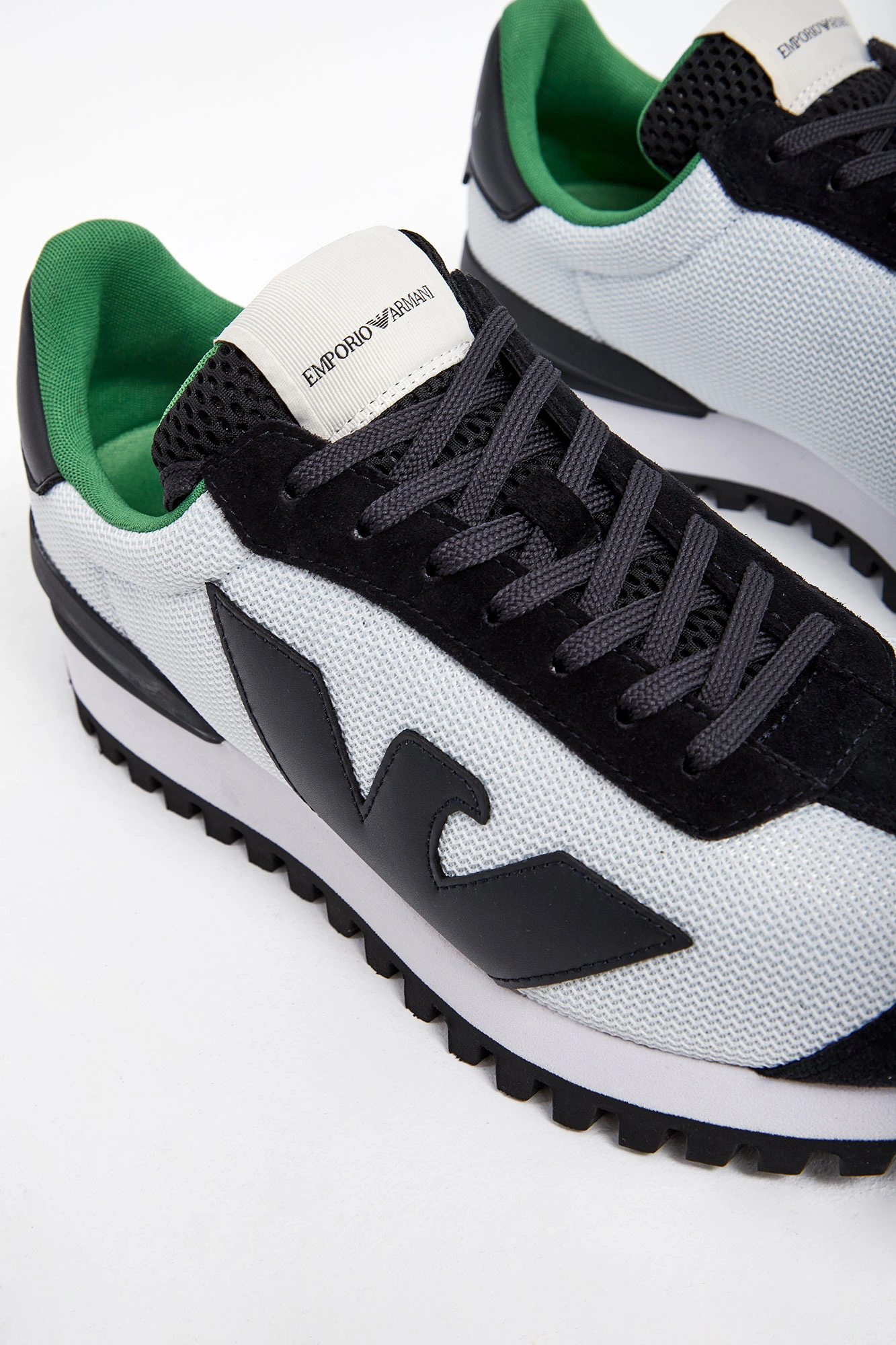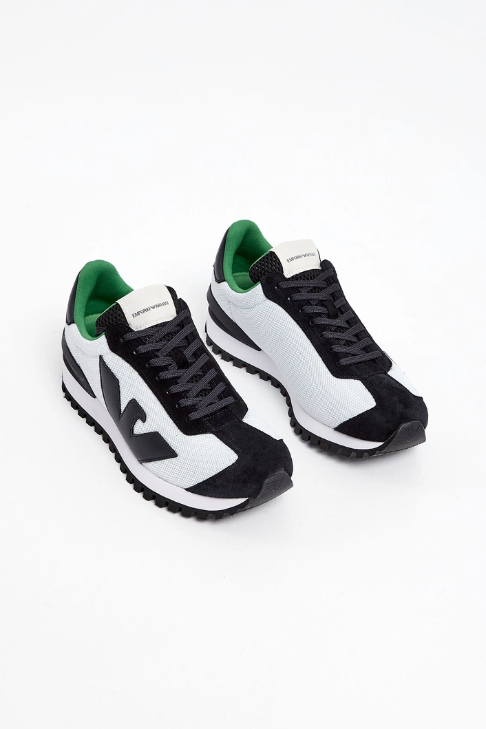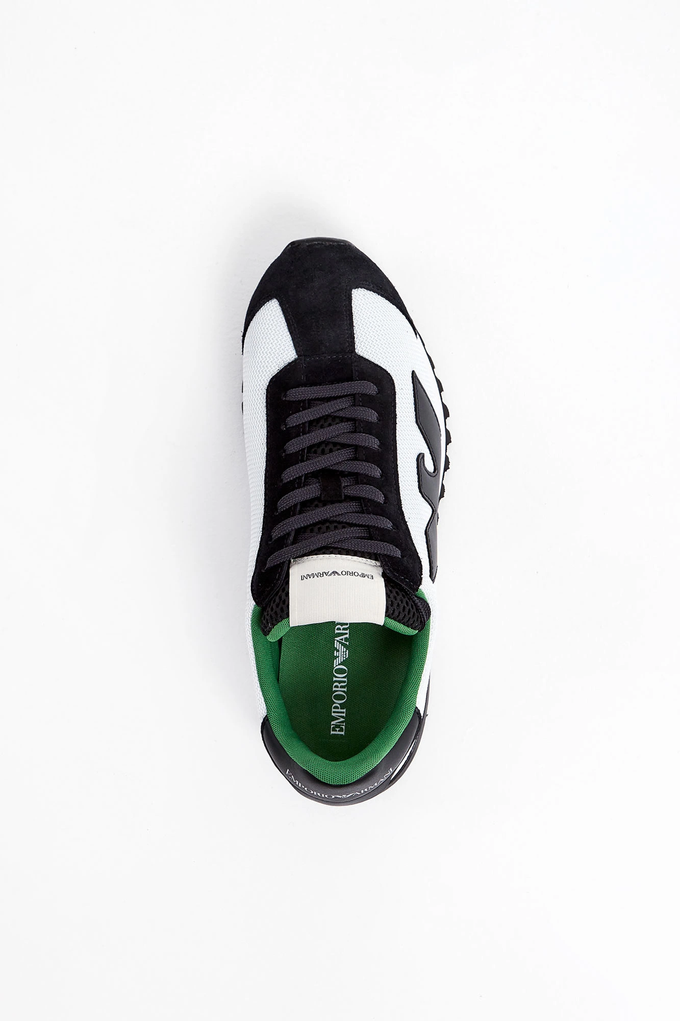Sneakersy marki Emporio Armani w czarno-białym kolorze. Pokryte siatkowanym materiałem. Na całości wstawki zamszowej i gładkiej skóry. Na języku naszywka z nazwą marki w białym kolorze. Z tyłu tłoczona nazwa i logo marki. Wyściółka sygnowana, w zielonym kolorze.