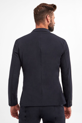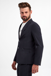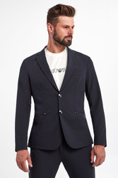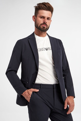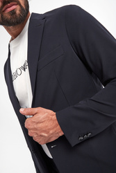 Marynarka marki Emporio Armani w kolorze grafitowym. Fason slim fit. Zapinana za pomocą wzorzystych guzików. Po bokach dwie kieszenie - jedna zapinana na suwak. Rękawy zakończone zapinanymi mankietami. Z tyłu rozcięcia zapewniające dopasowanie marynarki do sylwetki.