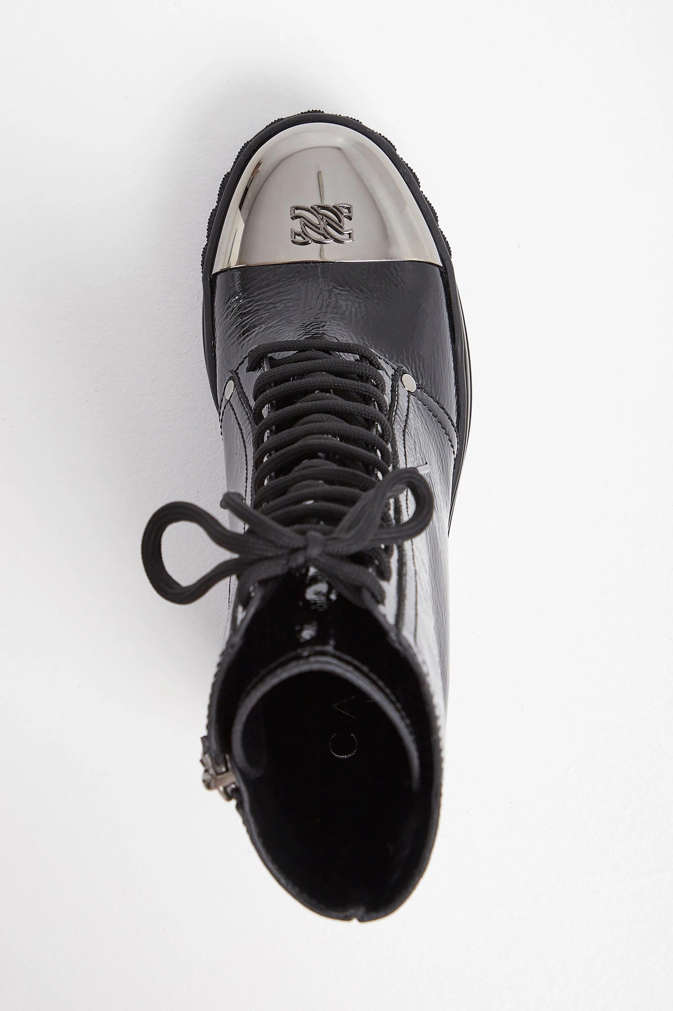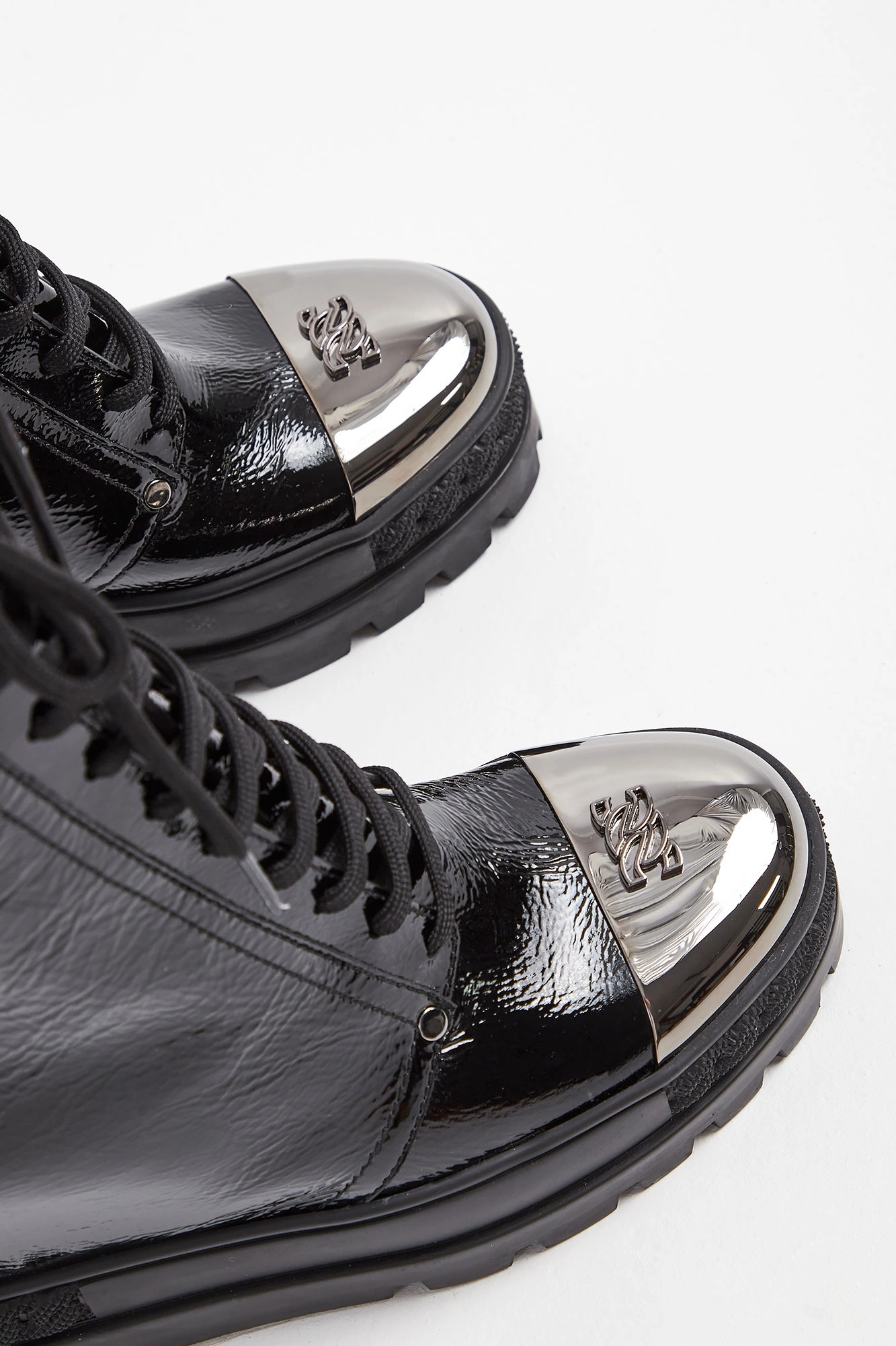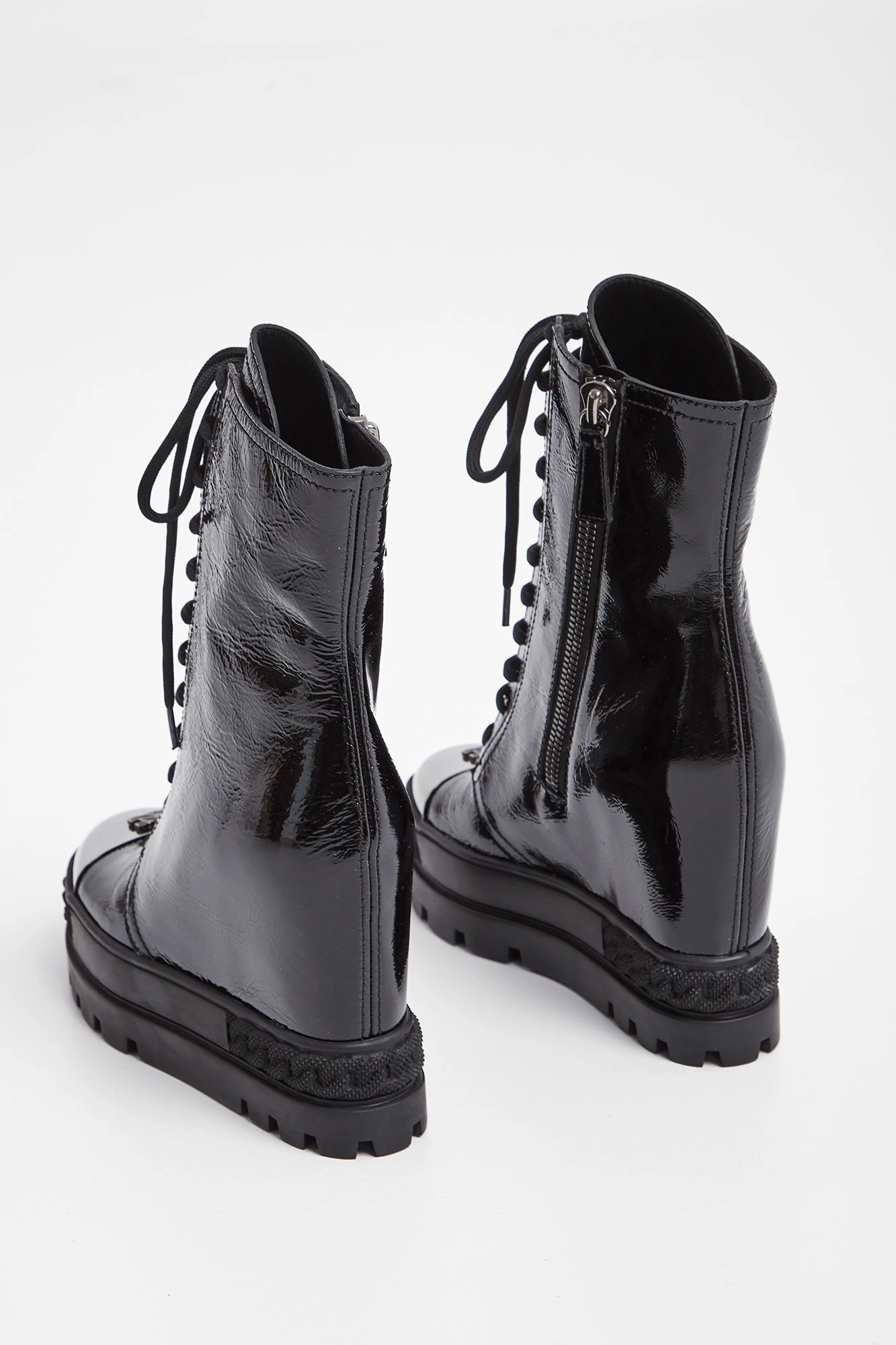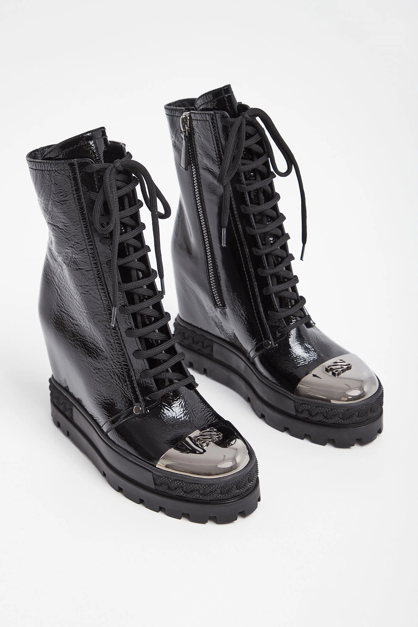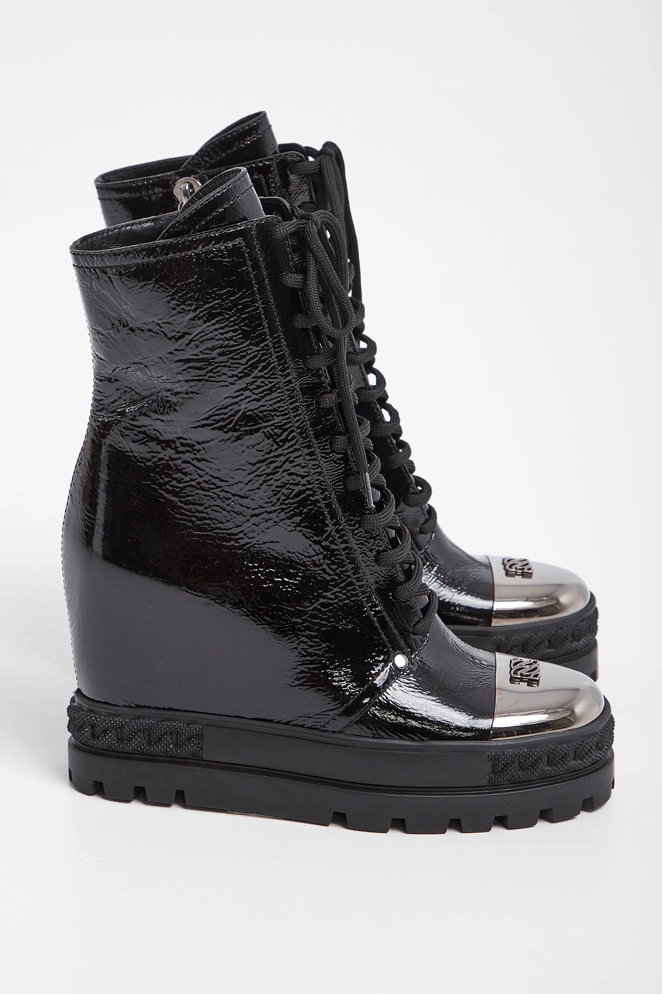 Skórzane botki marki Casadei w czarnym kolorze. Lakierowane, na koturnie. Wiązane z przodu i zapinane z boku. Na noskach metalowe, ciemnosrebrne, sygnowane wstawki. Podeszwa tłoczona, logowana. Wykonane ze skóry naturalnej.