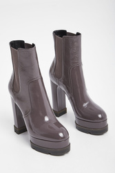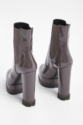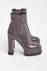 Skórzane botki marki Casadei w szarym kolorze. Lakierowane, na słupku. Po bokach ściągacze. Przód na platformie. Wykonane ze skóry naturalnej.