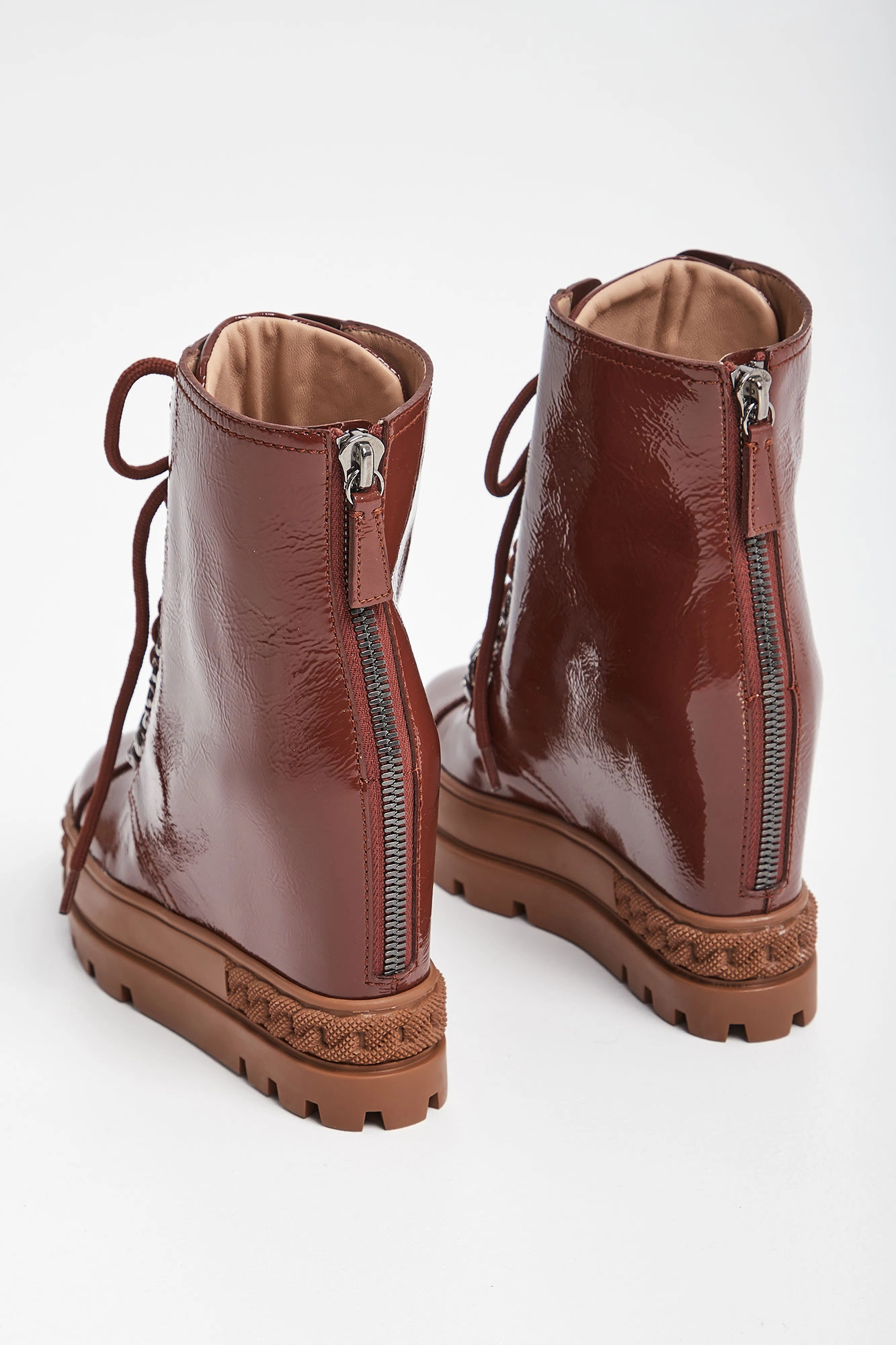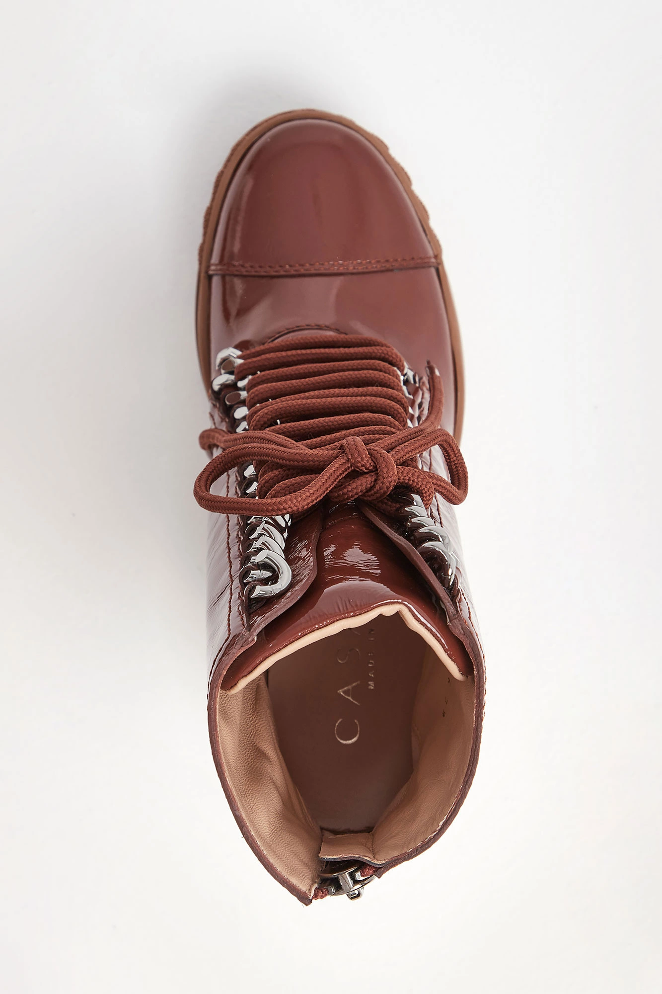 Skórzane botki marki Casadei w karmelowym kolorze. Lakierowane, na koturnie. Wiązane z przodu i zapinane z tyłu. Sznurówki ozdobione srebrnymi łańcuchami. Brązowa podeszwa z ozdobnym tłoczeniem. Wykonane z skóry naturalnej.