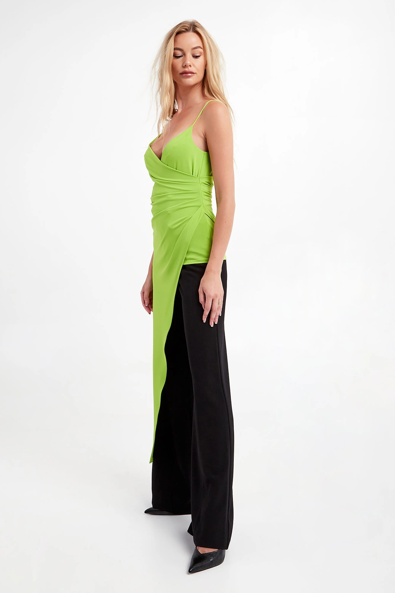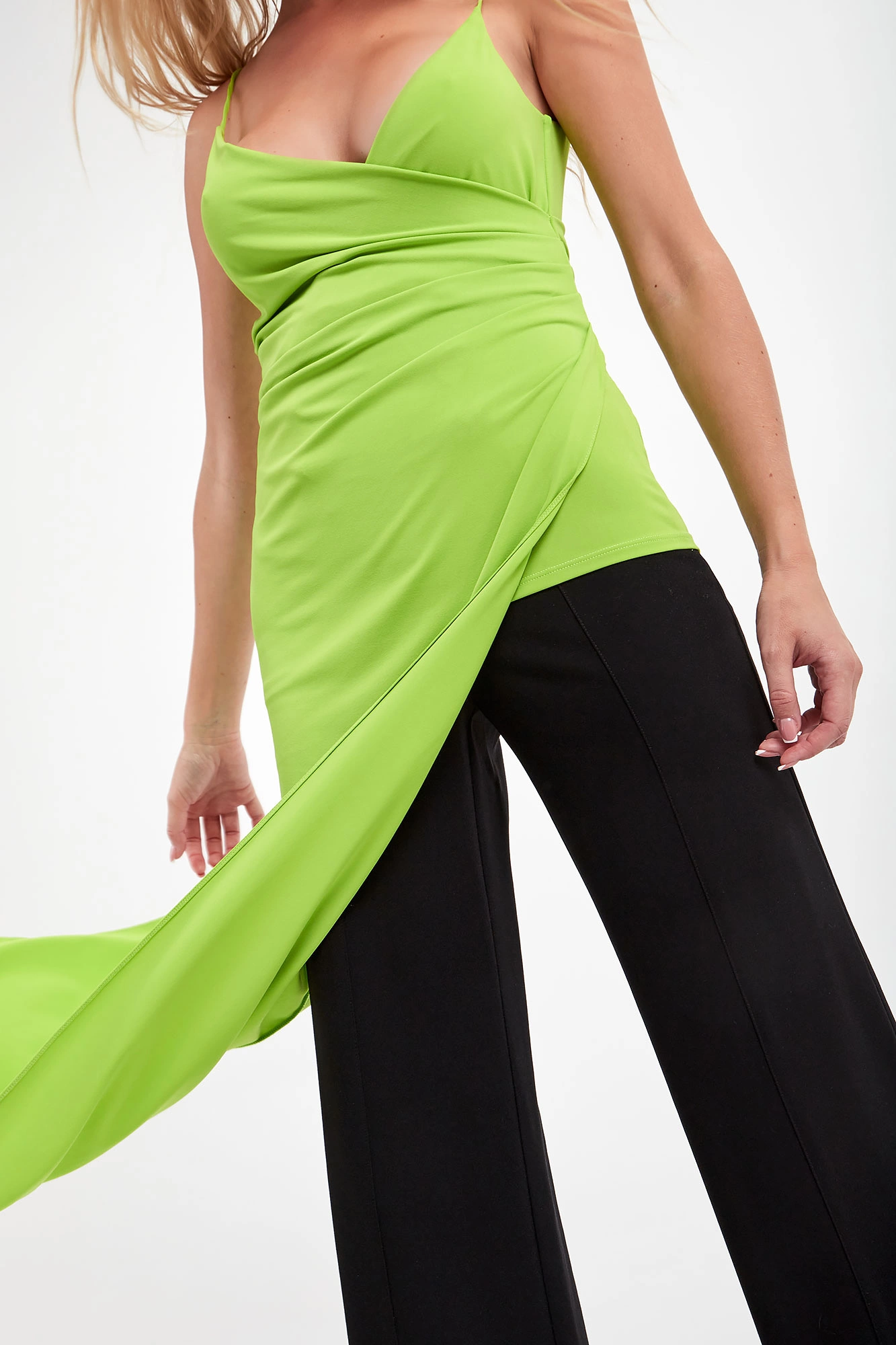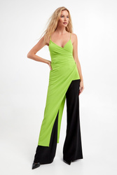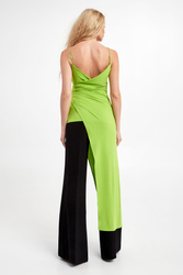 Bluzka marki Patrizia Pepe w kolorze limonkowym. Fason typu regular. Kopertowy dekolt. Na cienkich, regulowanych ramiączkach. Asymetrycznie wykończony dół zapewnia interesujący wygląd stylizacji.