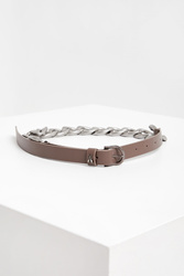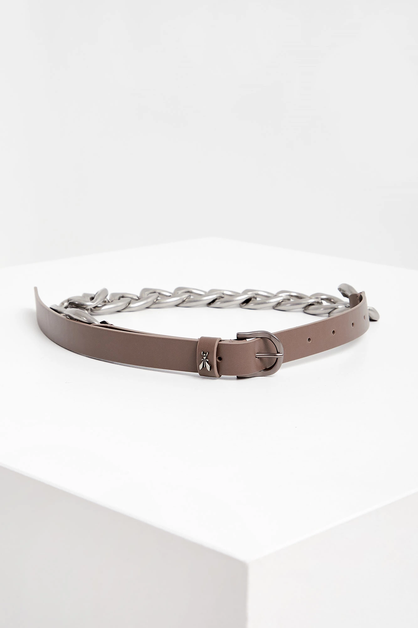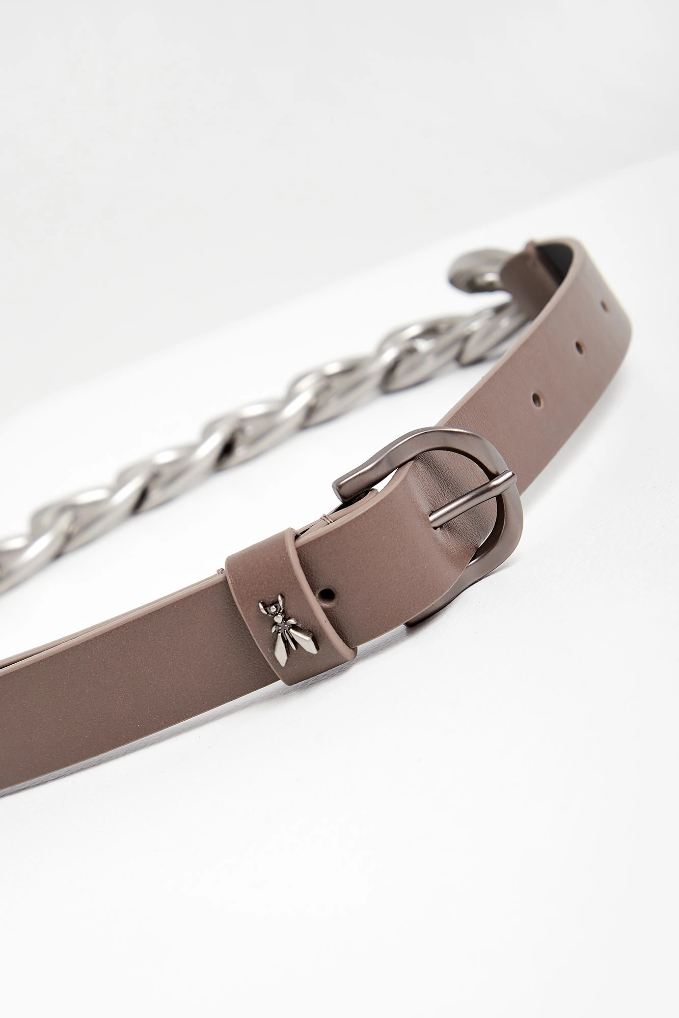 Pasek marki Patrizia Pepe w kolorze szaro-beżowym. Z tyłu wstawka z grubego, srebrnego łańcucha z efektem przybrudzenia. Zapinany za pomocą sprzączki w stylu retro. Na szlufce charakterystyczne, owadzie logo. Wykonany ze skóry naturalnej.