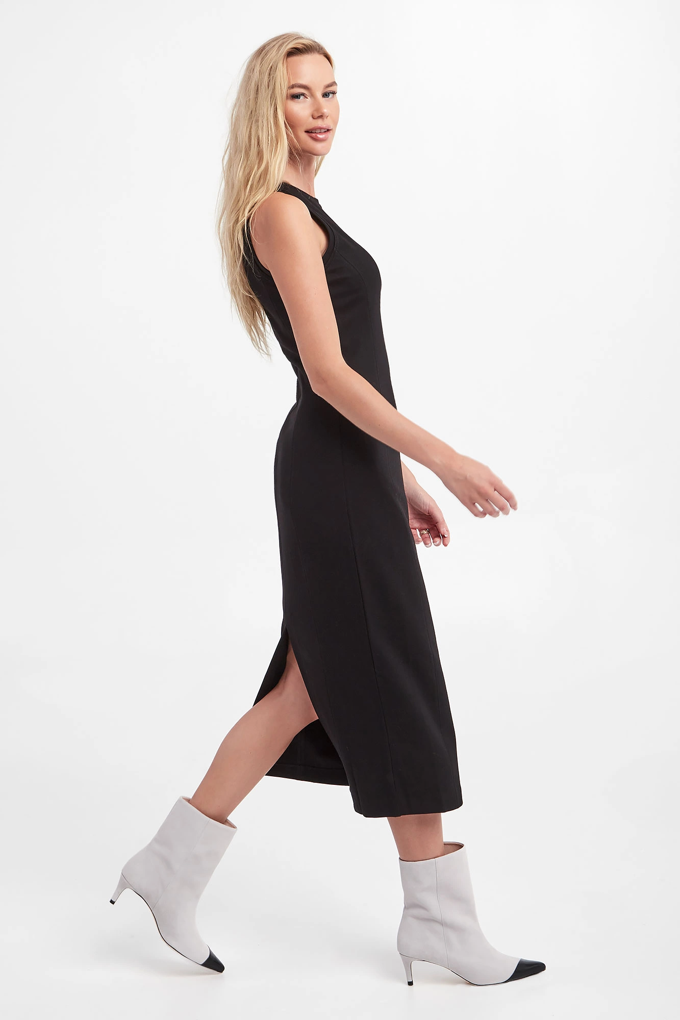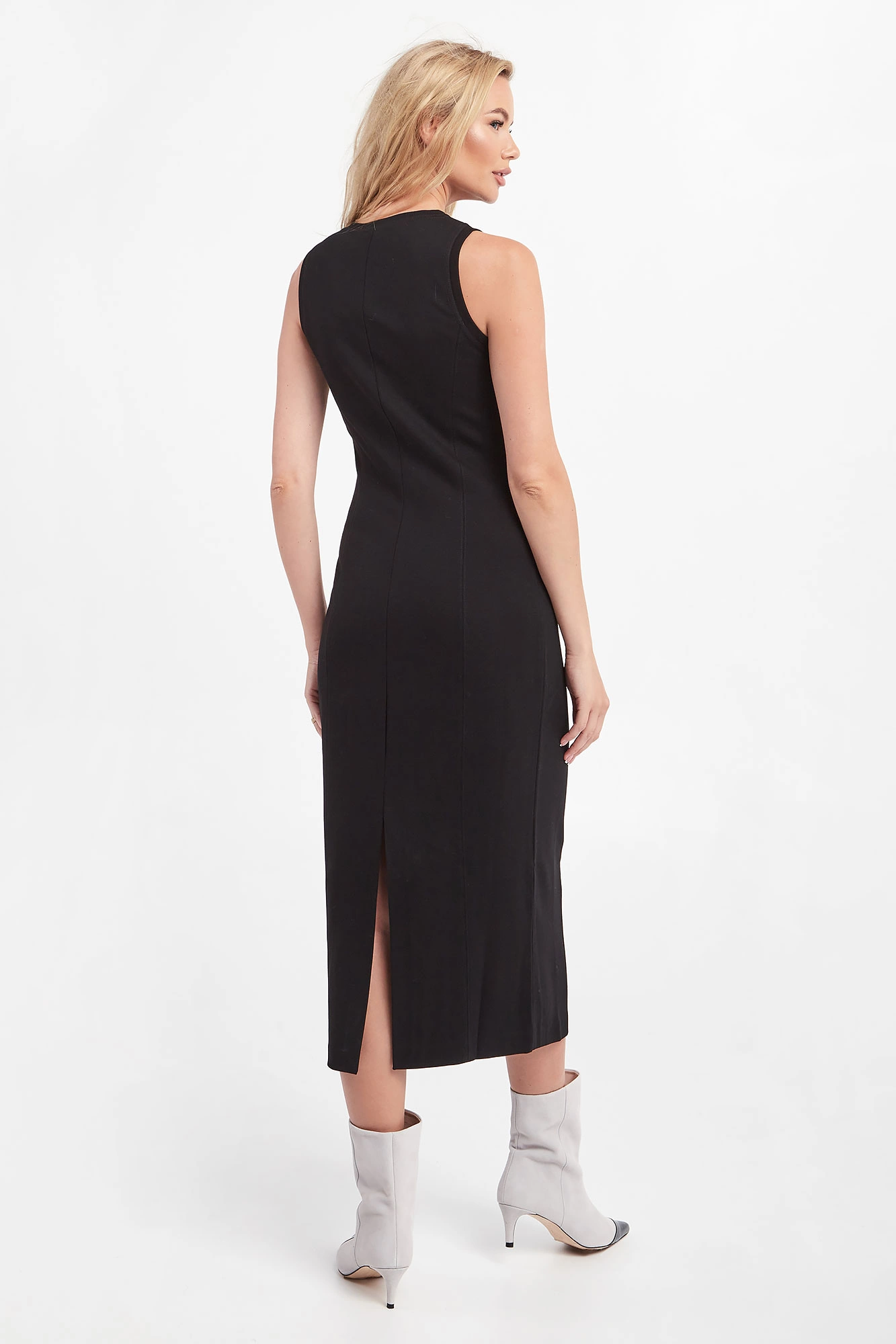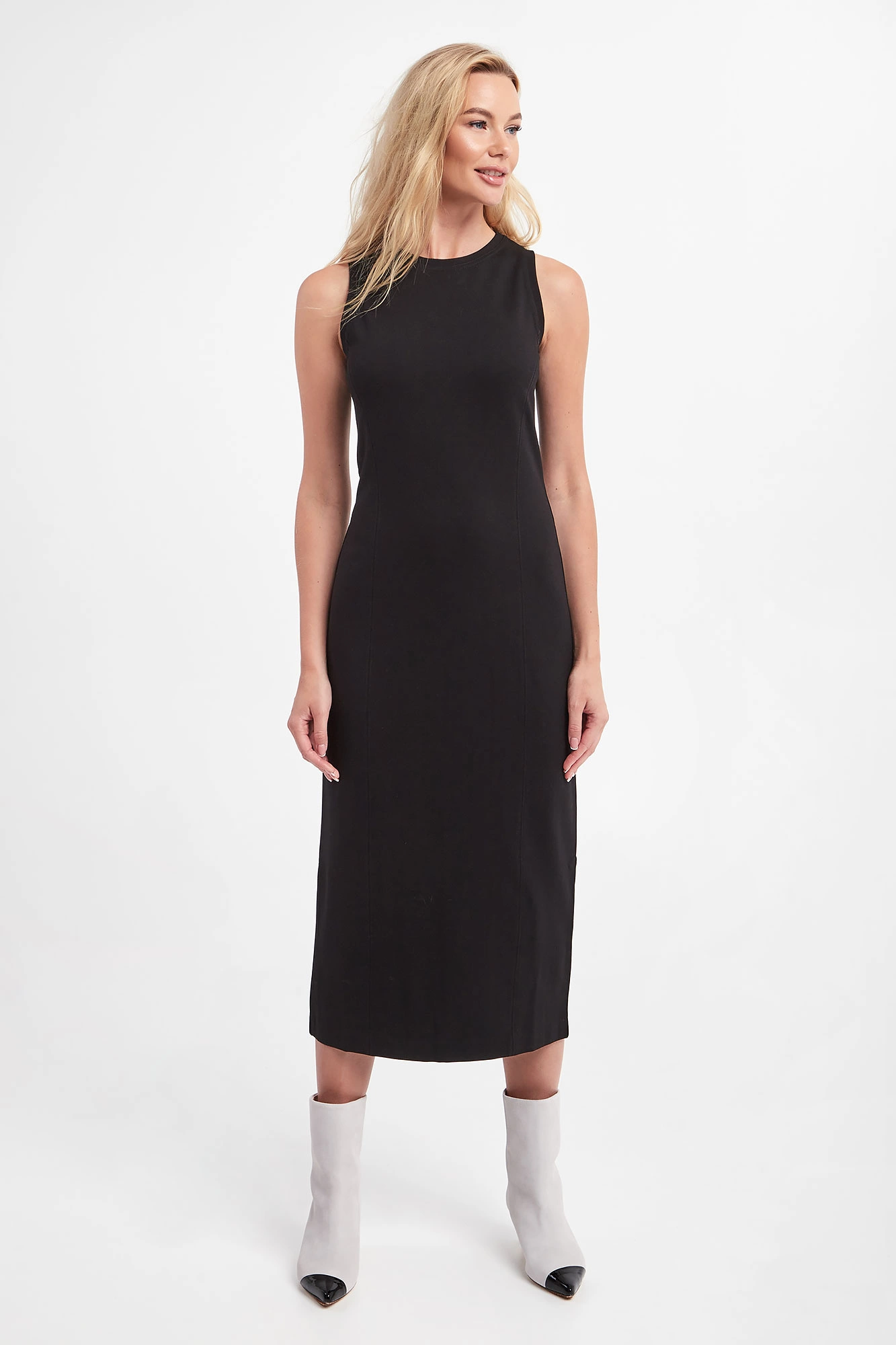 Sukienka na ramiączkach marki Marella w czarnym kolorze. Po bokach widoczne zszycie modelujące sylwetkę. Dekolt typu o-neck i ramiączka wykończone ściągaczem. Z tyłu rozcięcie. Fason typu slim o długości maxi. W większości wykonana z tkaniny wiskozowej.