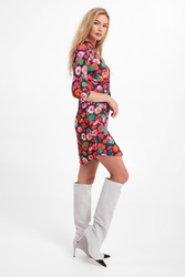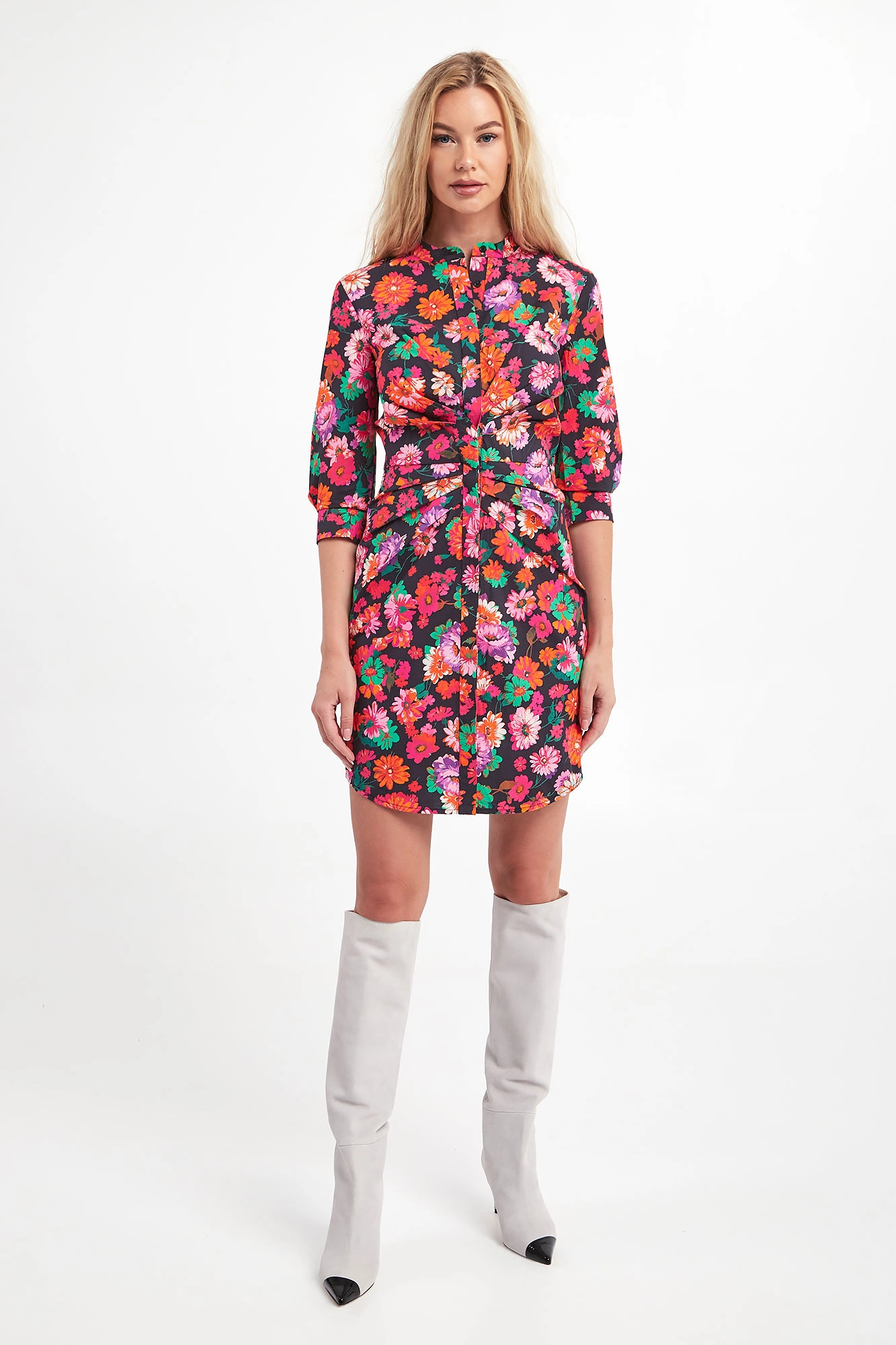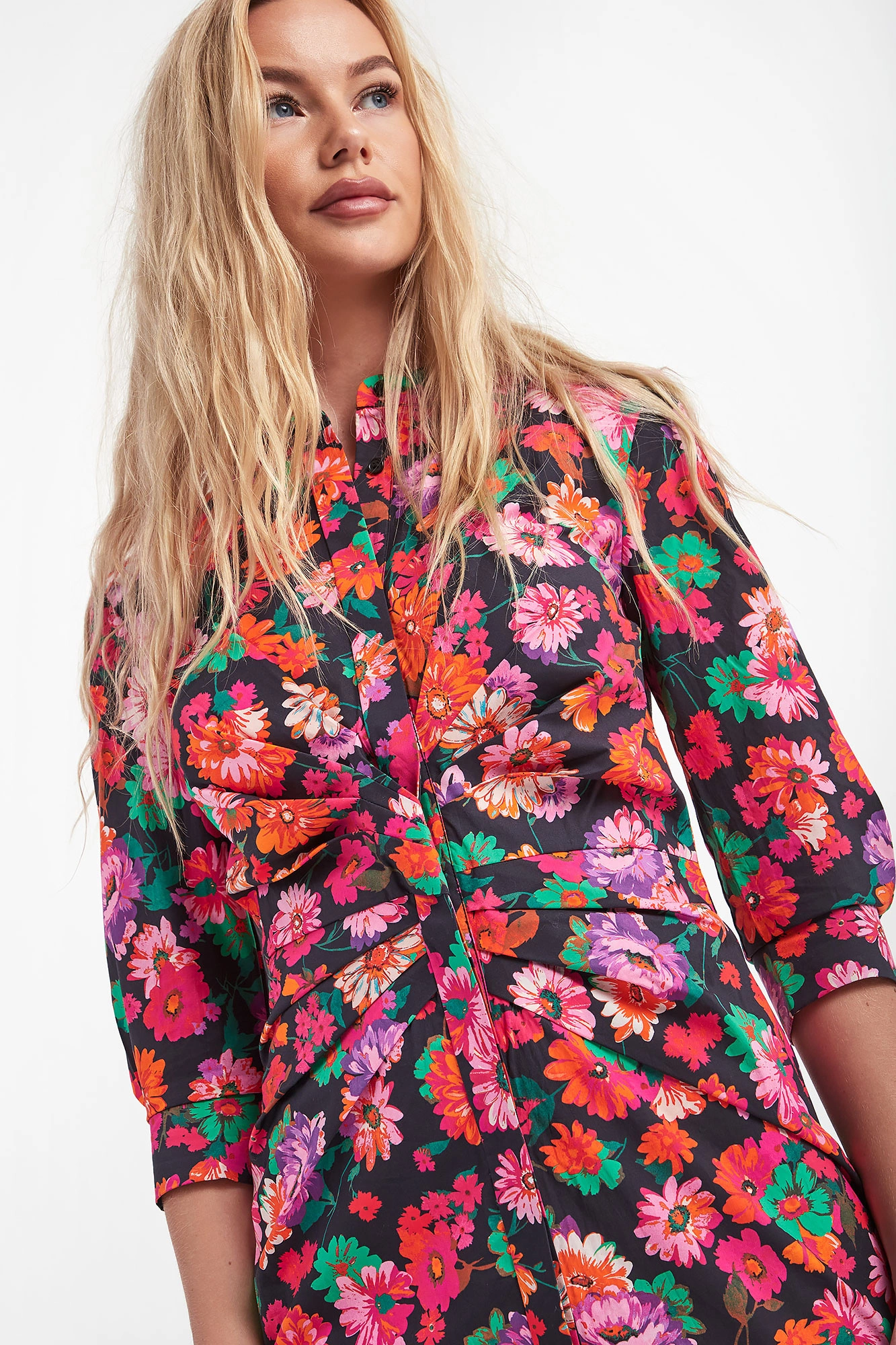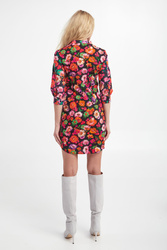 Sukienka marki Marella w czarnym kolorze. Na całości wielokolorowy, kwiatowy wzór. Zapinana z przodu za pomocą krytych guzików. Zabudowany dekolt ze stójką. Pod biustem marszczenie. Długie rękawy zakończone zapinanymi guzikami. Fason slim fit, długość mini. Wykonana z czystej bawełny.