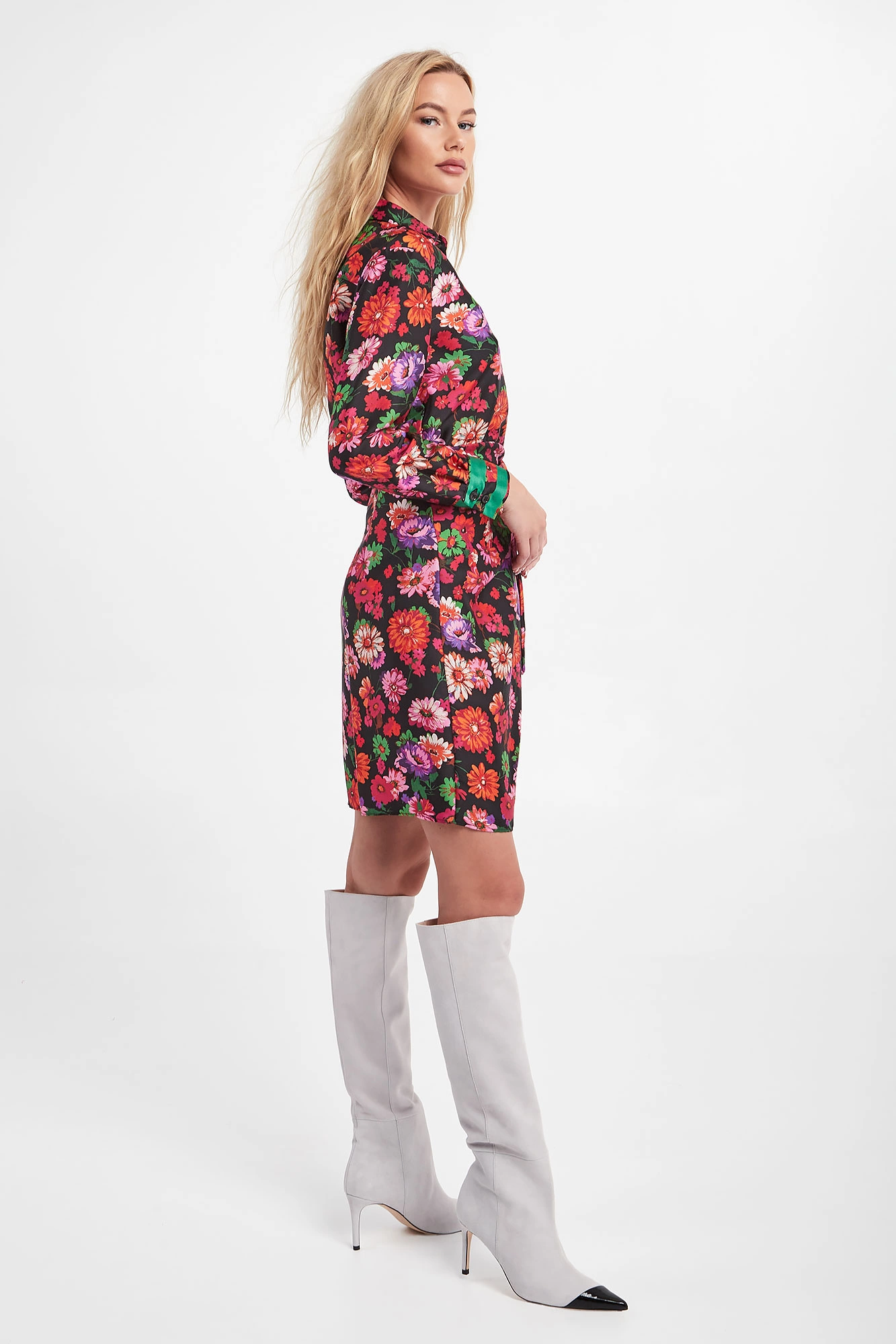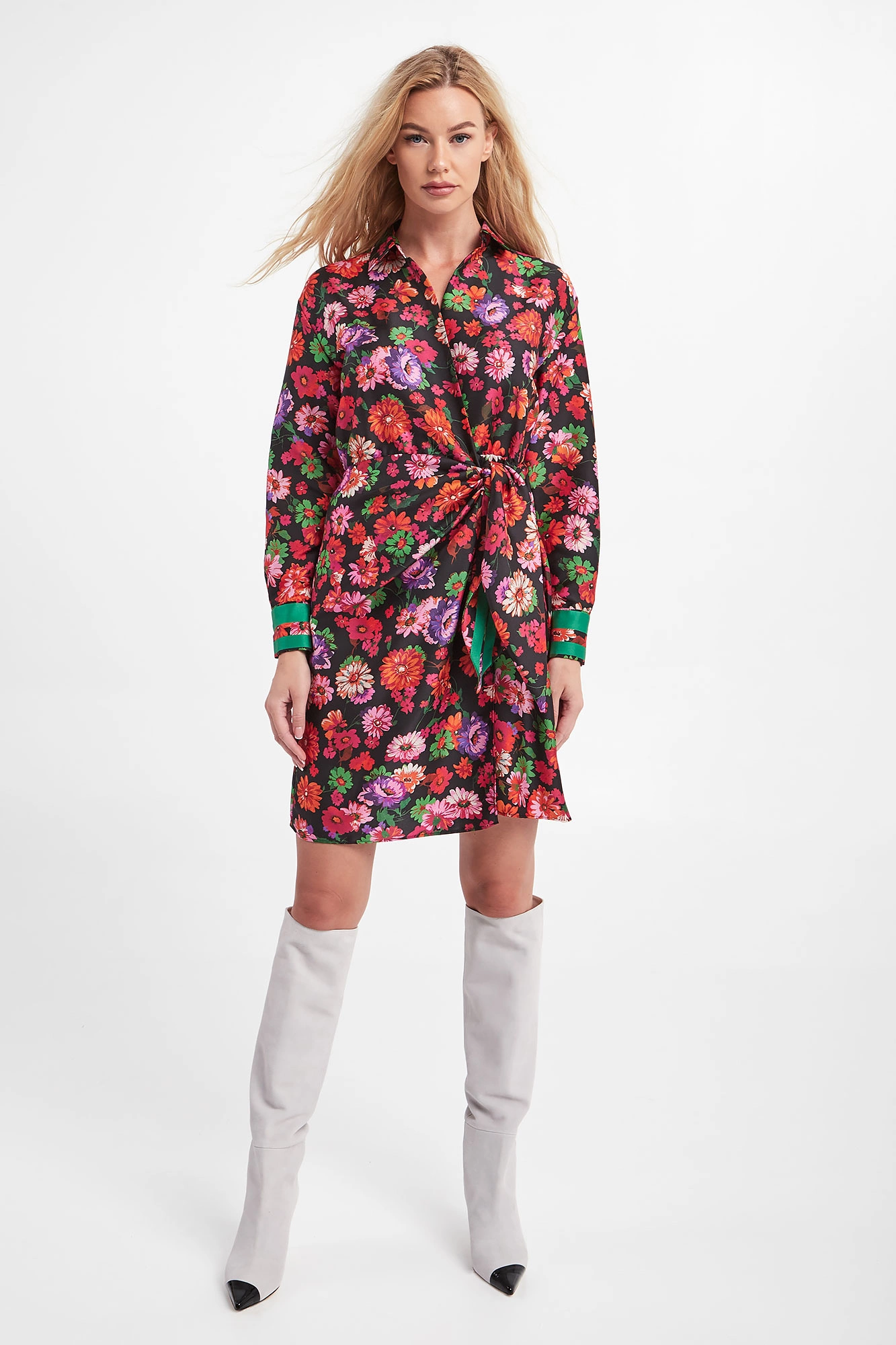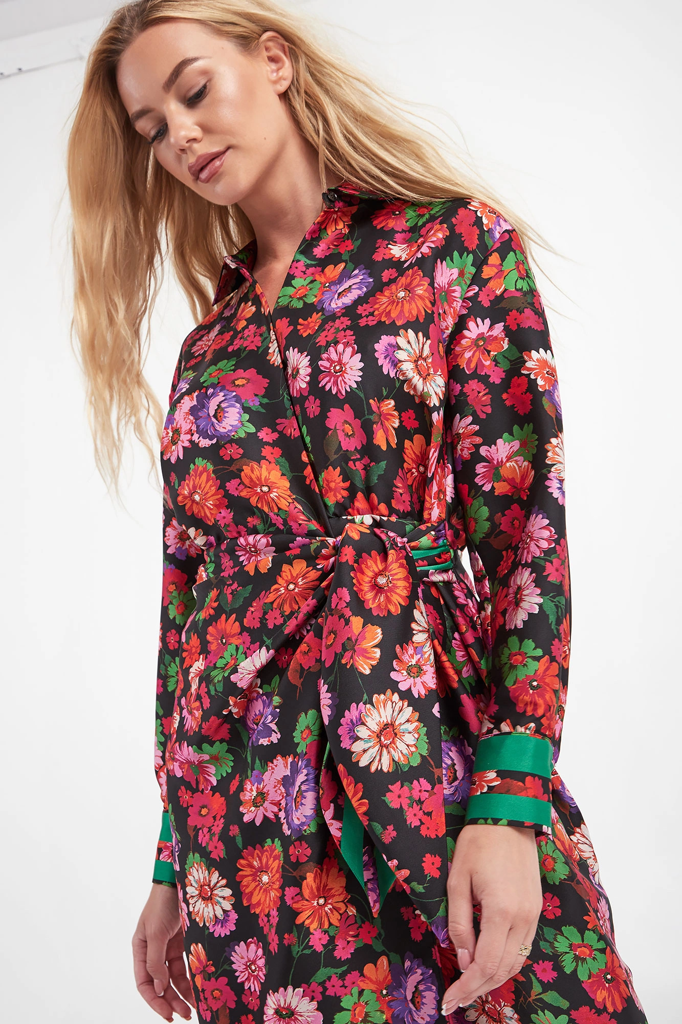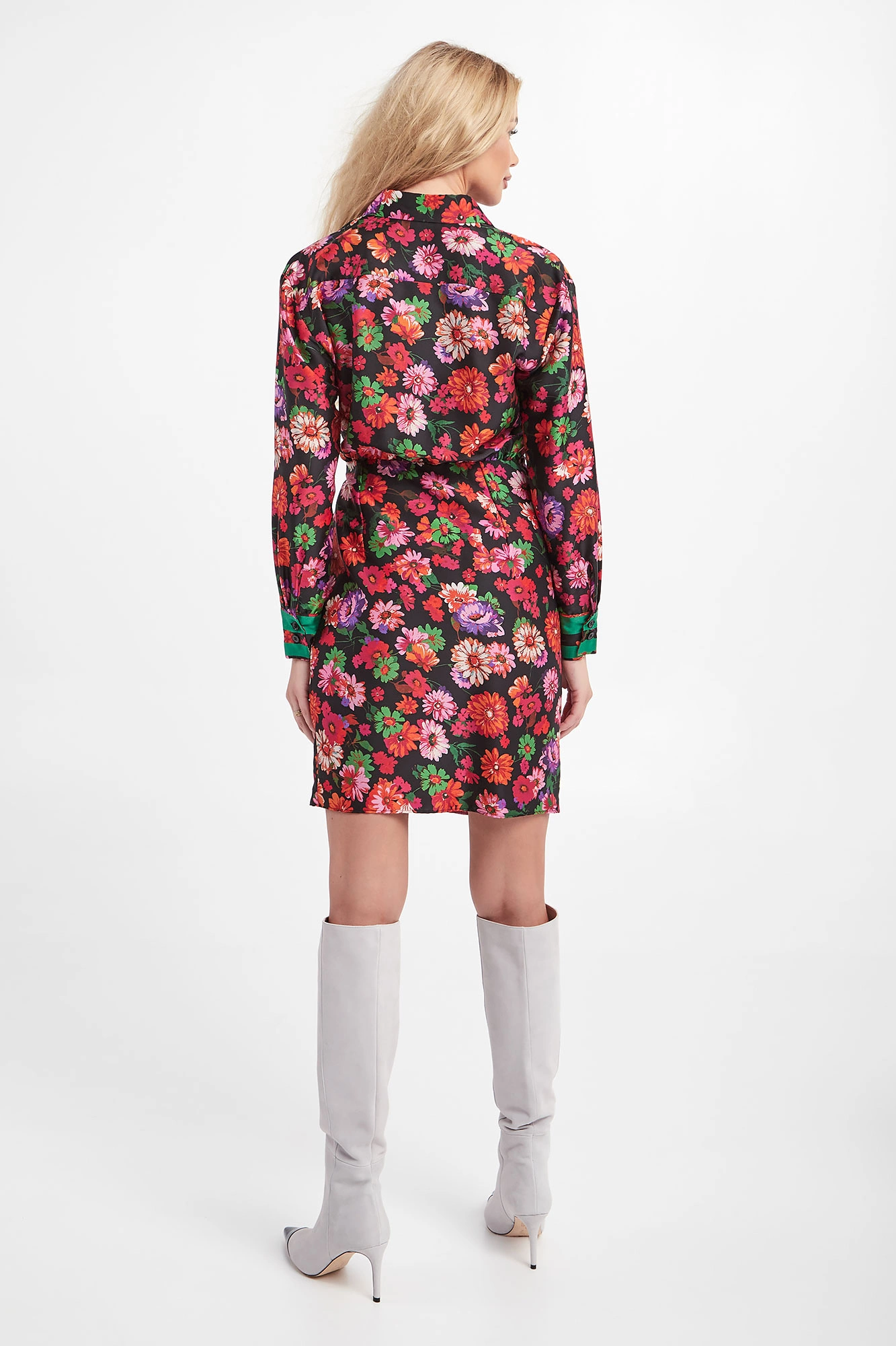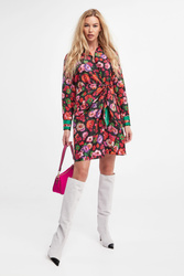 Sukienka marki Marella w czarnym kolorze. Na całości wielokolorowy, kwiatowy nadruk. Kopertowa. Wiązana od wewnętrznej i zewnętrznej strony. Góra wykończona klasycznym kołnierzem, zapinanym na niewielki guzik. Długie rękawy zakończone mankietami z zielonymi lampasami, zapinanymi za pomocą guzików w czarnym kolorze. Fason regular, o długości mini. Wykonana z przewiewnej tkaniny.