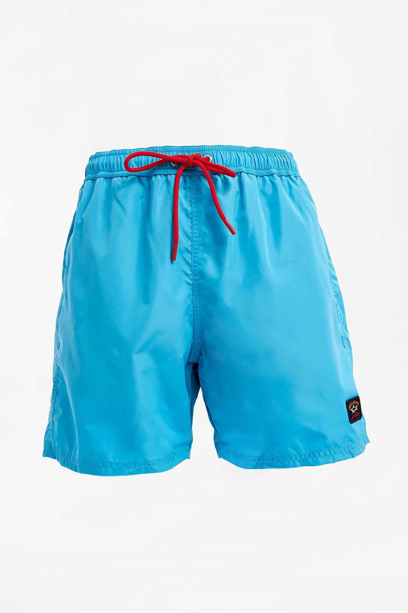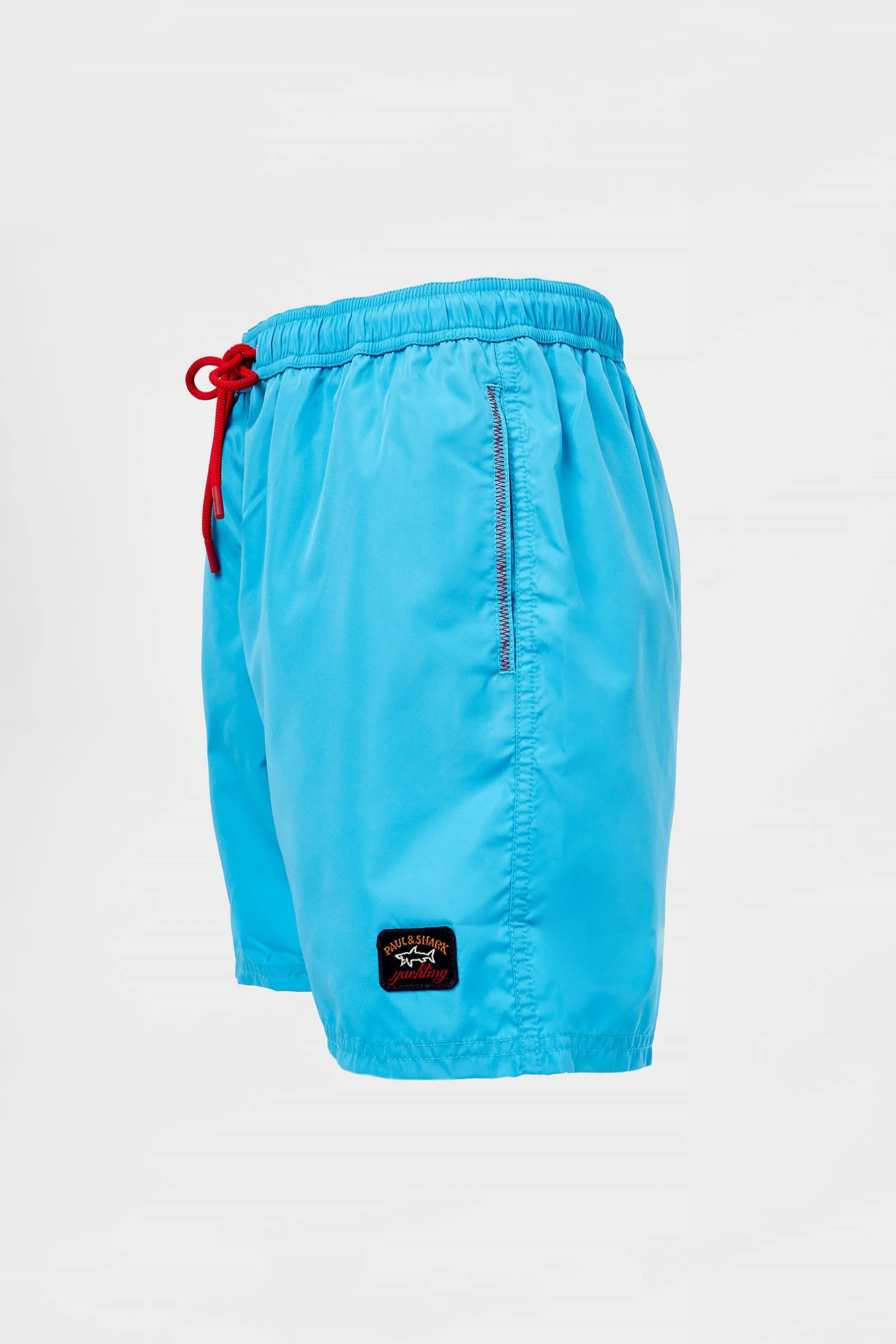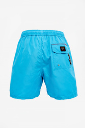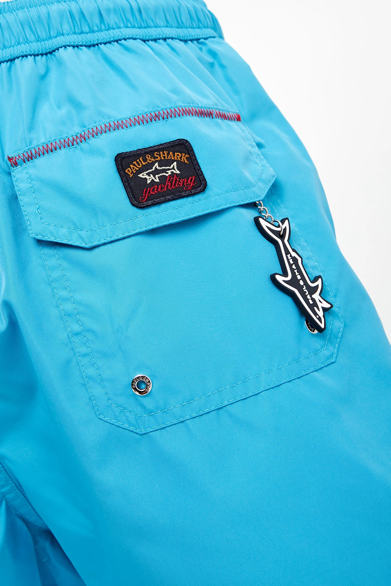 Szorty kąpielowe Paul&Shark w turkusowym kolorze. Z przodu i z tyłu naszywka z nazwą i logo marki. W pasie elastyczny ściągacz regulowany za pomocą troczków w czerwonym kolorze. Model z trzema kieszeniami, z czego jedna z tyłu zapinana na rzep. W zestawie breloczek z logo marki.