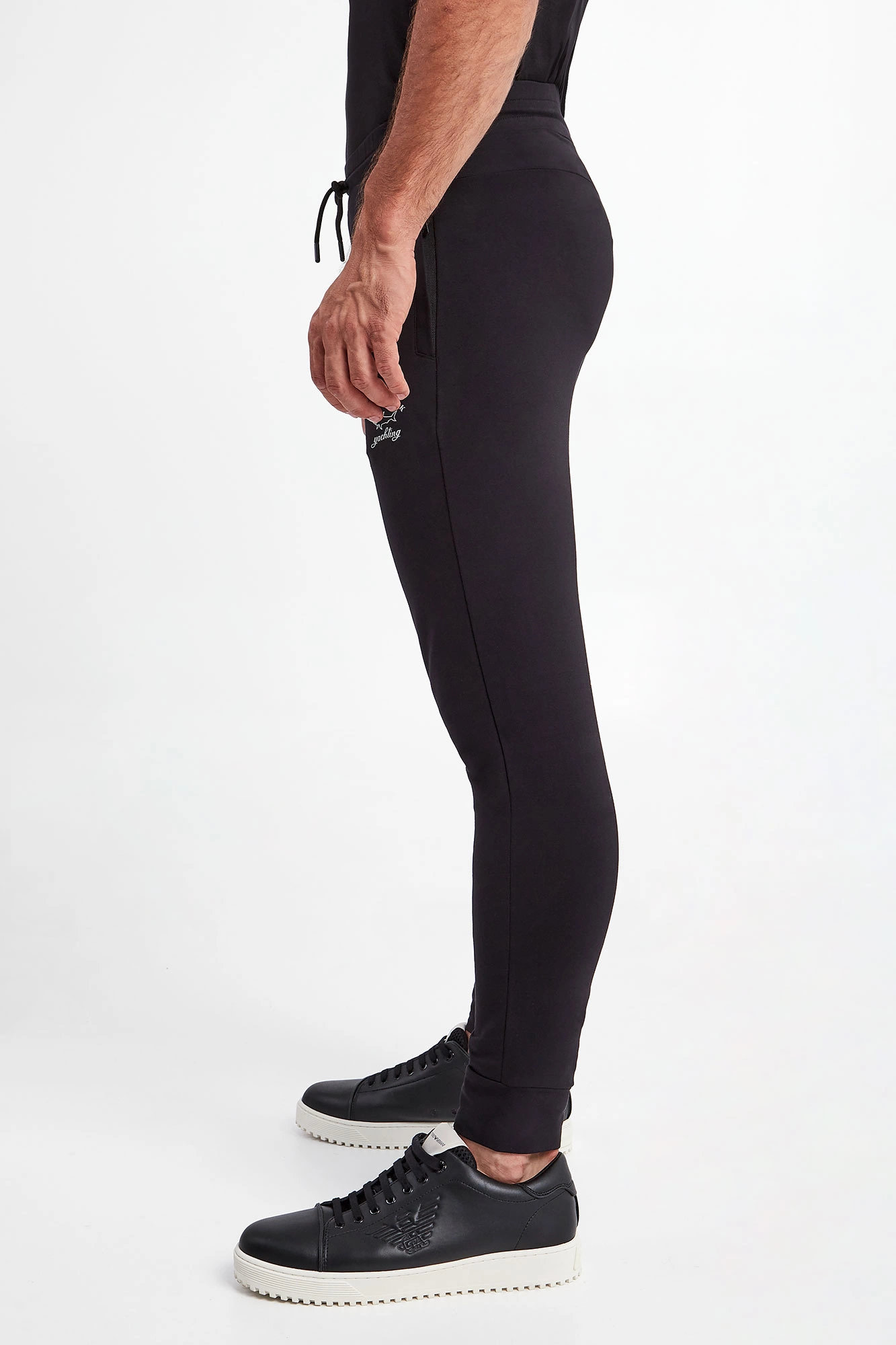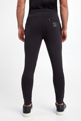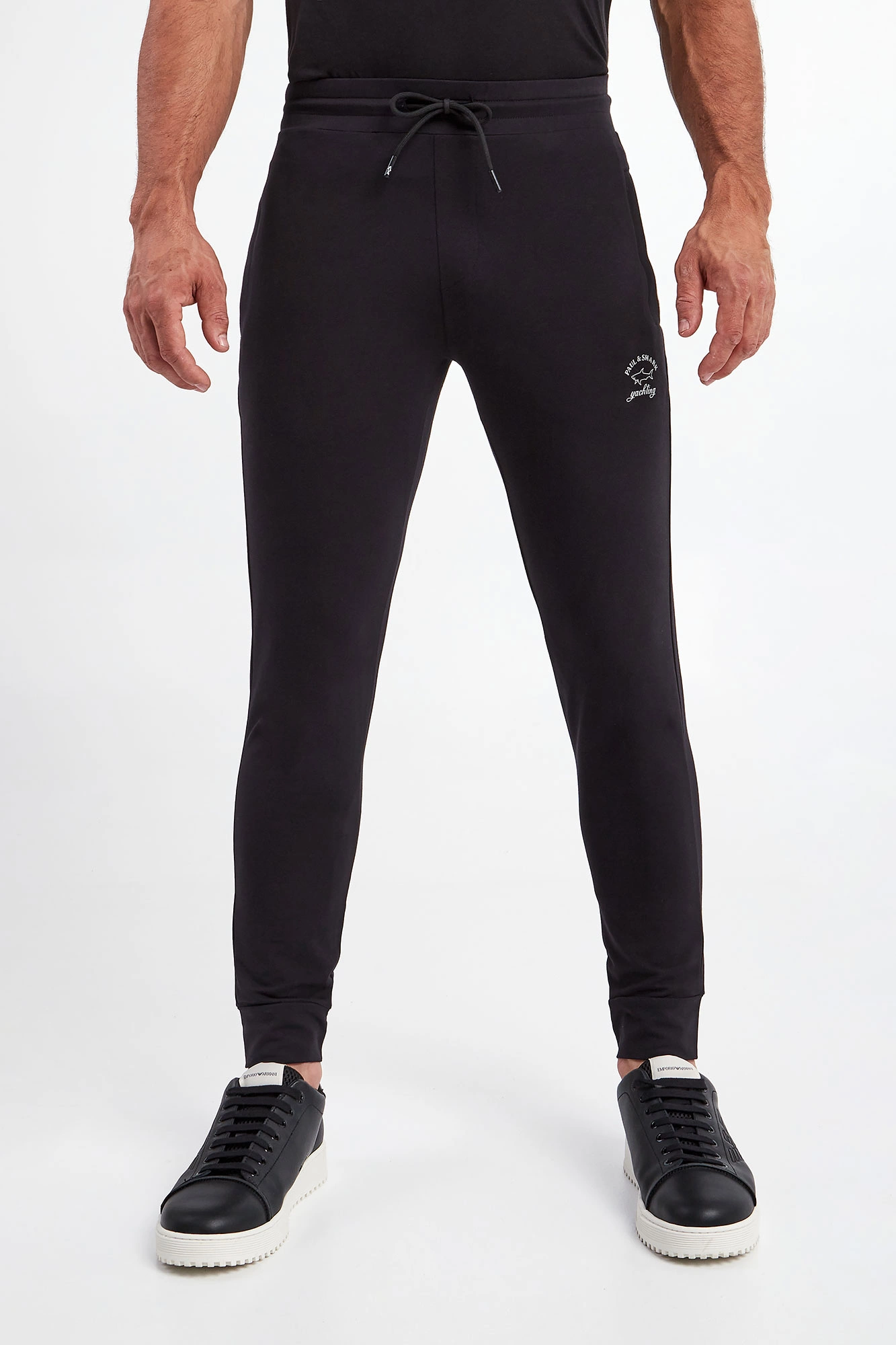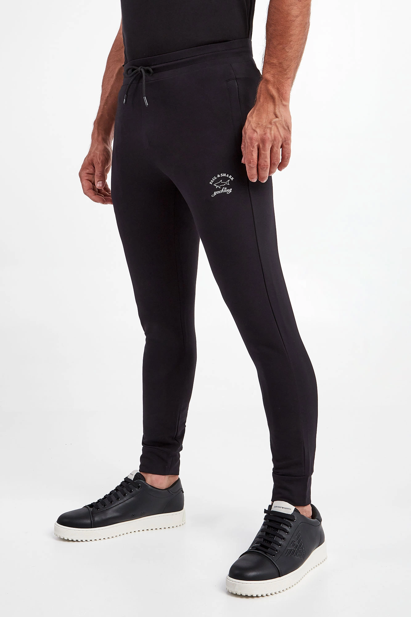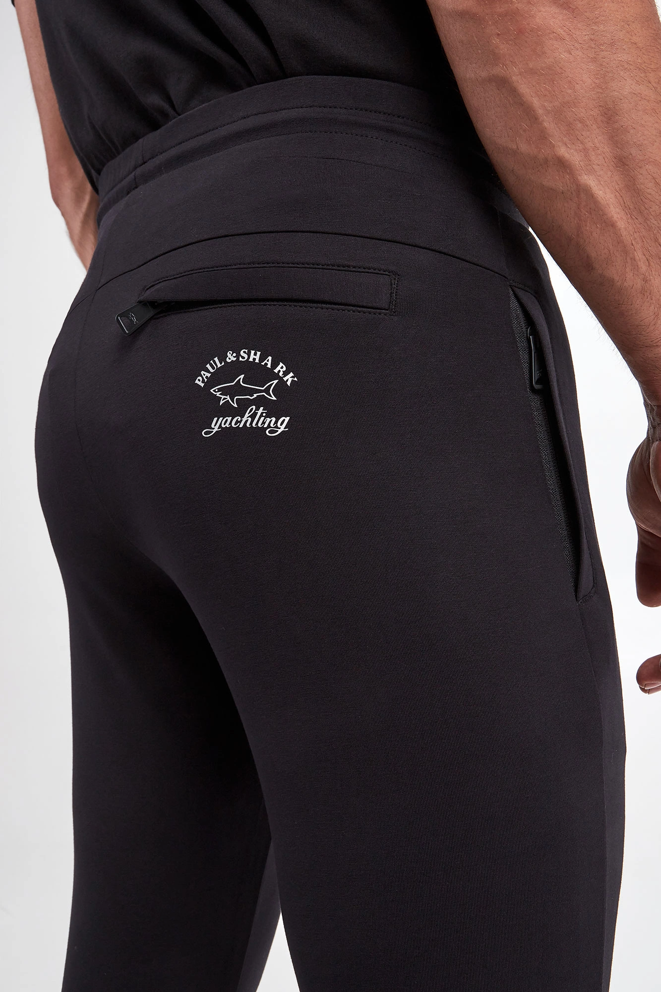 Spodnie dresowe marki Paul&Shark w kolorze czarnym. Fason typu slim. Nogawki zakończone szerokim ściągaczem gładkim. Na froncie nadruk z logo marki w kontrastującym kolorze. Dwie kieszenie z przodu i jedna z tyłu - wszystkie zapinane na sygnowane zamki. W pasie ściągacz z troczkami do regulacji.