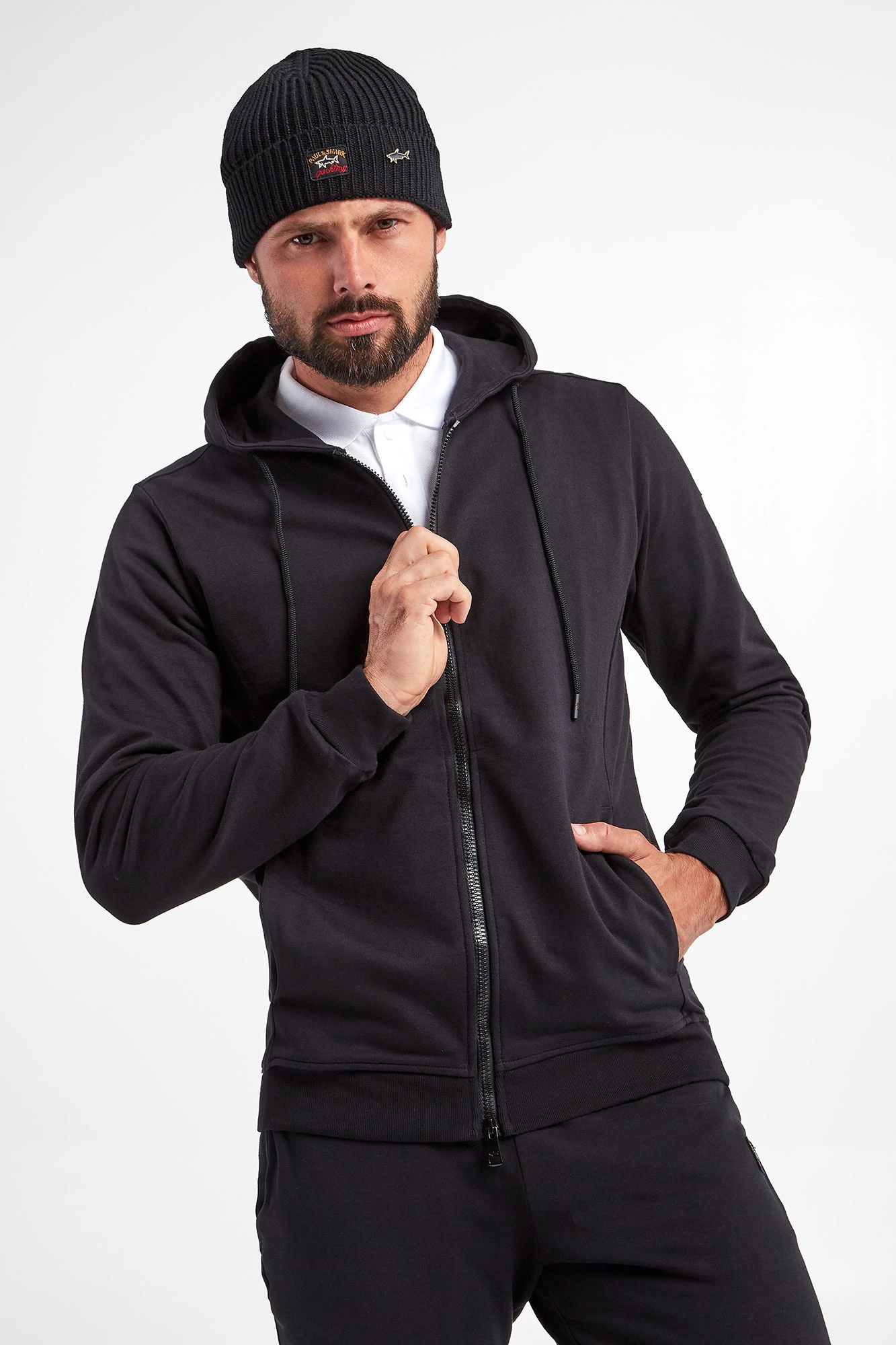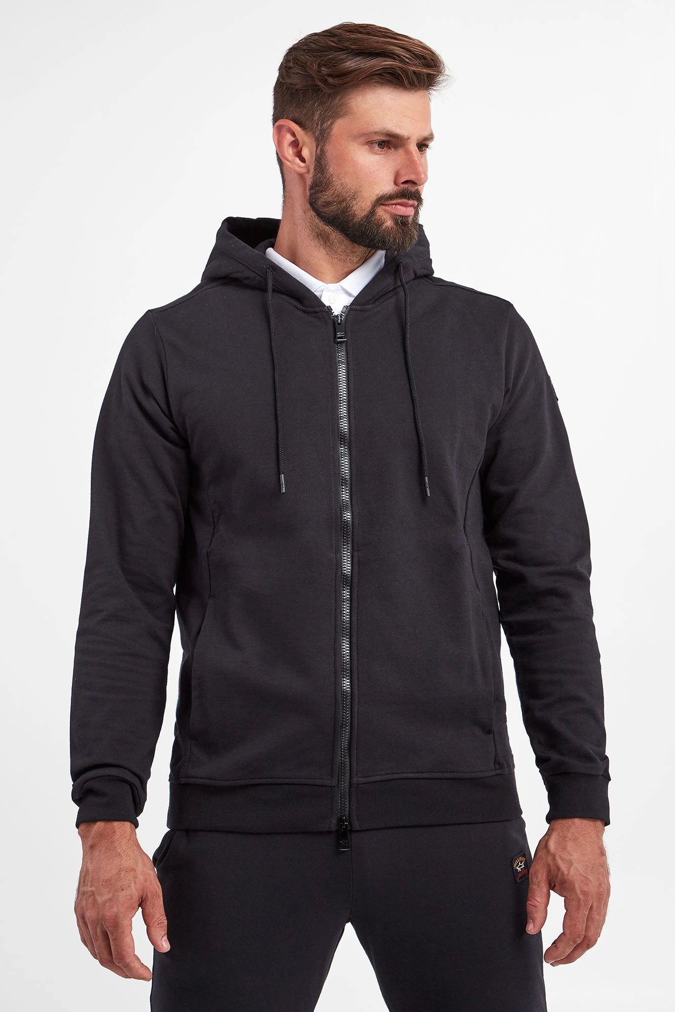 Bluza z kapturem marki Paul&Shark w kolorze czarnym. Fason typu regular fit. Zapinana na podwójny zamek z sygnowaniem. Na lewym rękawie naszywka z logo marki. Na przodzie dwie kieszenie. Rękawy i dół zakończone ściągaczem prążkowanym. Kaptur z troczkami zakończonymi sygnowaniem. Bluza wykonana z czystej bawełny.