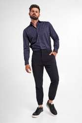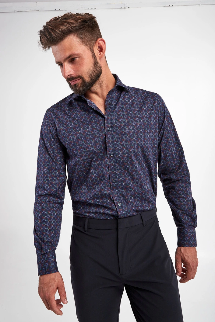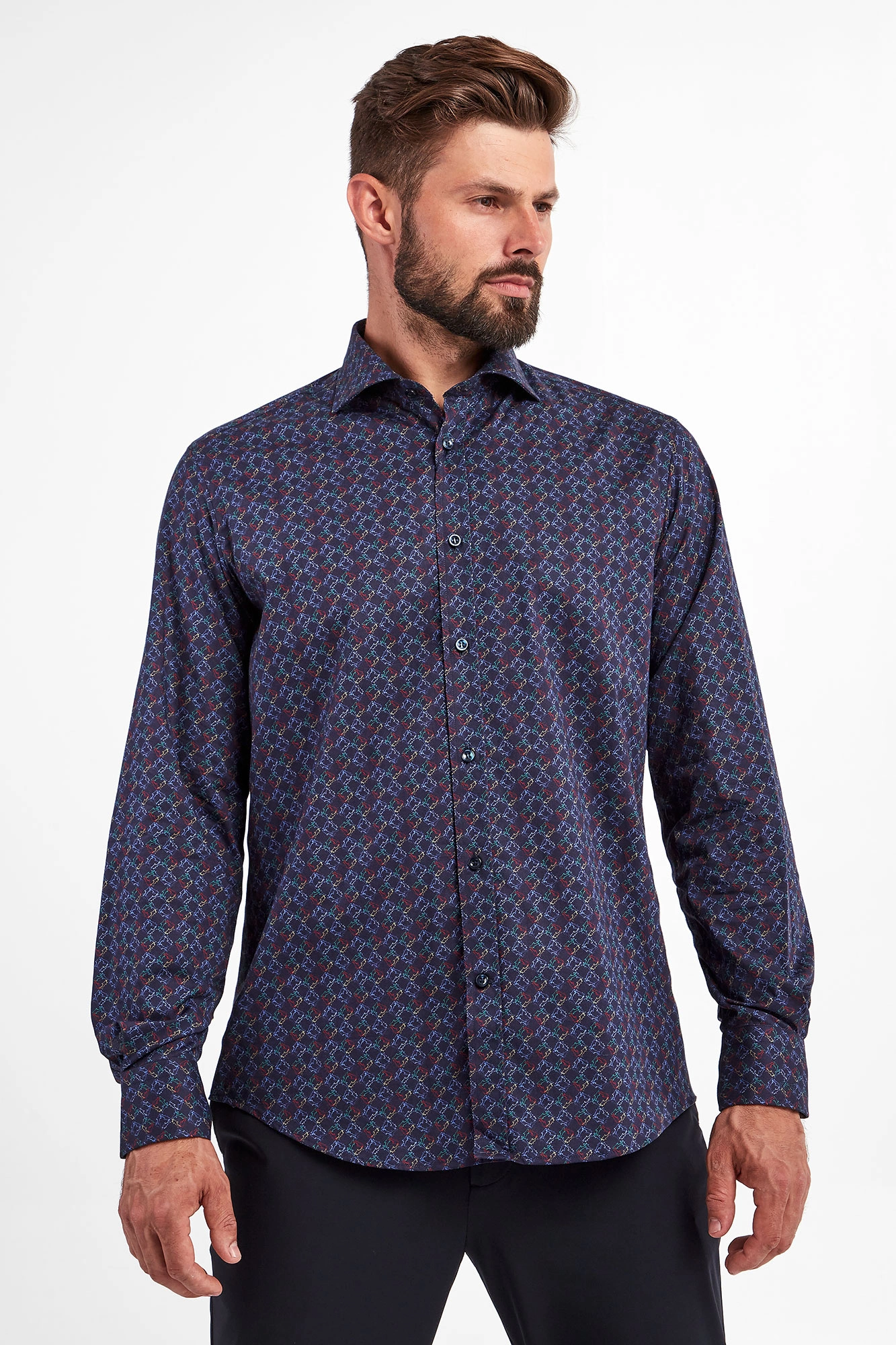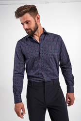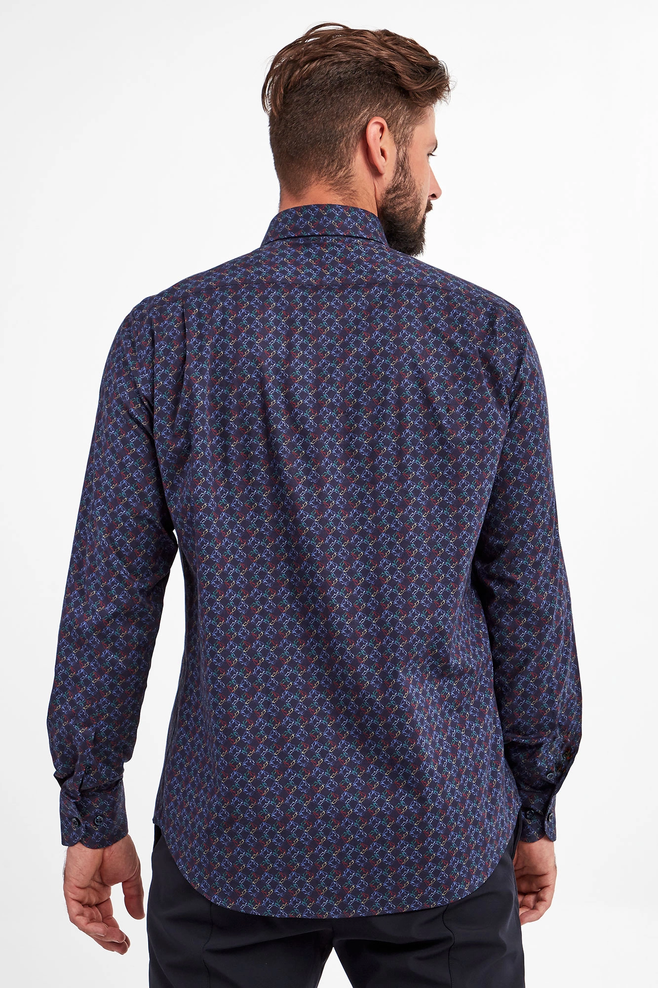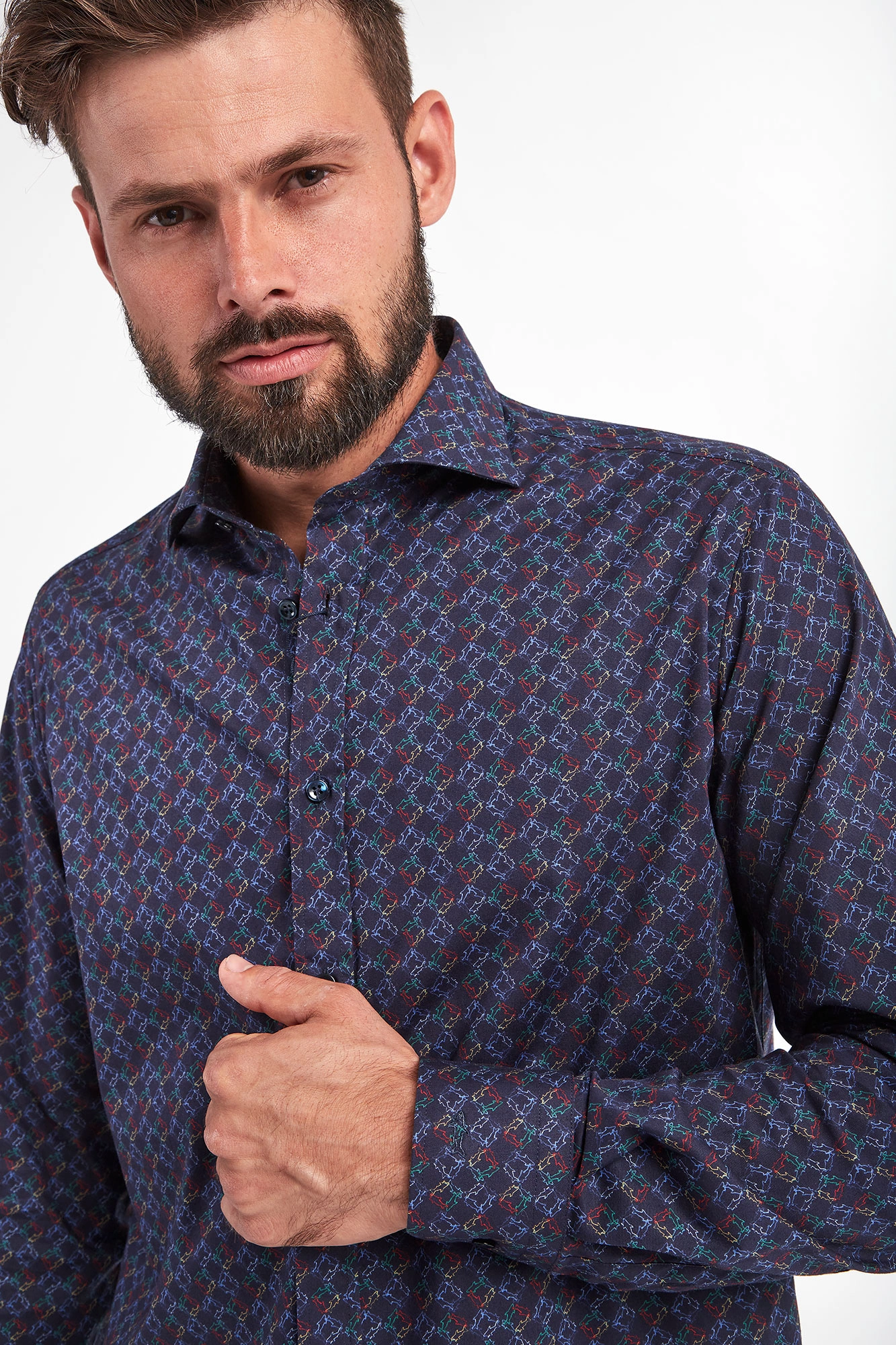 Koszula marki Paul&Shark w granatowym kolorze. Na całości wielokolorowy nadruk w postaci logo marki. Dekolt wykończony klasycznym kołnierzem. Zapinana za pomocą guzików. Długie rękawy zakończone mankietami zapinanymi za pomocą guzików. Fason typu slim fit. Wykonana z elastycznej bawełny.