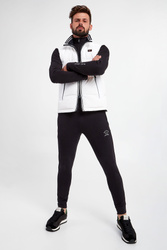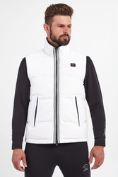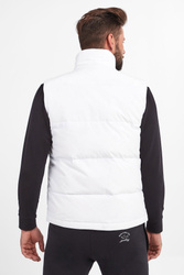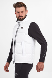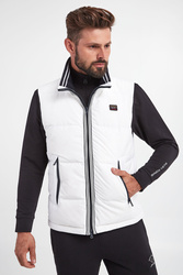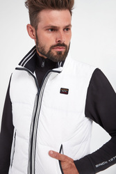 Pikowana kamizelka marki Paul&Shark w kolorze złamanej bieli. Ze stójką. Zapinana za pomocą dwukierunkowego zamka błyskawicznego wykończonego dwukolorowym lampasem. Model z dwoma kieszeniami zapinanymi za pomocą zamka. Z przodu naszywka z logo i nazwą marki. Dół regulowany za pomocą elastycznych troczków ze stoperem. Fason typu regular fit. Wypełniona naturalnym pierzem.
