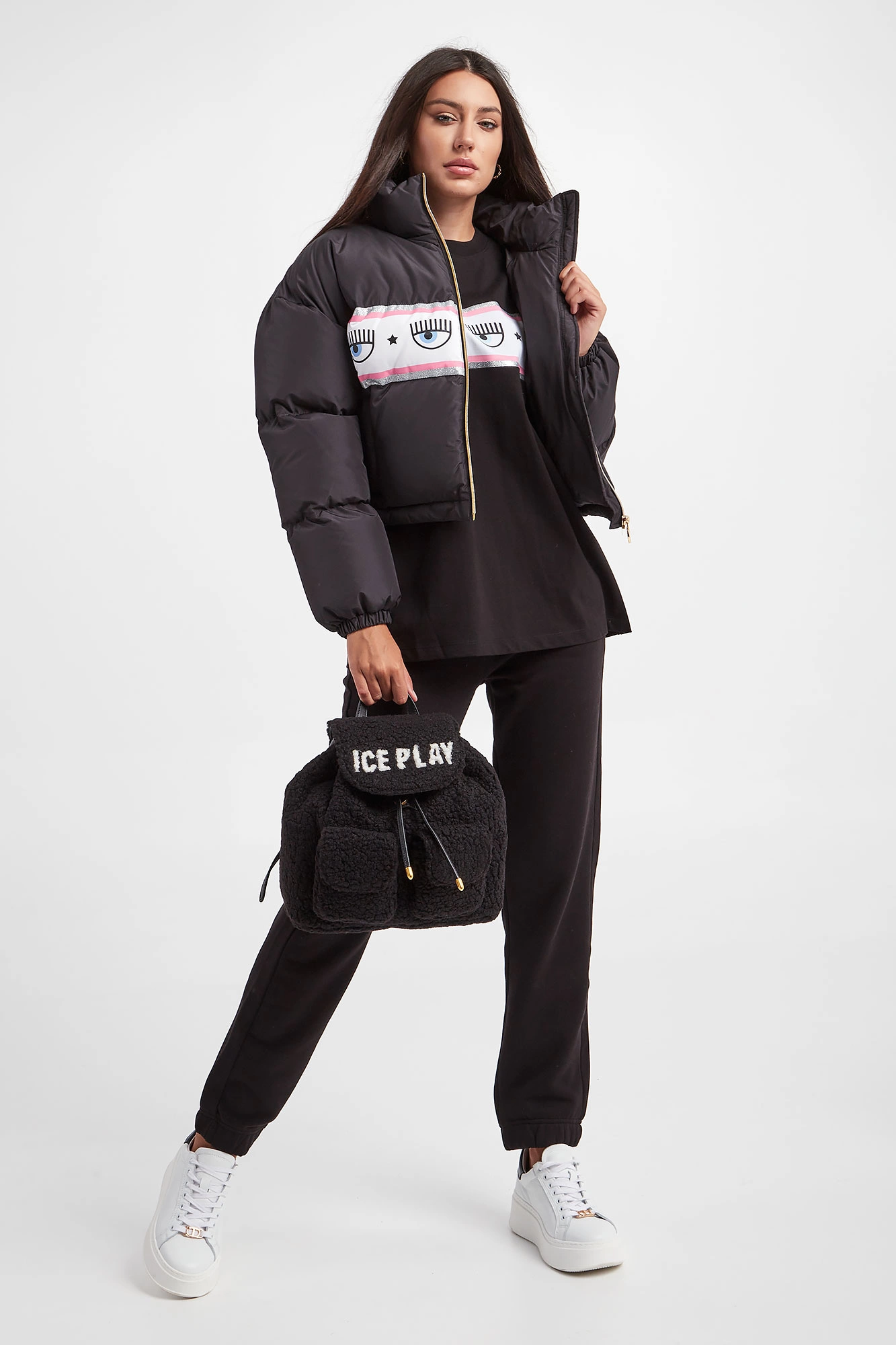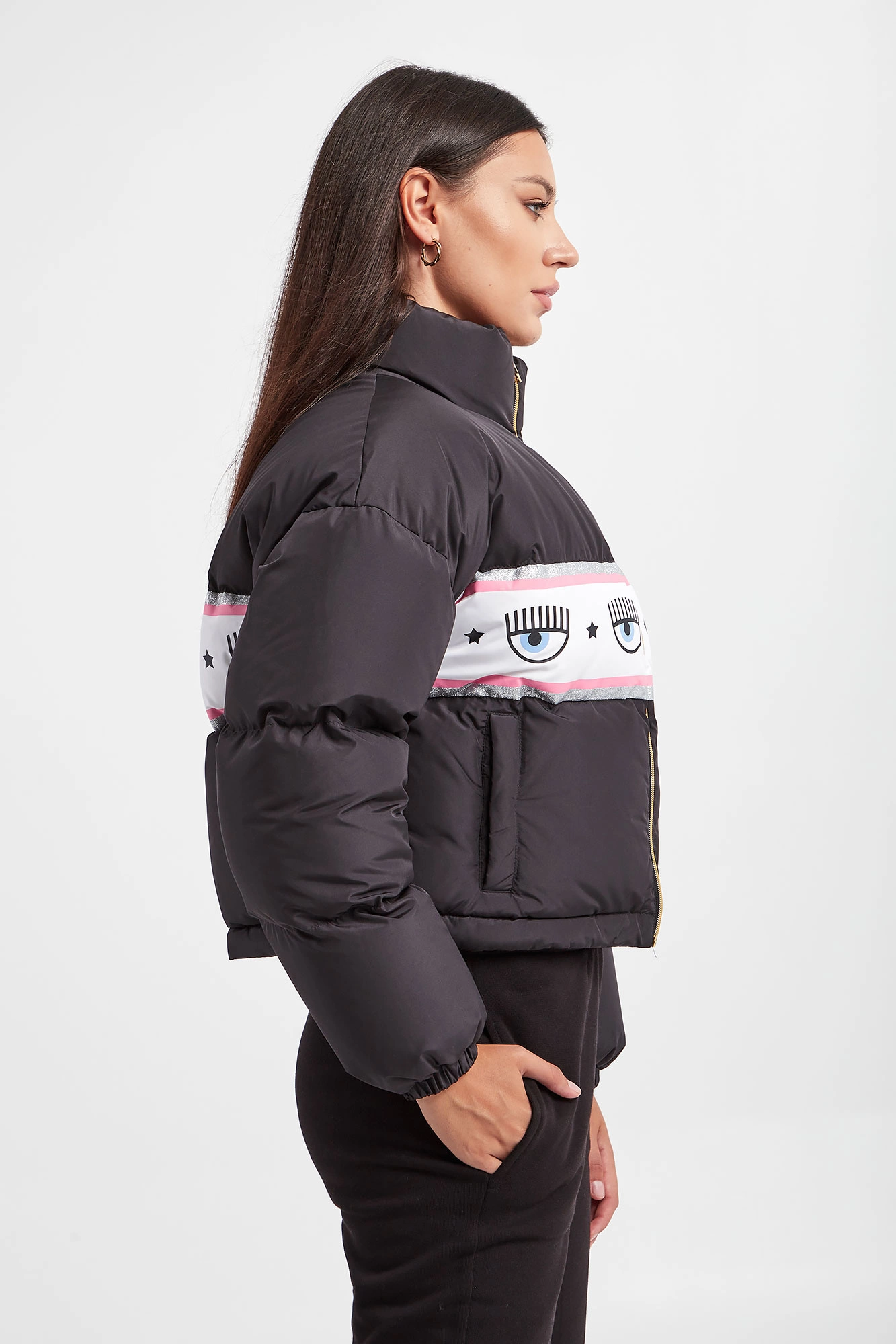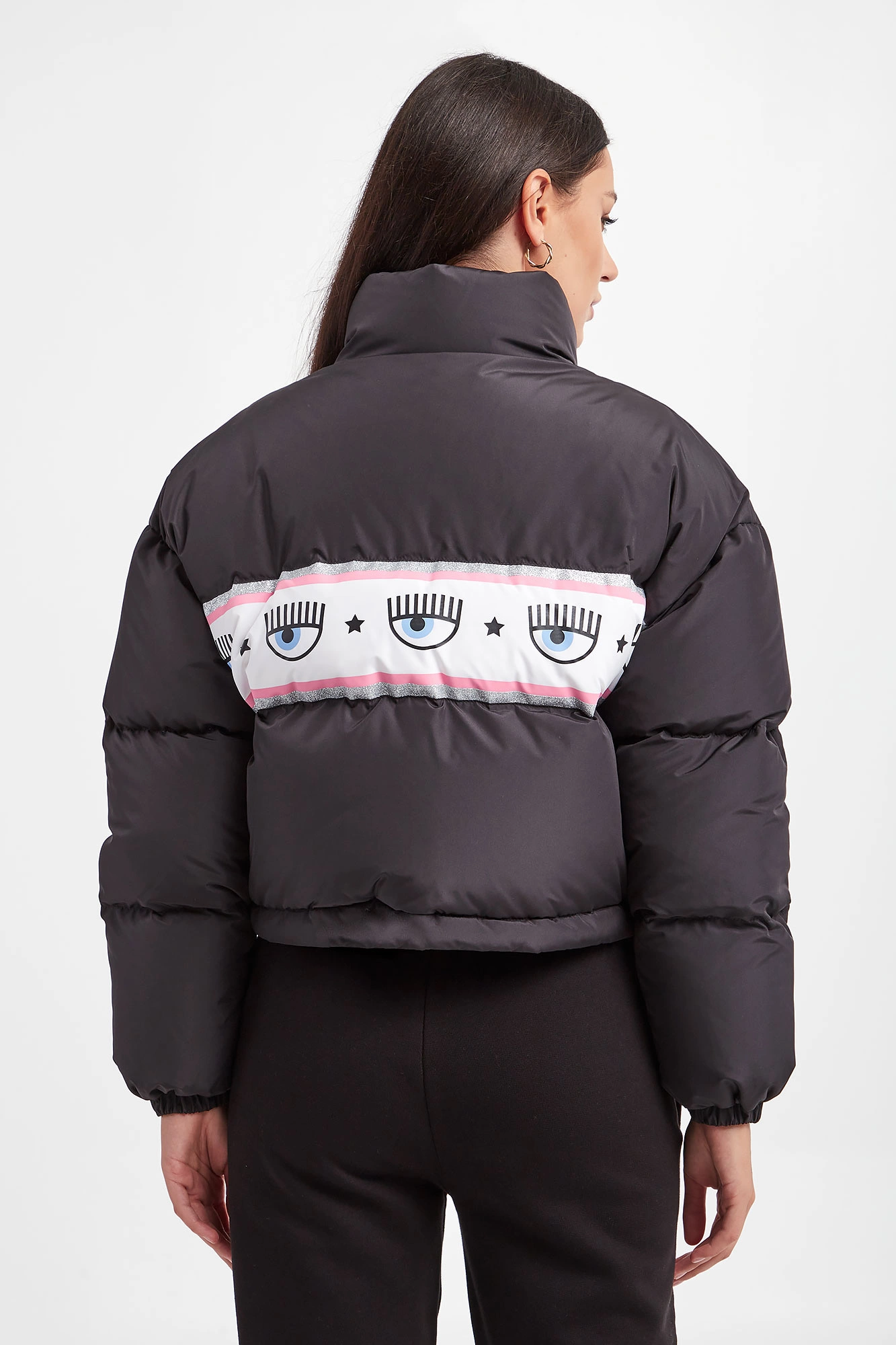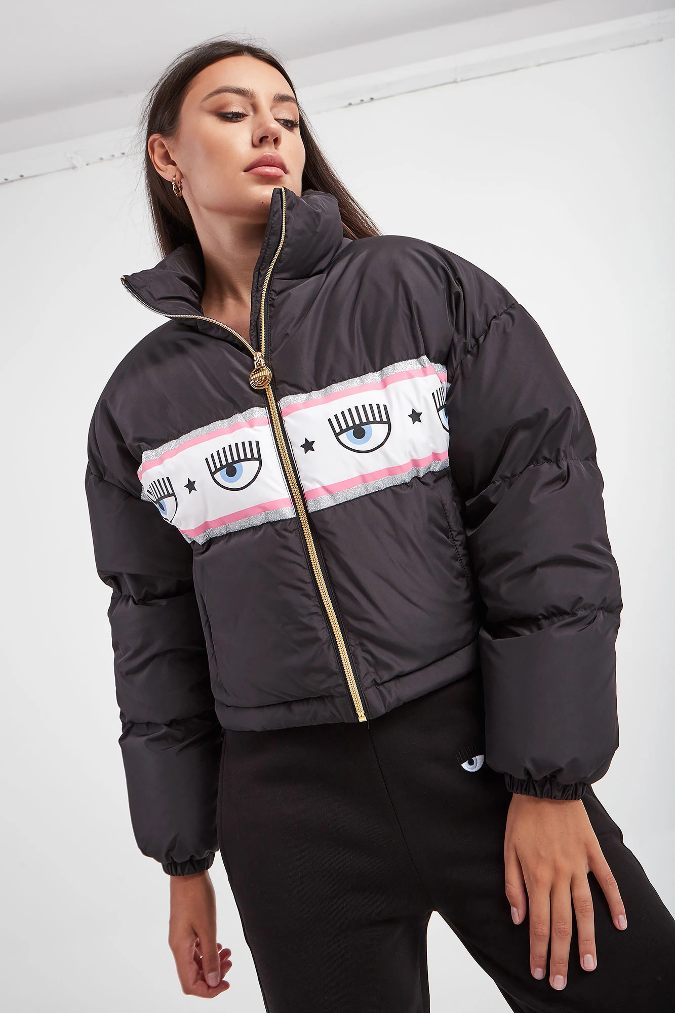 Kurtka ze stójką marki Chiara Ferragni w kolorze czarnym. Fason typu cropped. Na całości poziome pikowania. Na froncie i plecach kontrastujący nadruk z, charakterystycznymi dla marki, oczkami. Zapinana na złoty zamek z logowaną zawieszką. Z przodu dwie kieszenie zapinane na napy. Kurtka wypełniona niezwykle lekkim puchem edredonowym.