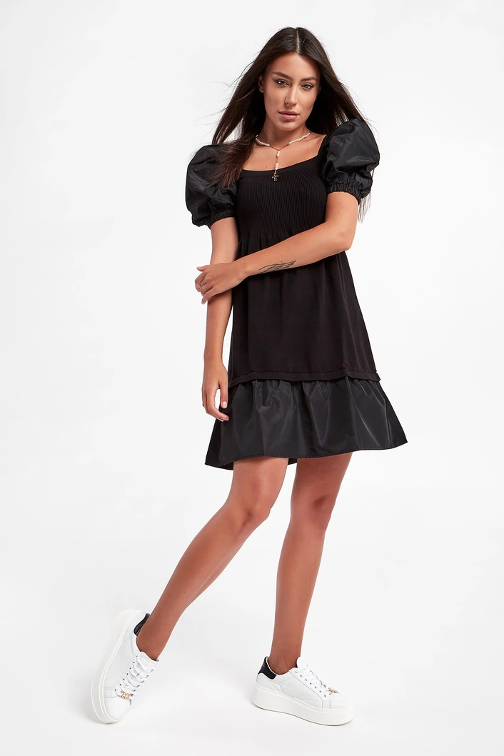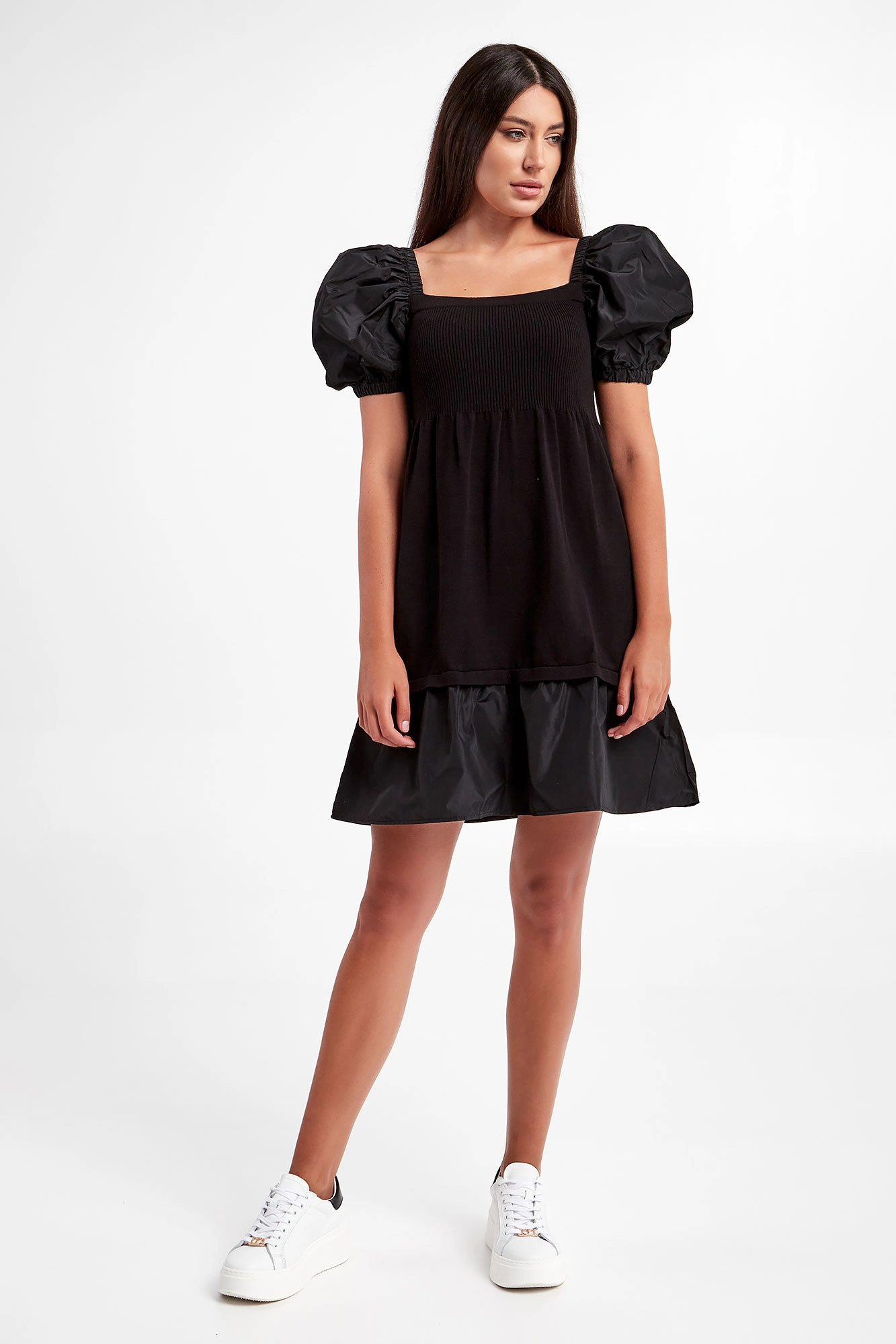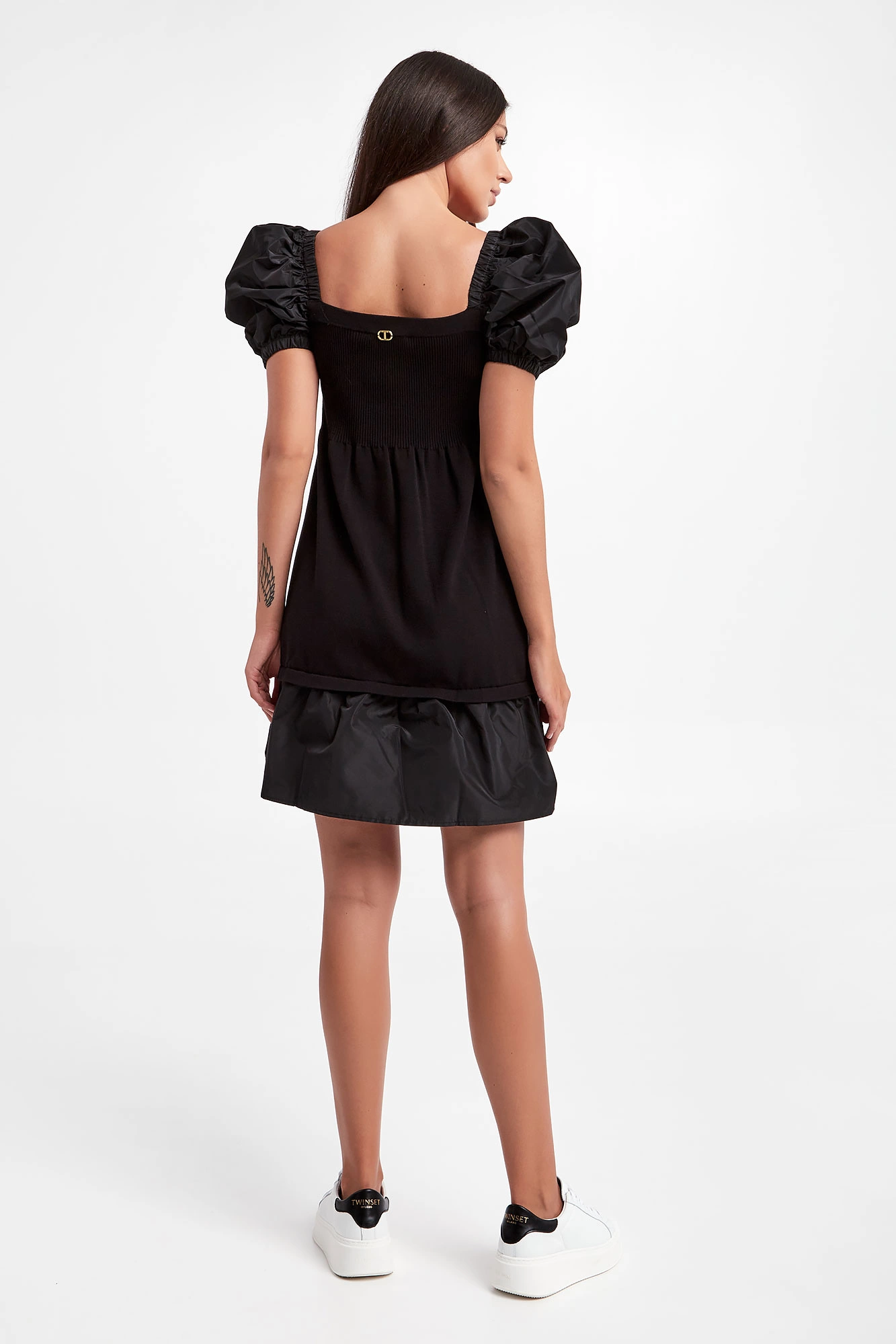 Sukienka marki Twinset w czarnym kolorze. Kwadratowy dekolt. Góra wykonana z prążkowanego ściągacza. Krótkie, bufiaste rękawy i dół wykonane z syntetycznej, kontrastującej tkaniny. Przy rękawach ściągacze. Z tyłu zawieszka z monogramem marki. Fason slim fit, długość mini. Wykonana z elastycznej, wiskozowej tkaniny.