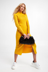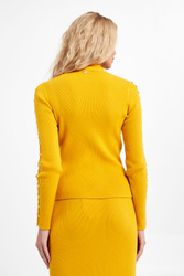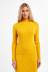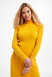 Golf marki Twinset U&B w żółtym kolorze. Na całości prążki. Długie, proste rękawy ozdobione perełkami i połyskującymi kryształkami. Na linii karku sygnowana, złota zawieszka. Wykończony na surowo. Przylegający fason typu slim fit. Wykonany z elastycznej wiskozy.
