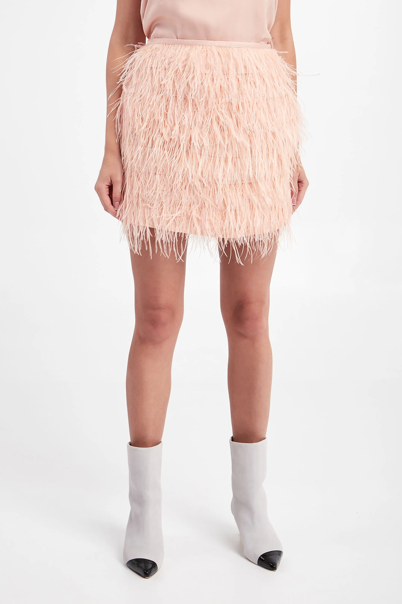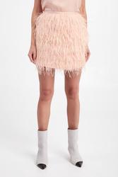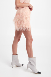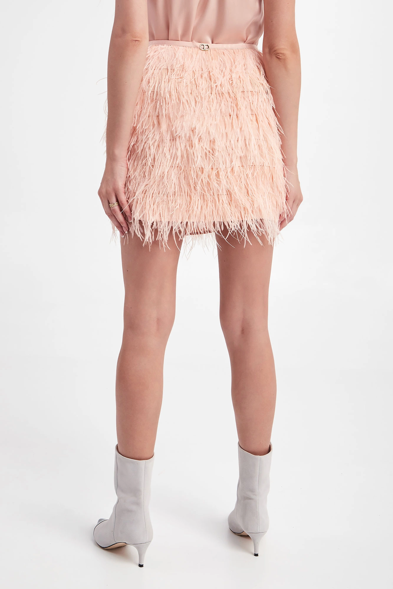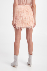Spódnica marki Twinset w kolorze pudrowego różu. Na całości ozdobne pióra w kolorze spódnicy. Zapinana z boku za pomocą guzików. Z tyłu złota, metalowa zawieszka w kształcie monogramu. Fason slim fit, długość mini. Wykonana z czystej wiskozy.