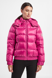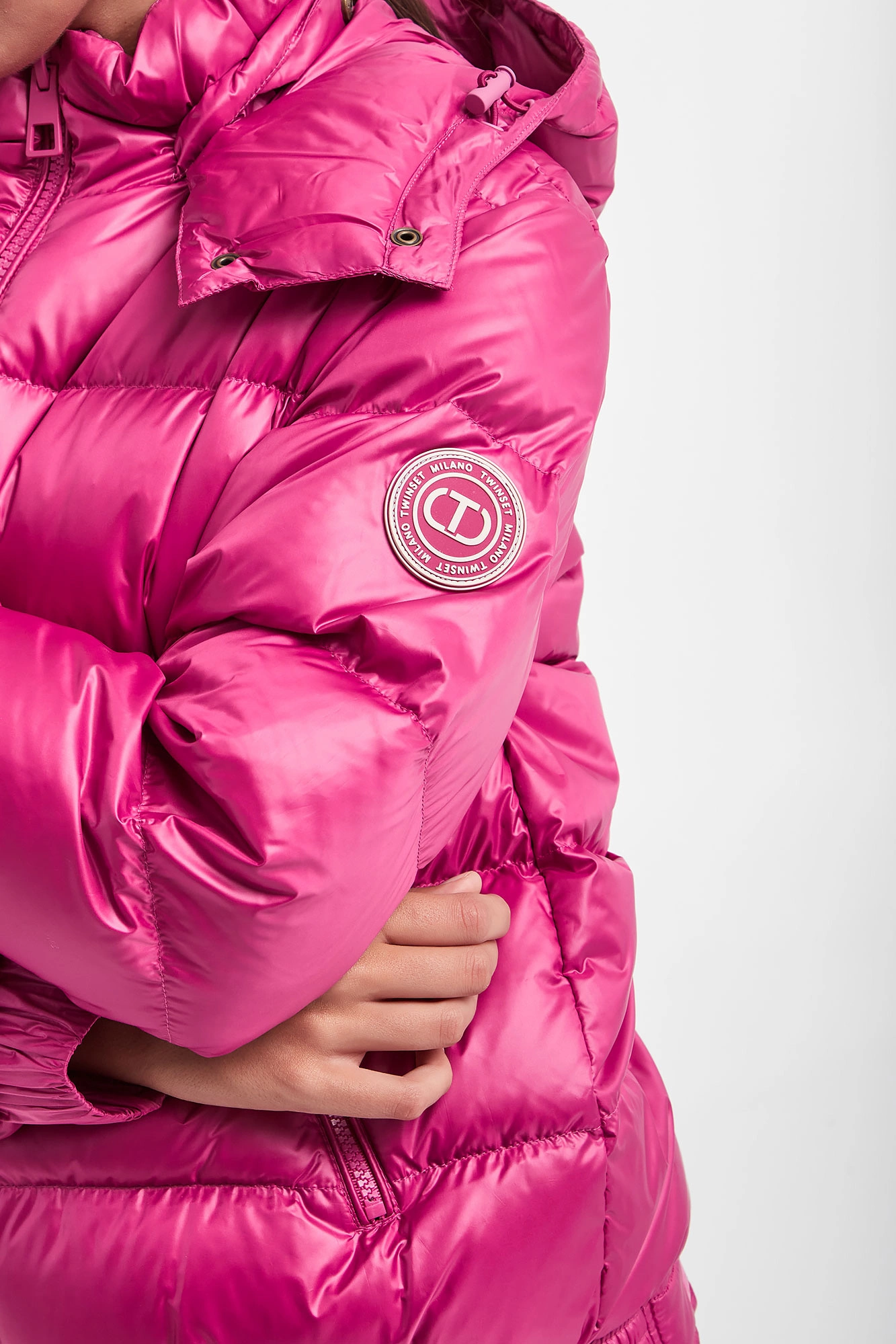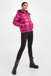 Pikowana kurtka z kapturem marki Twinset w kolorze fuksjowym. Zapinana na zamek. Dwie boczne, zamykane kieszenie. Rękawy zakończone zapinanymi mankietami. Na lewym sygnowana, gumowana zawieszka. Kaptur zapinany za pomocą logowanych nap. U dołu ściągacz. Fason regular fit. Lekka i komfortowa.