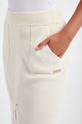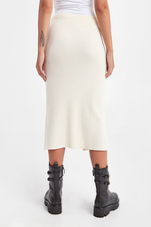 Dzianinowa spódnica marki Twinset U&B w kolorze ecru. Na całości prążki. Fason slim fit, długość midi. W pasie ściągacz. Z boku sygnowana, złota naszywka. Dwie boczne, naszywane kieszenie. Na środku rozcięcie. Wykonana z elastycznej, wiskozowej tkaniny.