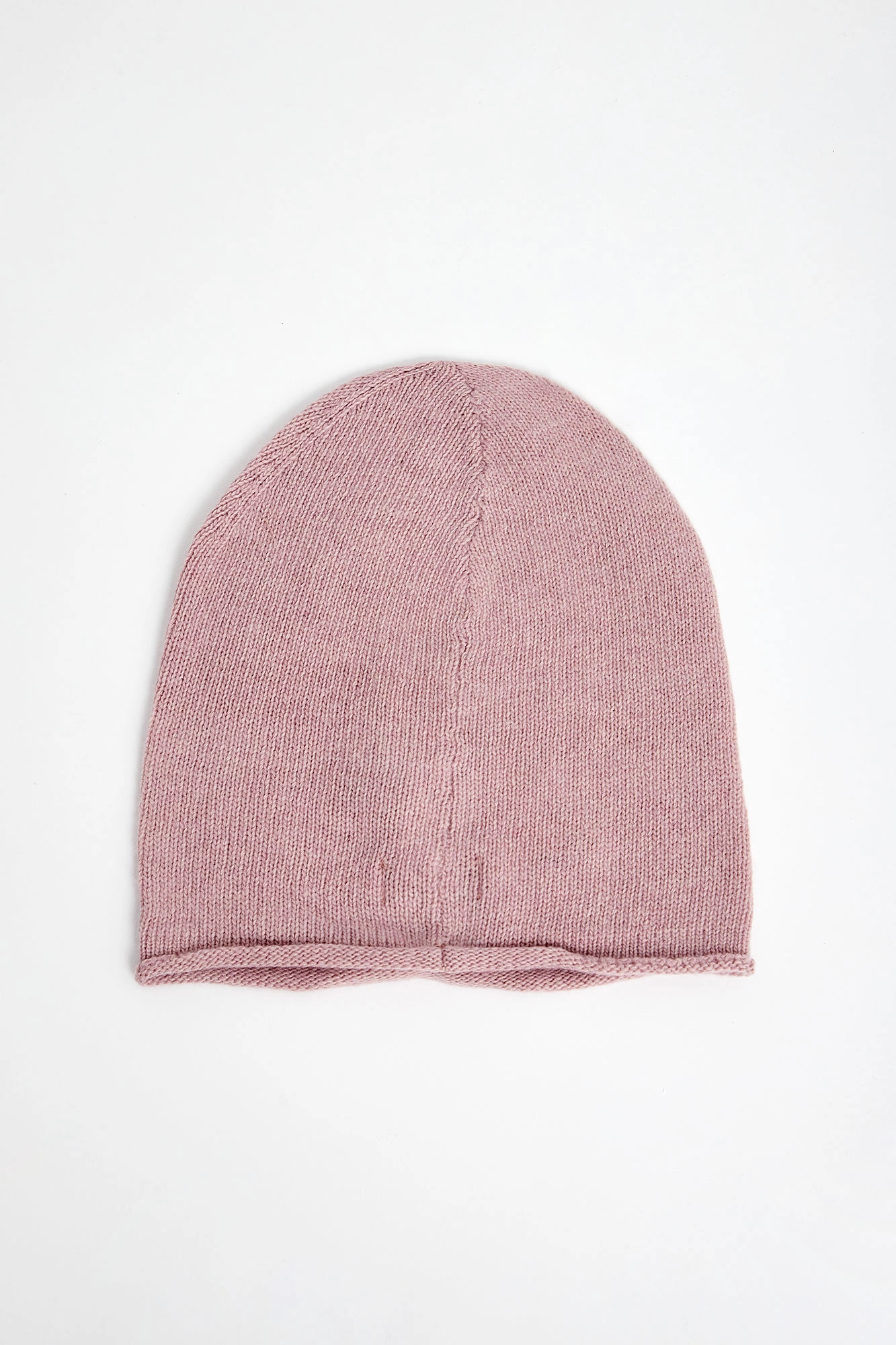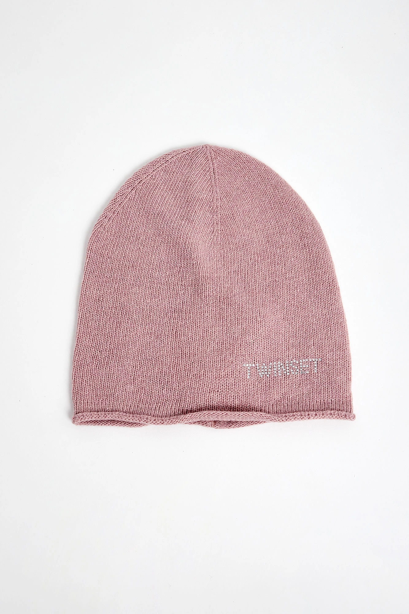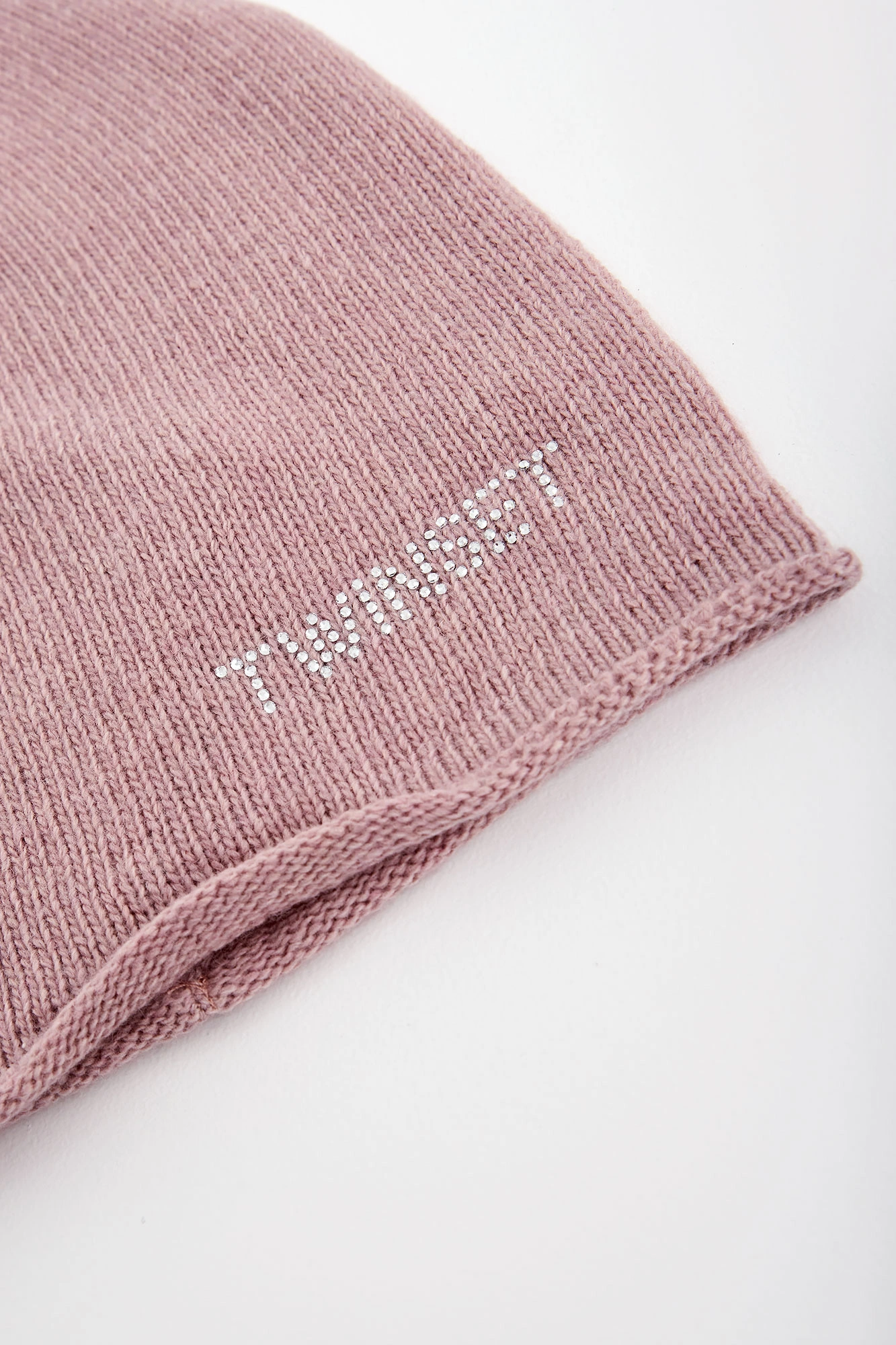 Kaszmirowa czapka marki Twinset w kolorze brudnego różu. Z przodu nazwa marki wykonana z cyrkonii w srebrnym kolorze. Całość pleciona. Wykonana z elastycznej mieszanki kaszmiru i wełny.