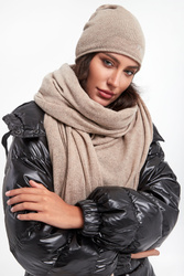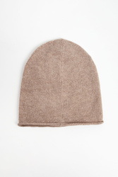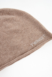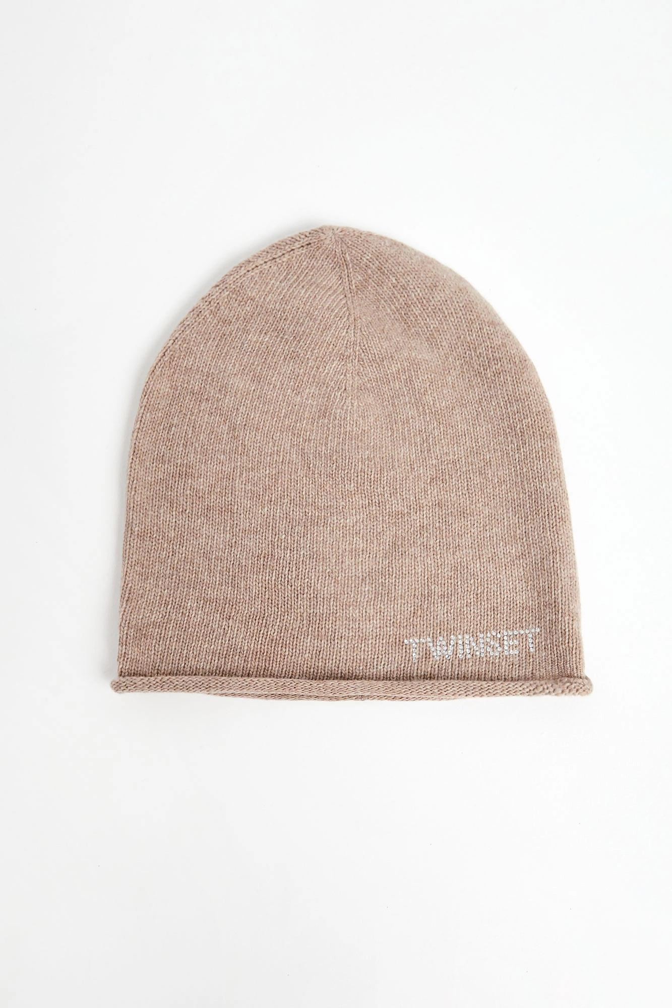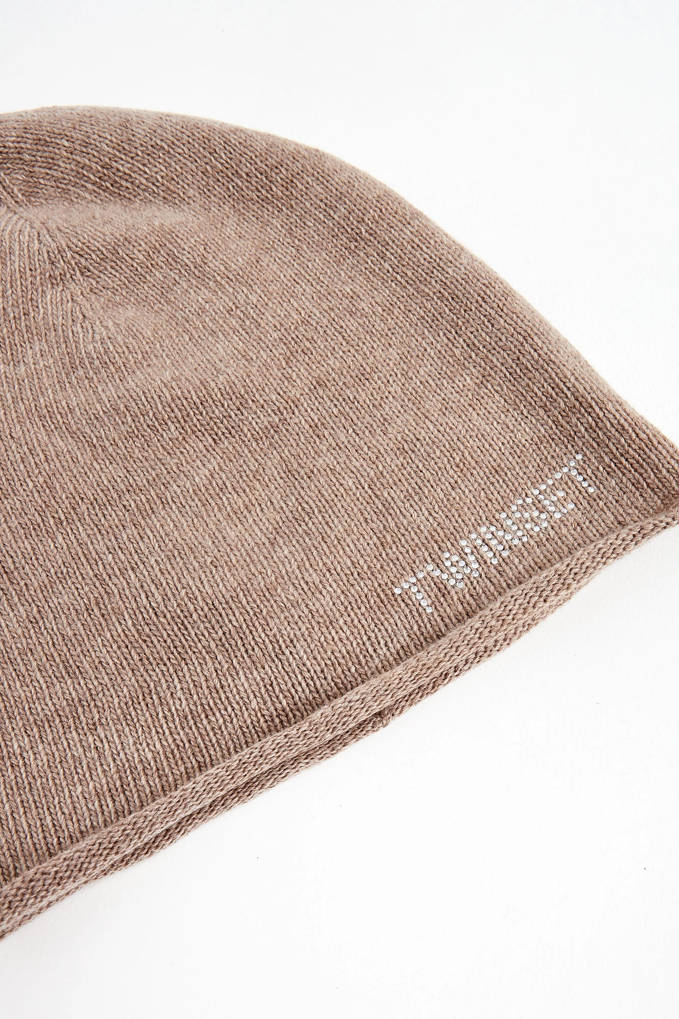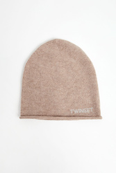 Czapka marki Twinset w beżowym kolorze. Na całości drobny splot. Na froncie aplikacja z kryształków w postaci nazwy marki. W składzie posiada włókna wełny i kaszmiru.