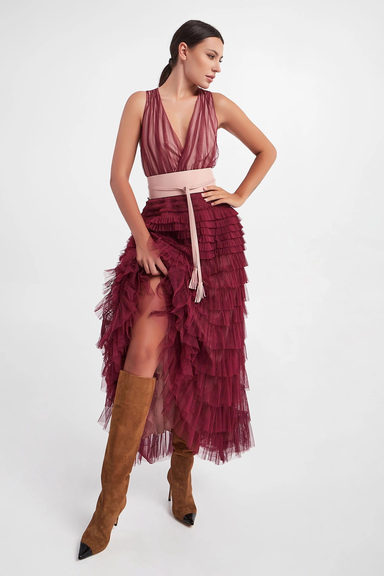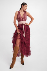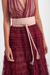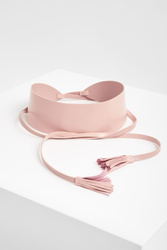 Skórzany pasek na talię marki Twinset w kolorze pudrowego różu. Wiązany za pomocą troczków zakończonych chwostami w kolorze paska. U dołu tłoczony, sygnowany.