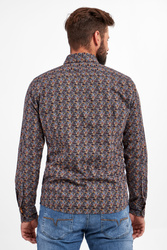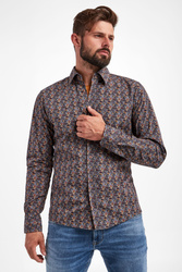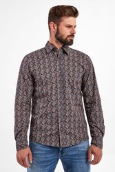 Koszula marki Joop! Jeans. W zielonym kolorze o prostym fasonie. Model z serii Joop! Sustainably Sexy, która wspiera pozyskiwanie surowców zgodnie zasadą zrównoważonego rozwoju. Na całości wielokolorowy wzór. Zapinana na granatowe, sygnowane guziki. Kołnierzyk typu botton down. Rękawy wykończone ściętym mankietem zapinanym na jeden guzik. Wykonana z tkaniny bawełnianej z dodatkiem elastanu.