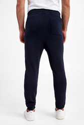 Dzianinowe spodnie dresowe marki Joop! Jeans w granatowym kolorze. Fason typu jogger. W pasie ściągacz regulowany za pomocą sygnowanych troczków. Z boku naszywka z logo. Model z trzema wpuszczanymi kieszeniami. Nogawki zakończone ściągaczami. Wykonane z elastycznej, wiskozowej tkaniny.