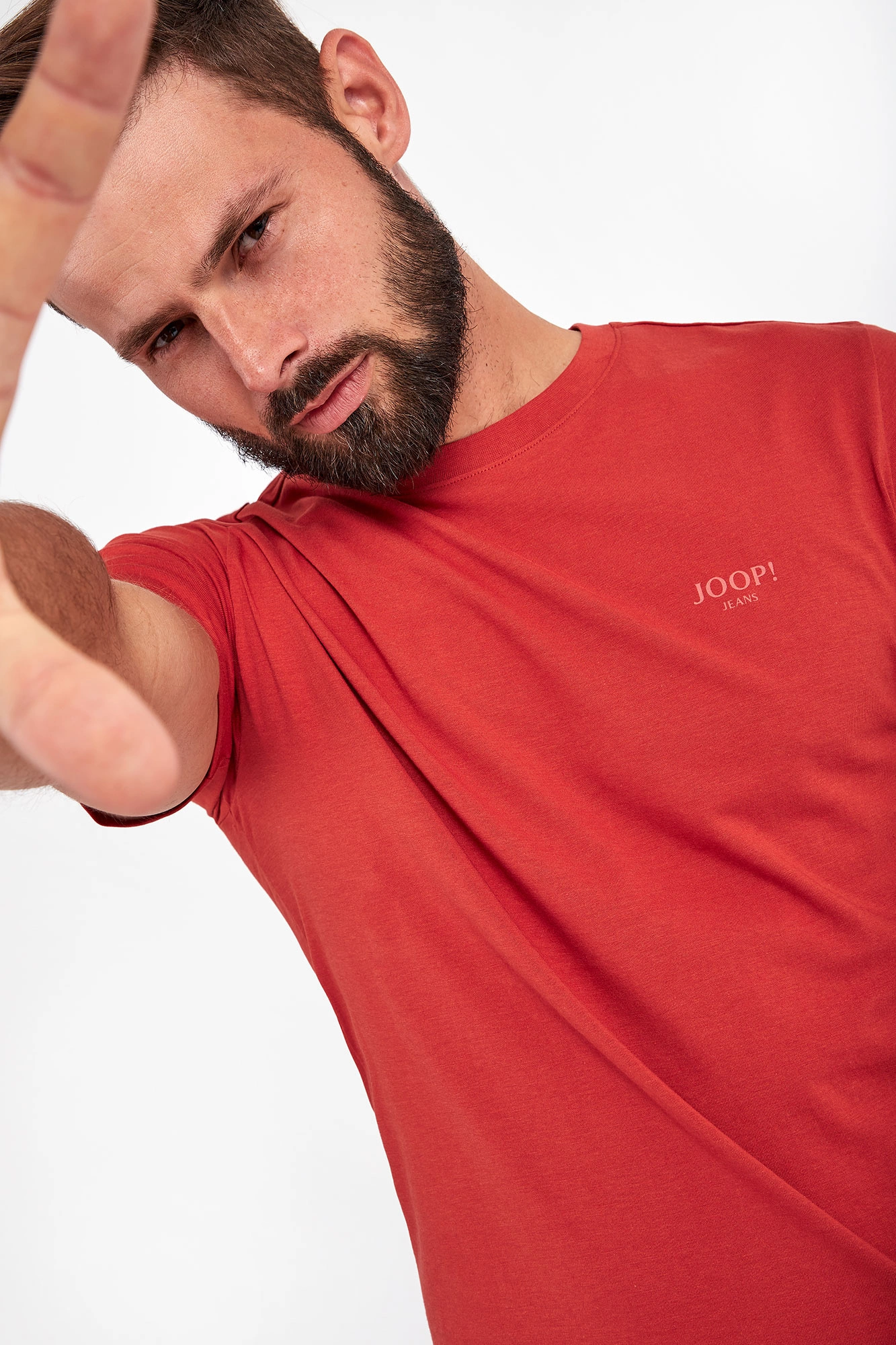 T-shirt marki Joop! Jeans w czerwonym kolorze. Model z serii Joop! Sustainably Sexy, która wspiera pozyskiwanie surowców zgodnie zasadą zrównoważonego rozwoju. Po lewej stronie nadruk w postaci nazwy marki w kontrastowym kolorze. Dekolt typu o-neck wykończony ściągaczem. Krótkie rękawki i dół zakończone lamówką. Fason typu regular fit. W całości wykonany z tkaniny bawełnianej.