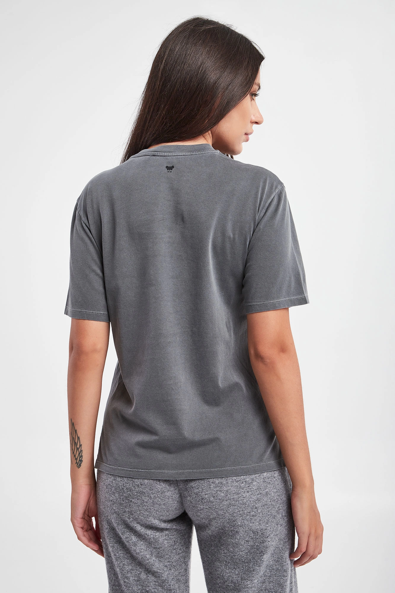 T-shirt marki Max Mara w kolorze szarym. Fason typu regular fit. Na froncie nadruk z logo marki. Dekolt o-neck zakończony ściągaczem prążkowanym. Krótkie rękawy i dół wykończone lamówką. U dołu delikatne rozcięcia. Z tyłu, na linii karku nadruk z logo marki.