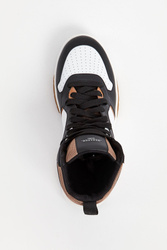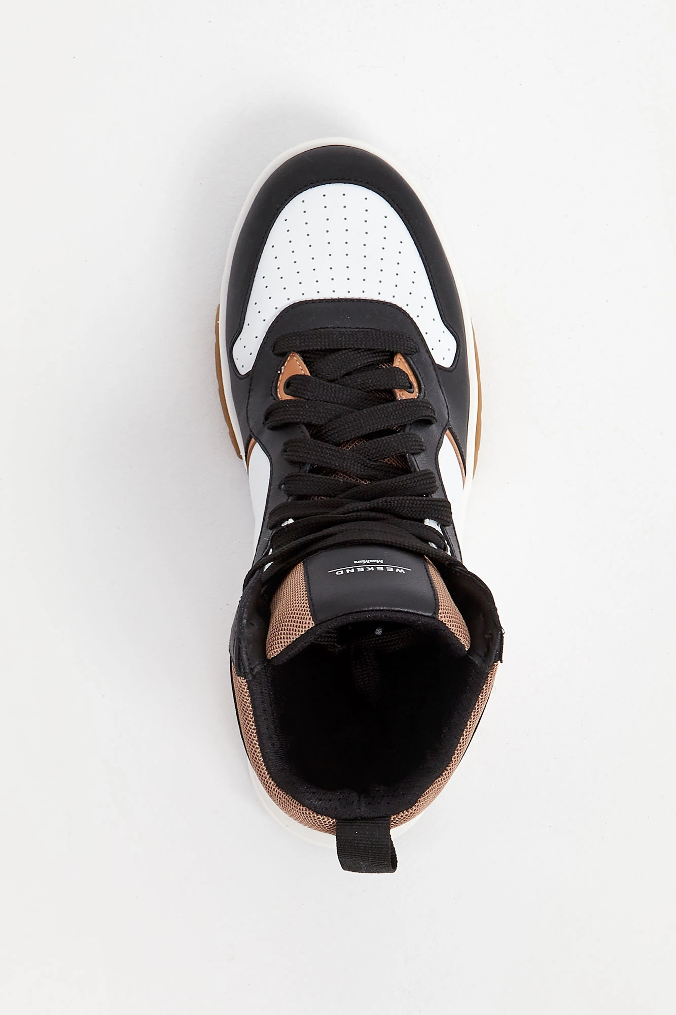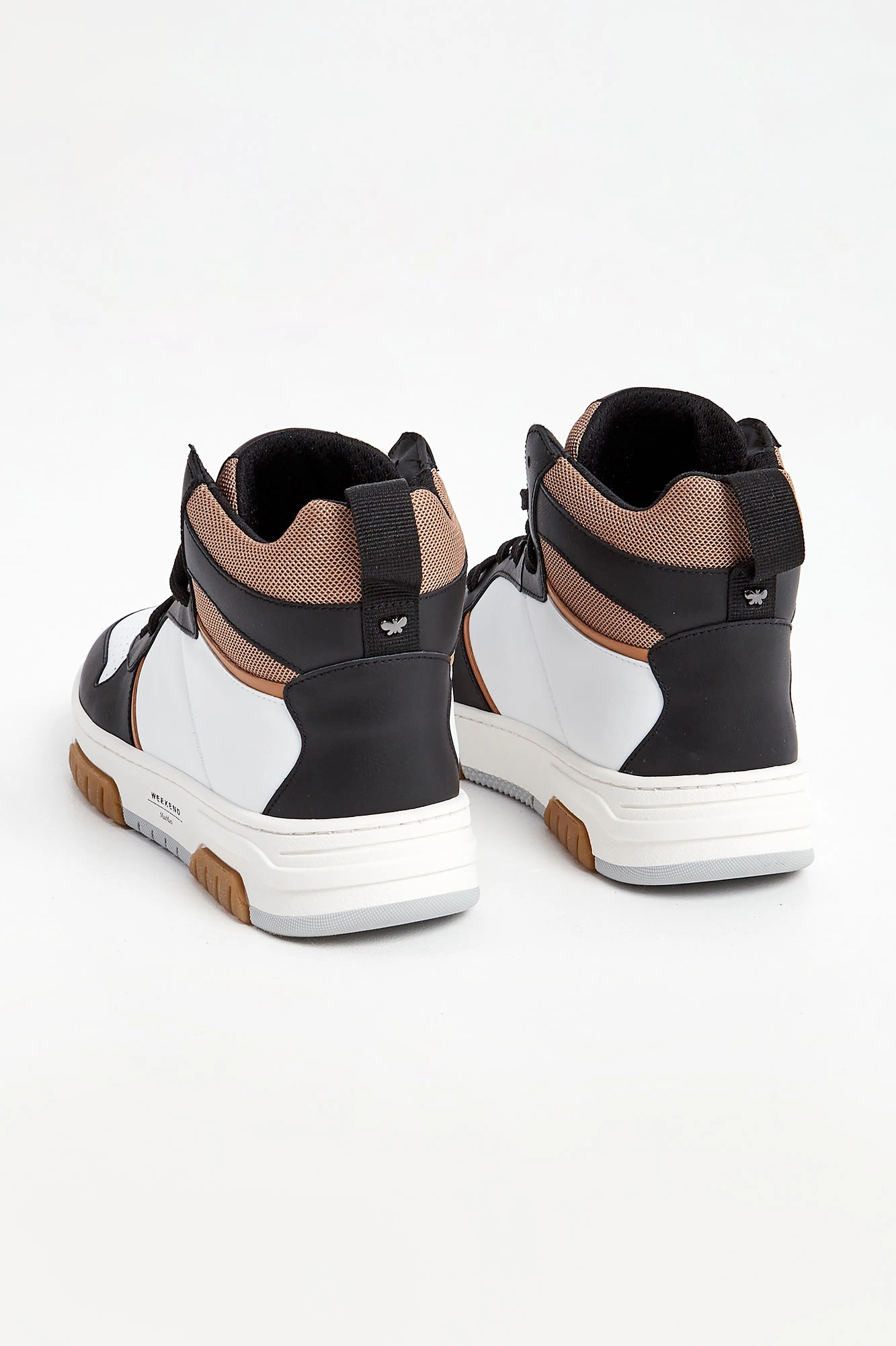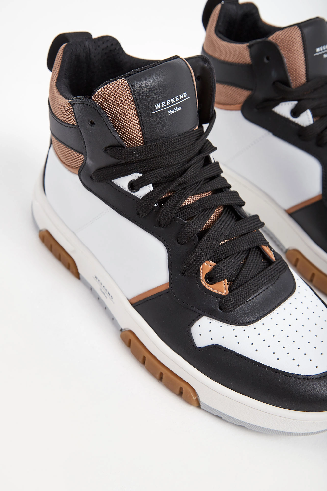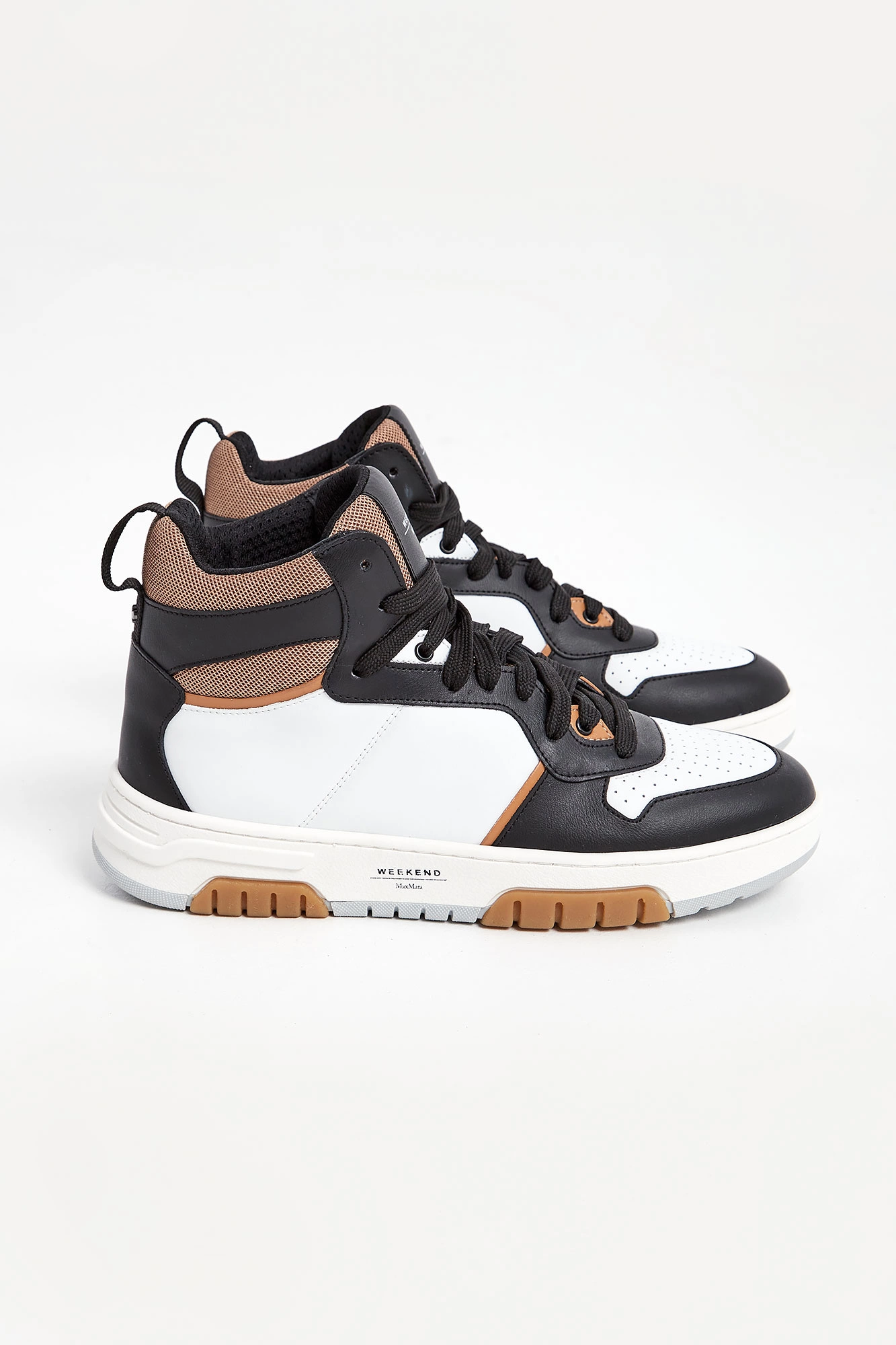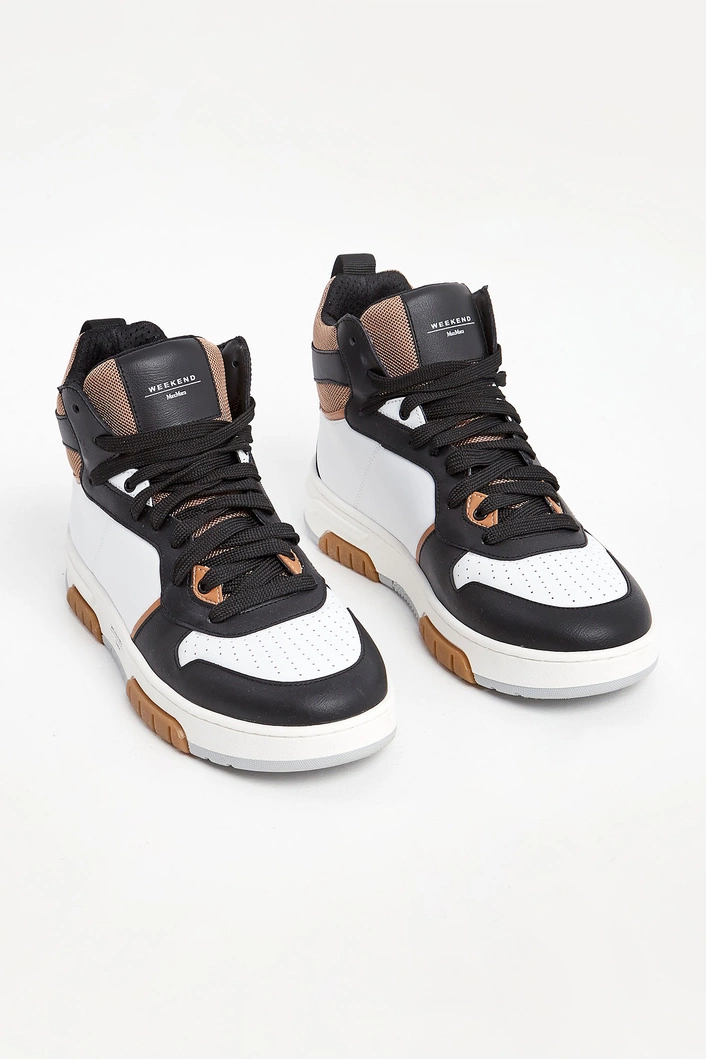 Sneakersy marki Weekend Max Mara czarno-białym kolorze. Wyższa cholewka. Wiązane za pomocą sznurówek w czarnym kolorze. Na języku naszywka w czarnym z kolorze z nadrukiem nazwy marki. Z tyłu pętelka ułatwiająca zakładanie i metalowa aplikacja w kształcie logo marki. Skórzana wyściółka z tłoczonym logo i nazwą marki. Wielokolorowa, sygnowana podeszwa.
